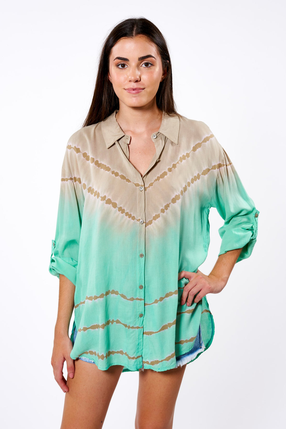 Selbst entworfenes Batik-Shirt. Hemdkragen, Knopfverschluss in der vorderen Mitte und etwas längerer Rücken und Öffnung...