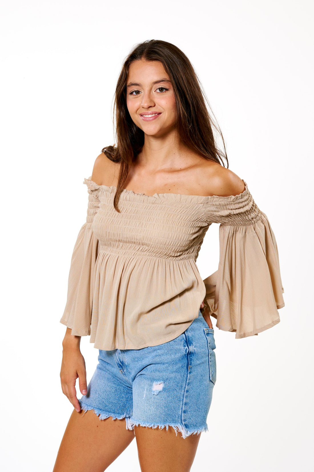 Das Grana-Top hat einen wunderschönen Bardot-Ausschnitt, der die Schultern betont, indem er sie frei lässt....