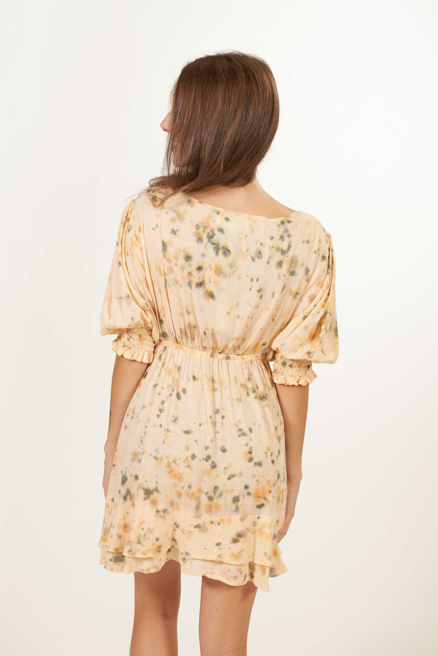 Short dress with very romantic touches. V-neckline finished with a central bow with cord that ends in contrasting tassels. Short puffed sleeves with elastic finish. Flared and fitted skirt at the torso line.