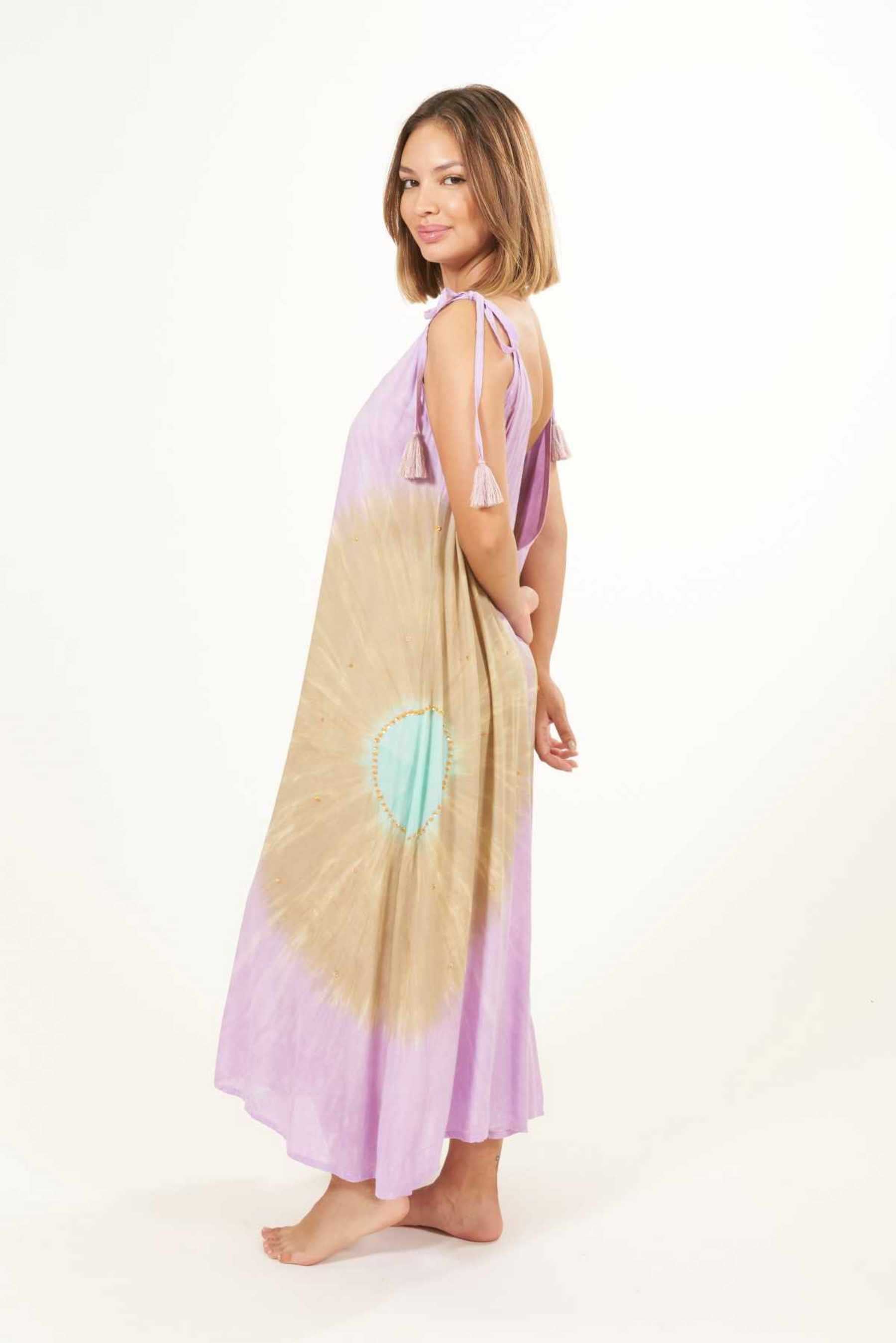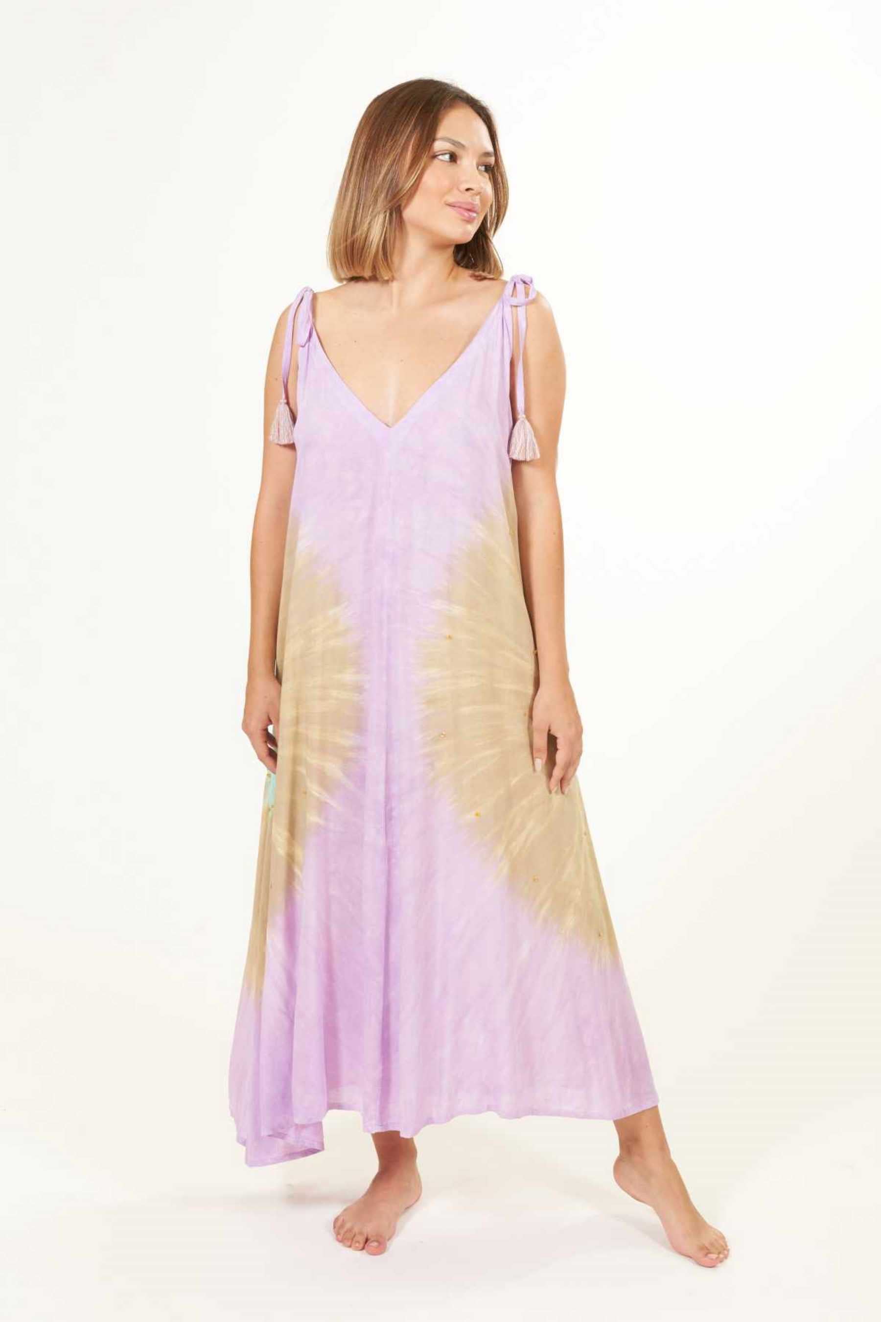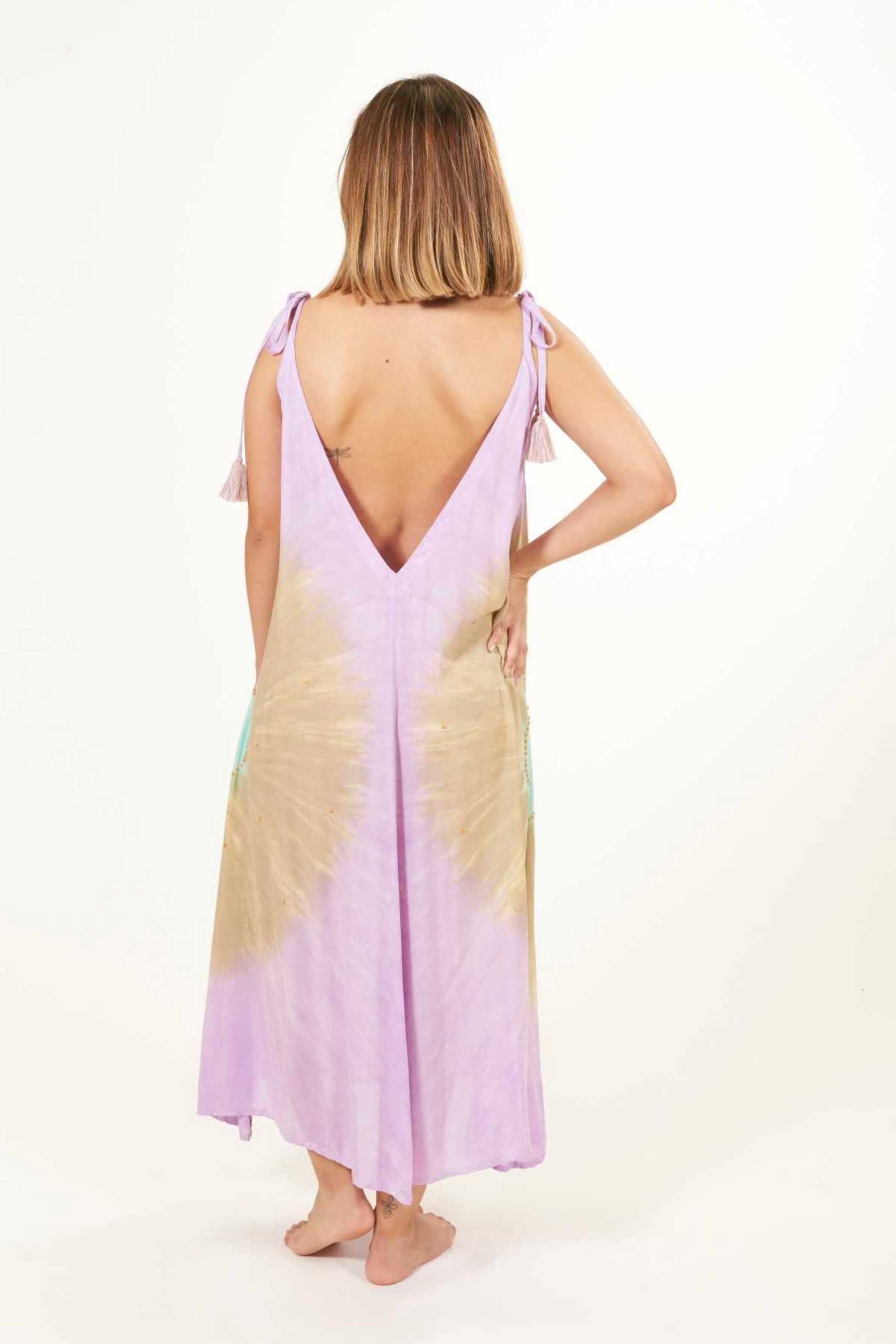 Discover the freshness of the Banten dress, perfect for sunny summer days. With a loose fit and length to the bottom, this dress offers versatility and comfort. Best of all, you can adjust the height of the neckline according to your preferences, thanks to the thin straps that tie with a bow. With a V-neckline on both the chest and the back, this design offers a sexy and elegant touch, ideal to wear on the beach or on any casual occasion. In addition, its tie dye fabric, created with artisanal techniques and natural pigments, gives it a unique and authentic style.