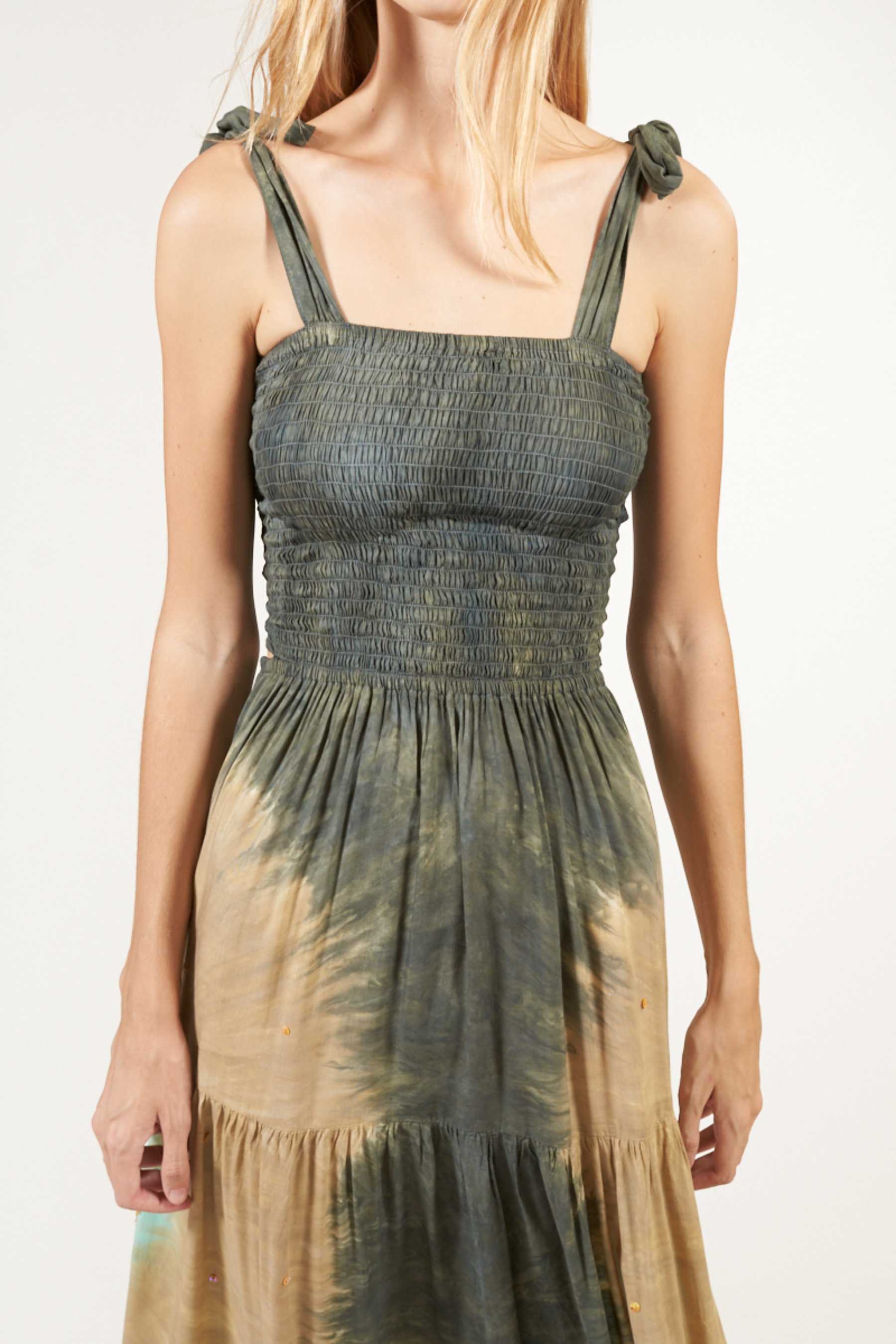 Adjustable double strap with bow. Long skirt with ruffled volume.