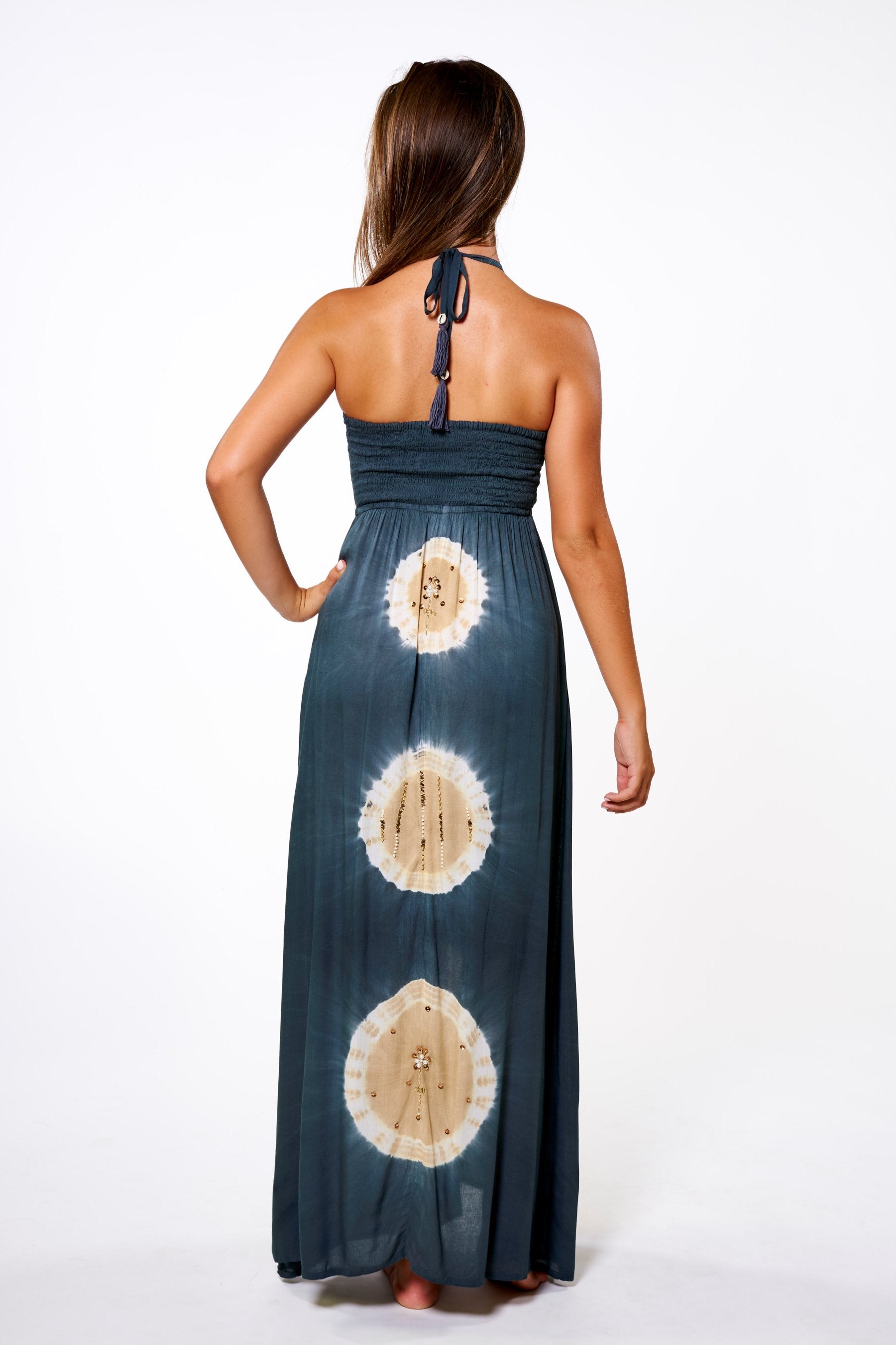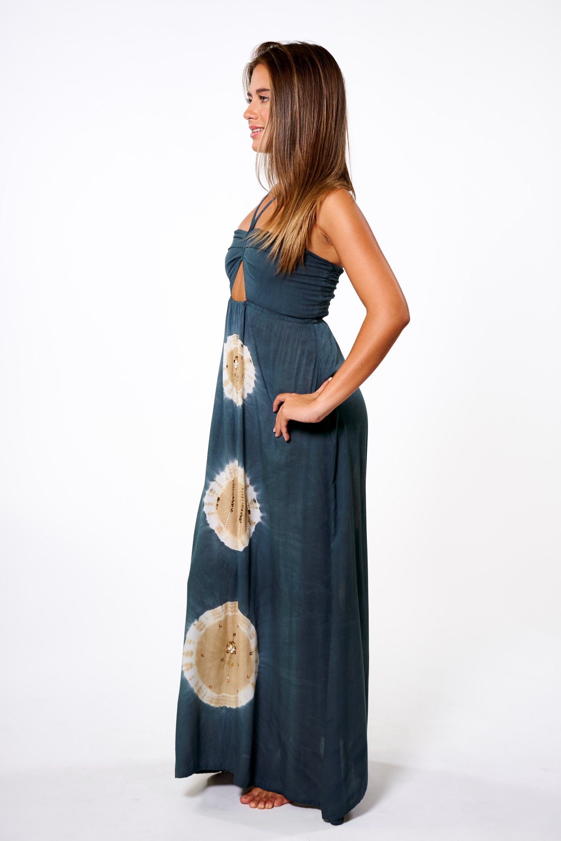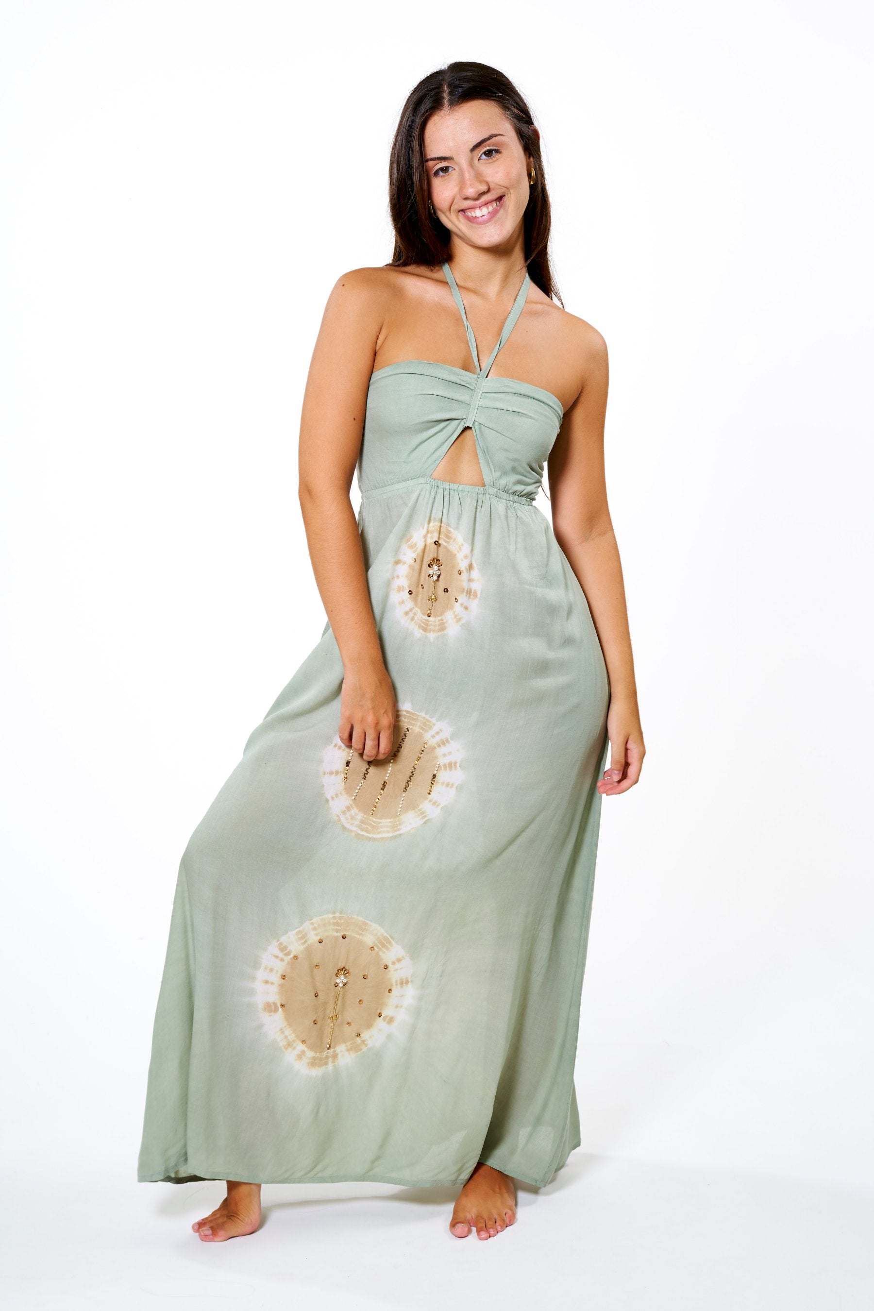 The Balibo dress is an essential option to show off with style this summer. Its floor-length design and striking underbust slit make it a one-of-a-kind piece. The halter neckline, highlighted by two straps that intersect in the center of the chest, adds a sensual and elegant touch to your summer look. In addition, its hand-dyed fabric with natural pigments guarantees an exceptional finish and an incomparable feeling of freshness.