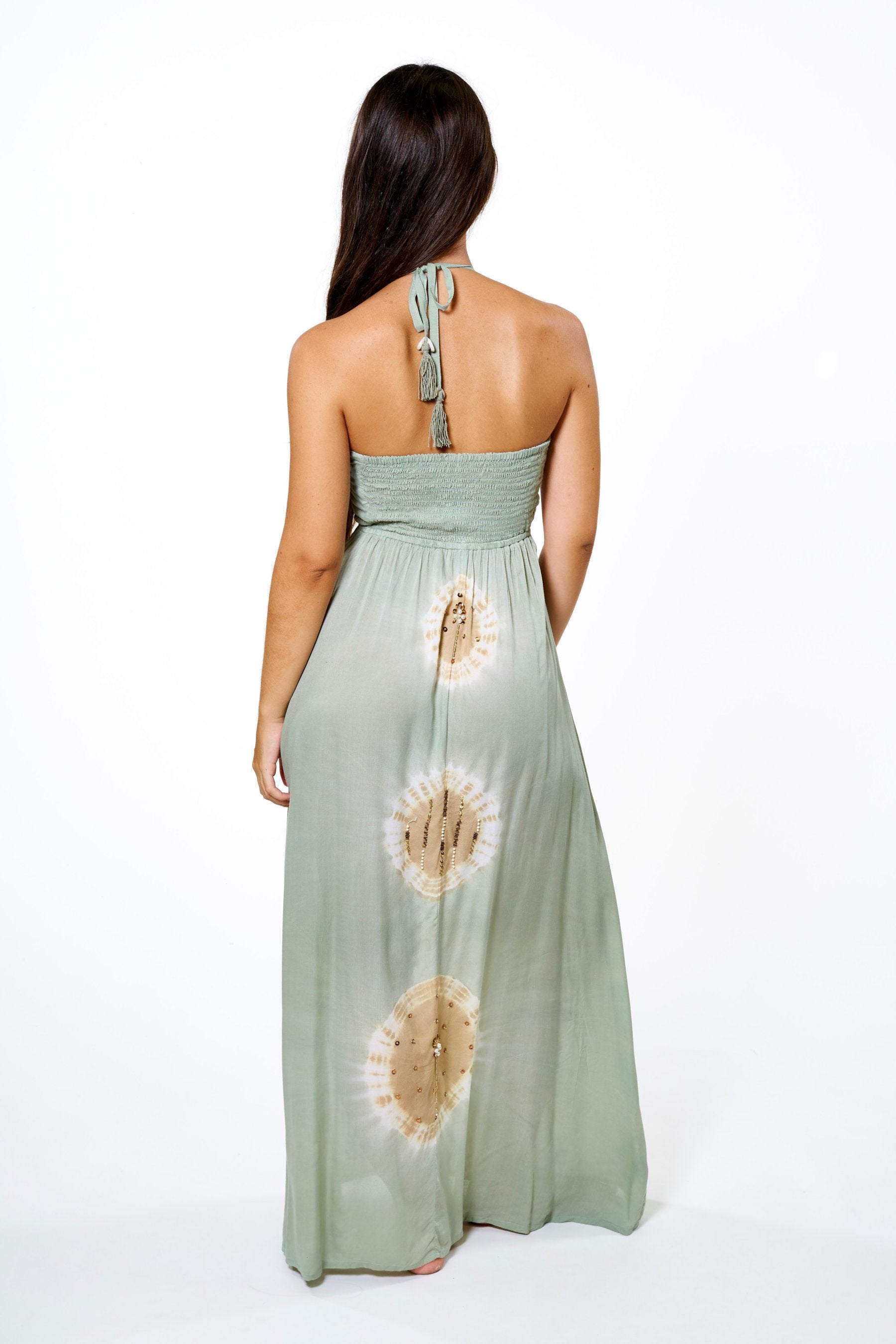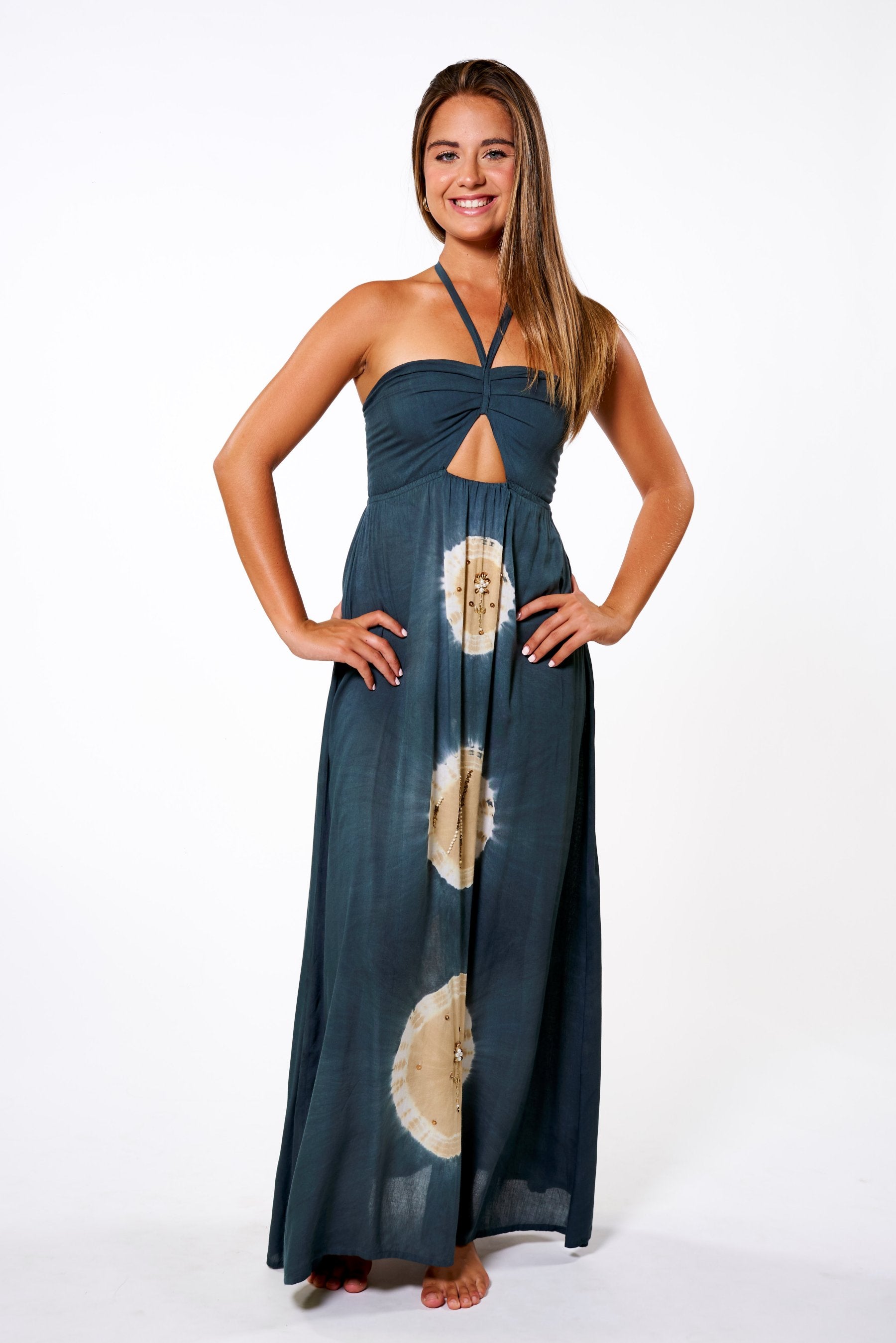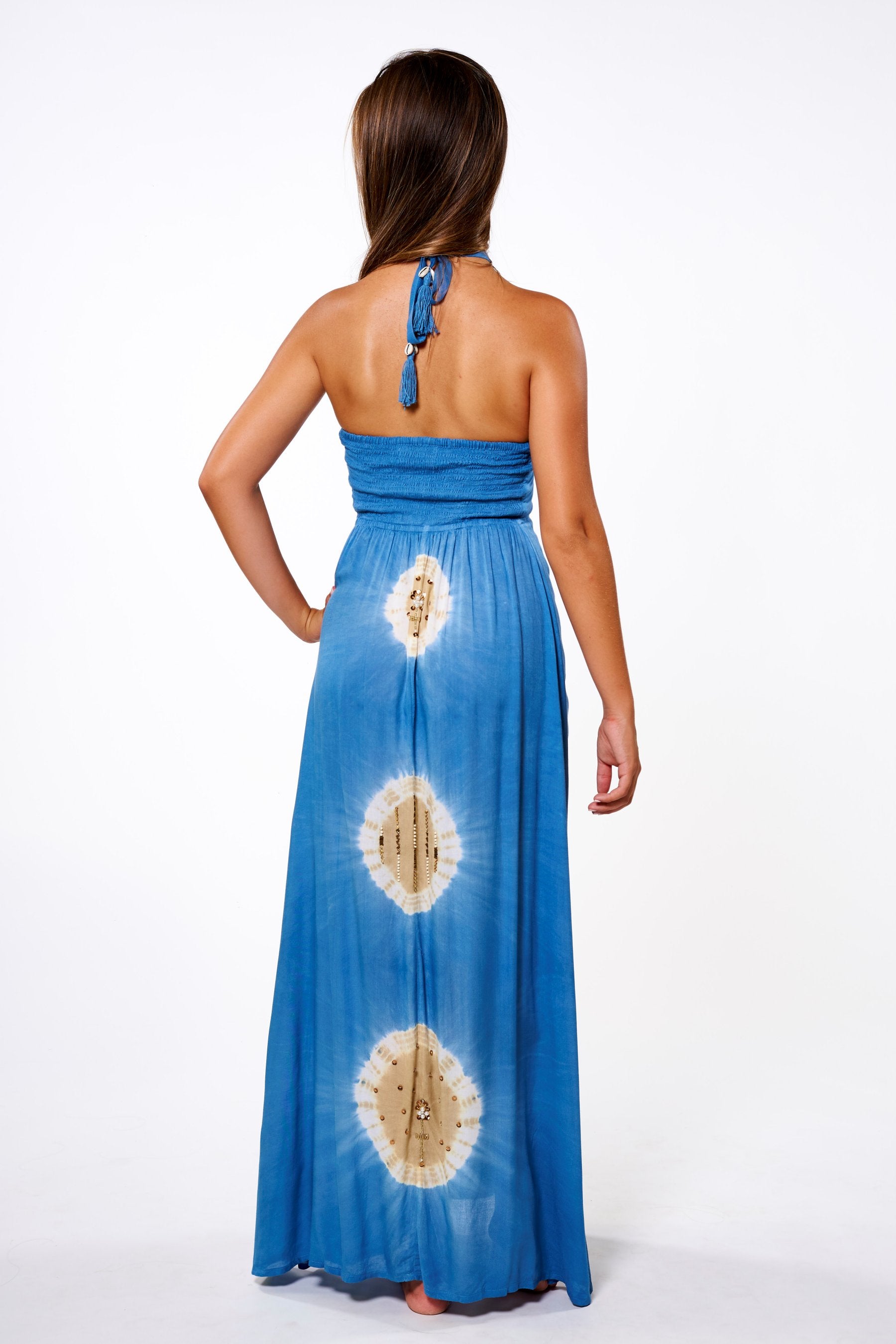 The Balibo dress is an essential option to show off with style this summer. Its floor-length design and striking underbust slit make it a one-of-a-kind piece. The halter neckline, highlighted by two straps that intersect in the center of the chest, adds a sensual and elegant touch to your summer look. In addition, its hand-dyed fabric with natural pigments guarantees an exceptional finish and an incomparable feeling of freshness.