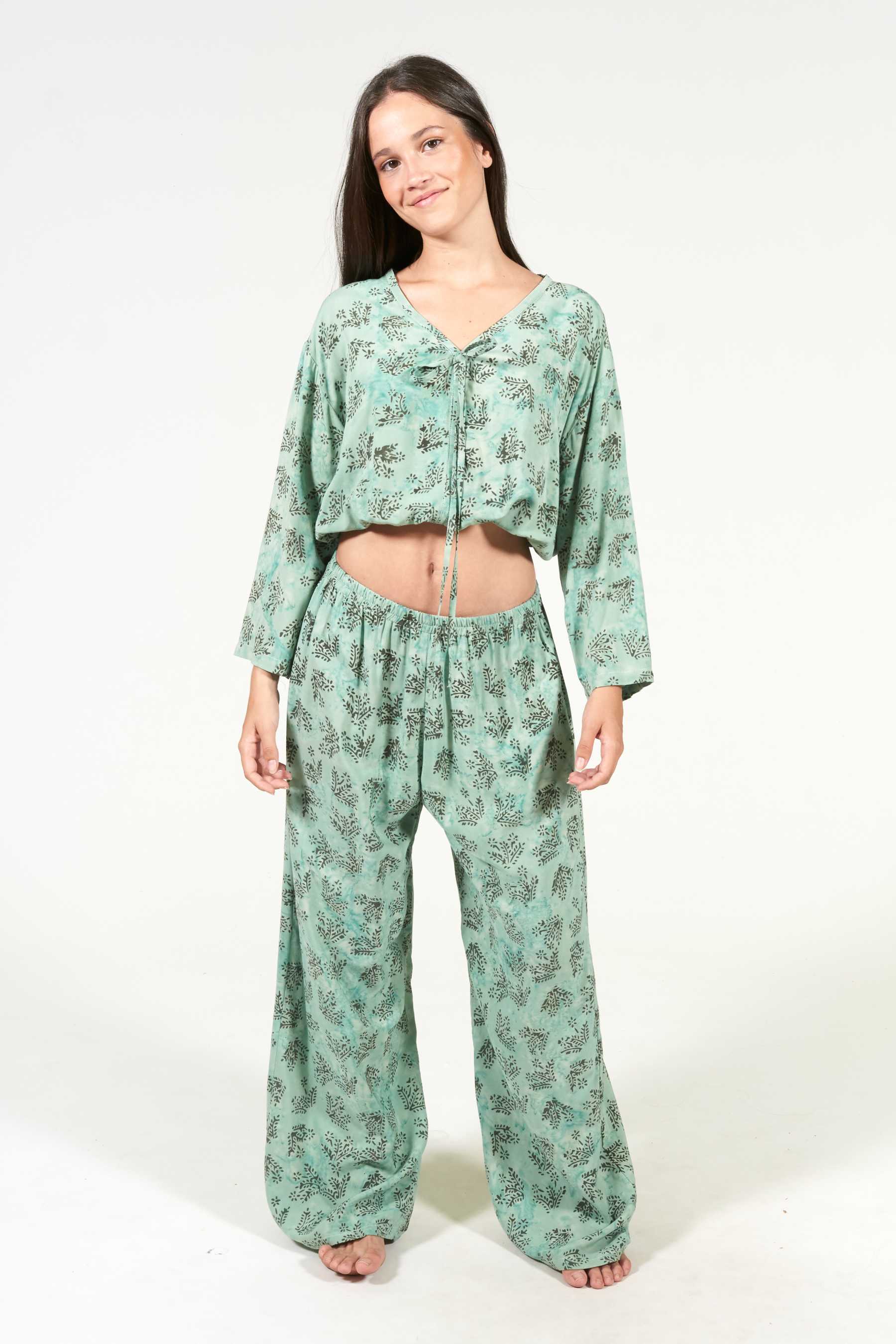 Este top Kavala presenta un favorecedor escote en V, con detalles de dos cintas del mismo tejido en la parte central para un toque decorativo. Sus mangas tres cuartos dejan la muñeca al descubierto, agregando un estilo elegante. Además, cuenta con una goma elástica en la cintura que crea un efecto abombado en la prenda, adaptándose a tu figura y estilizándola de manera natural. ¡Combínalo con una falda o un short para un conjunto completo! El estampado, diseñado y hecho a mano con técnicas tradicionales y pigmentos naturales, añade un toque distintivo.