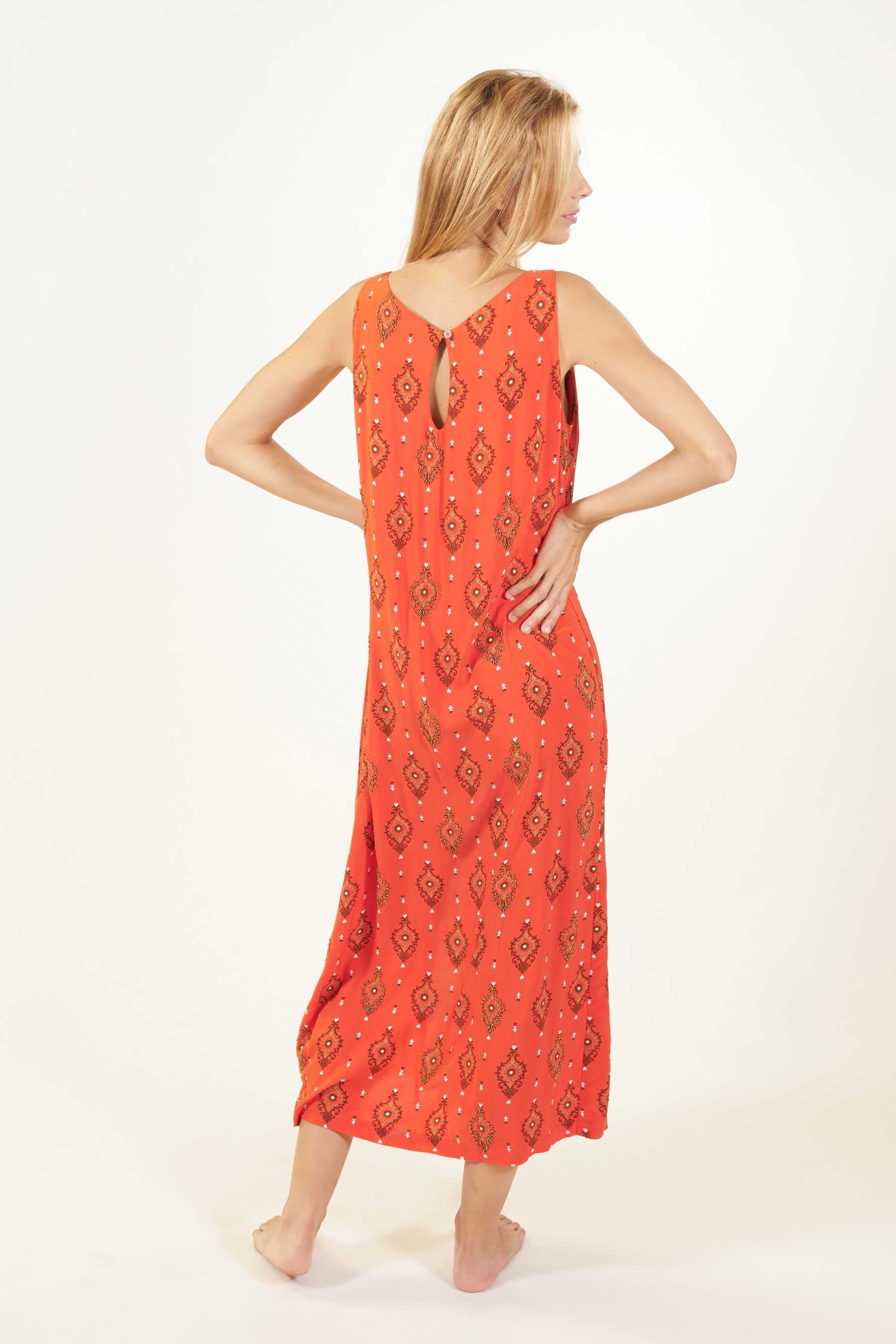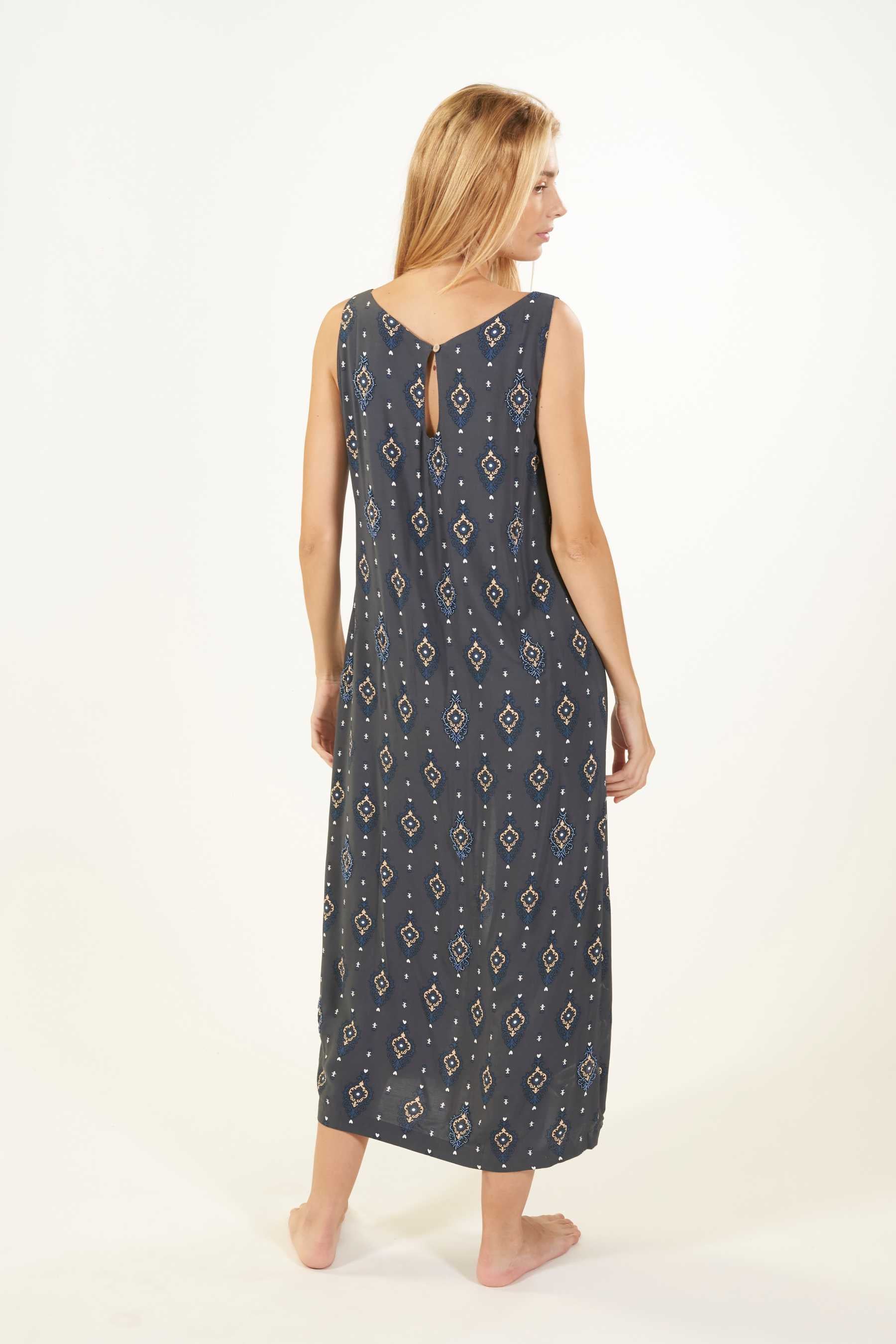Vestido de corte recto, elegante, femenino y a la vez cómodo. Tirante ancho con terminaciones en pico, con escote más pronunciado por la parte delantera y terminado con una apertura y cierre con botón por la parte de la espalda.