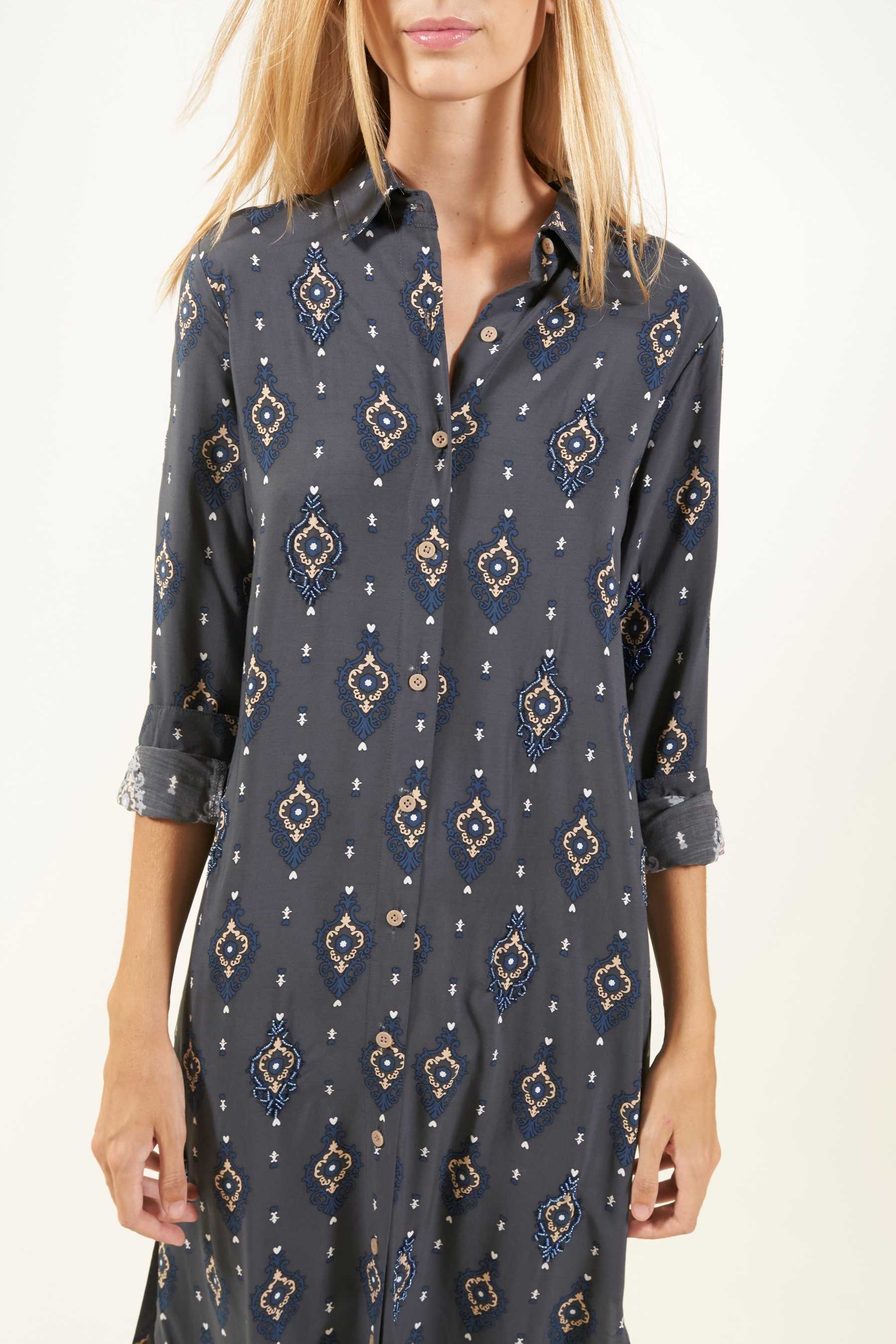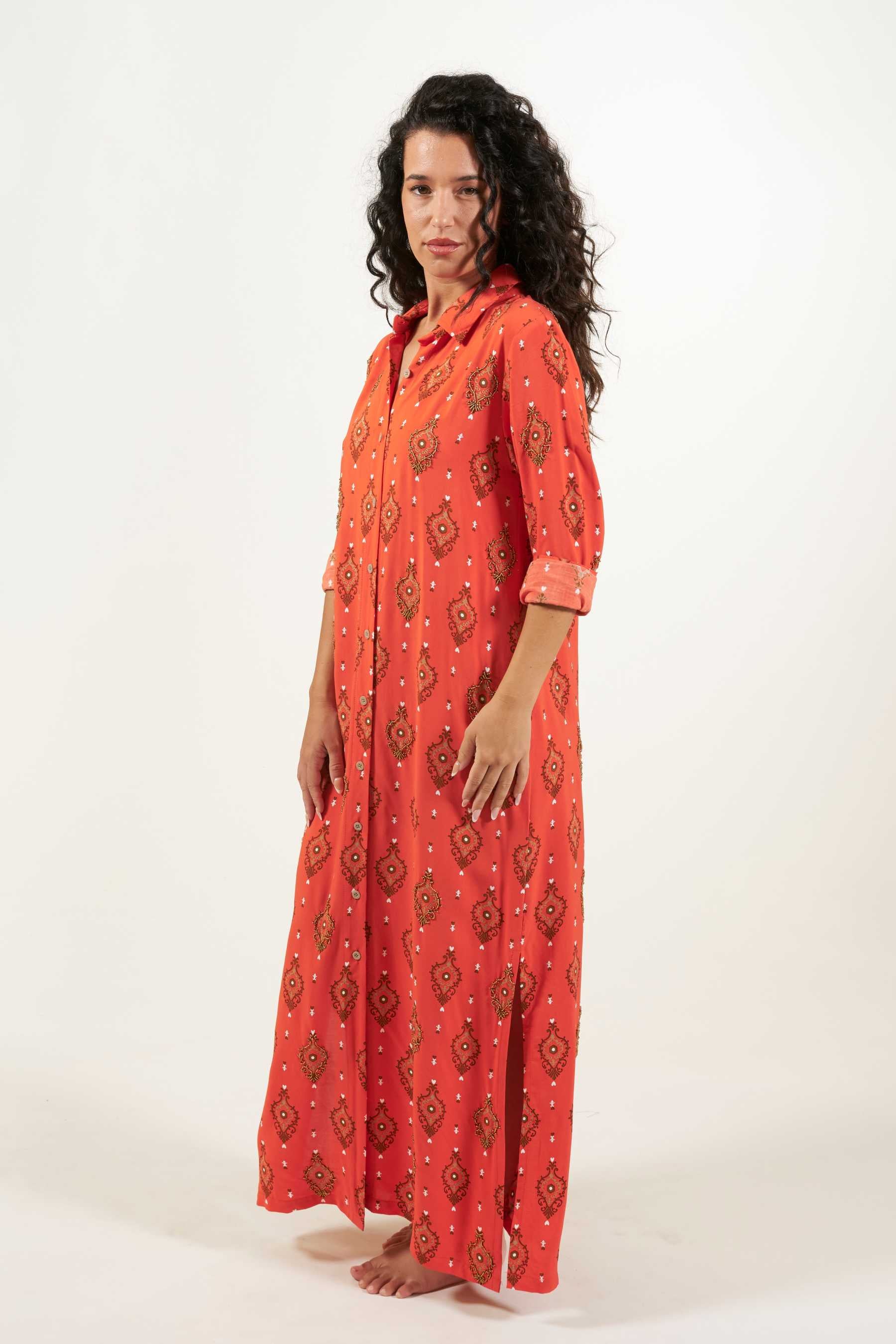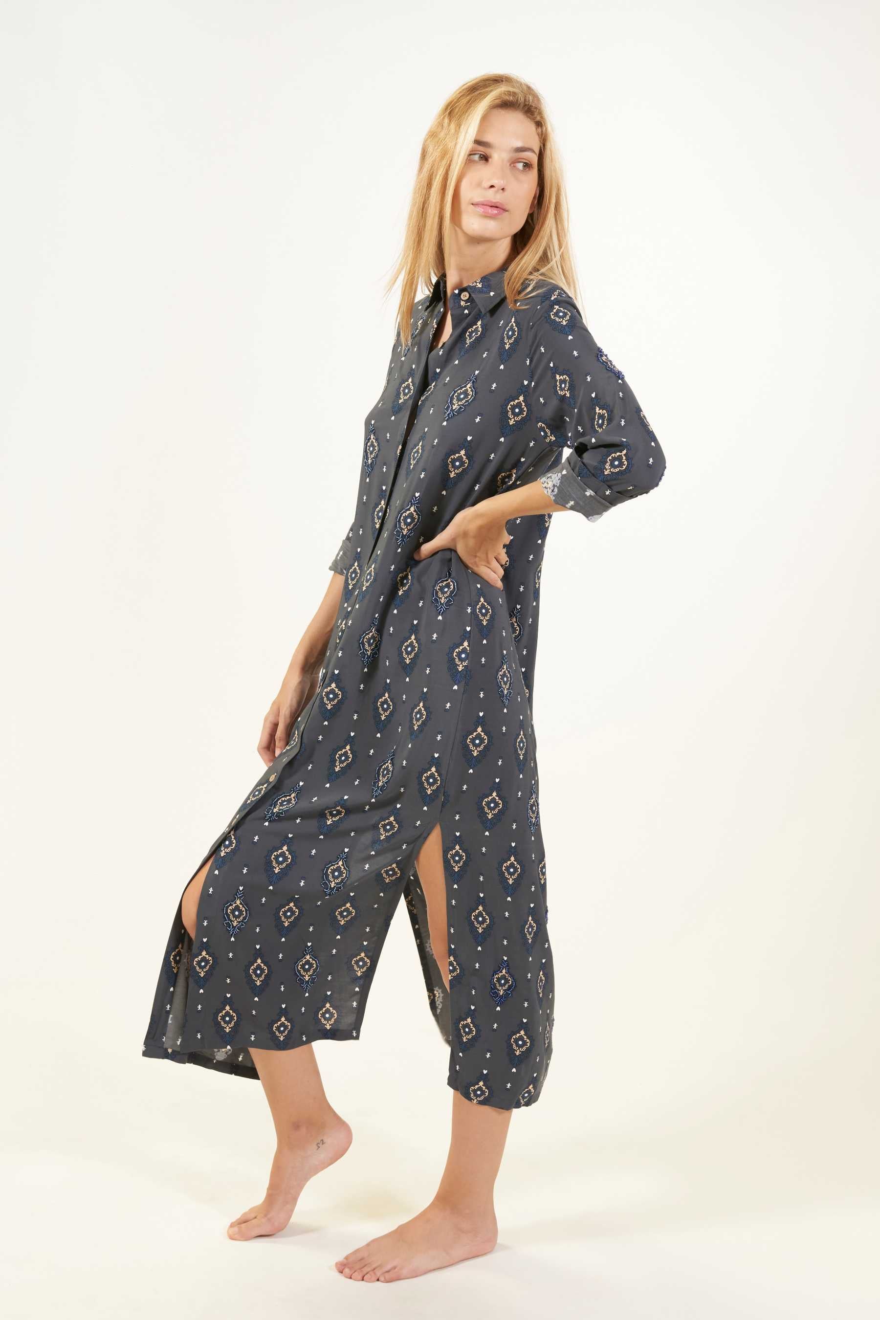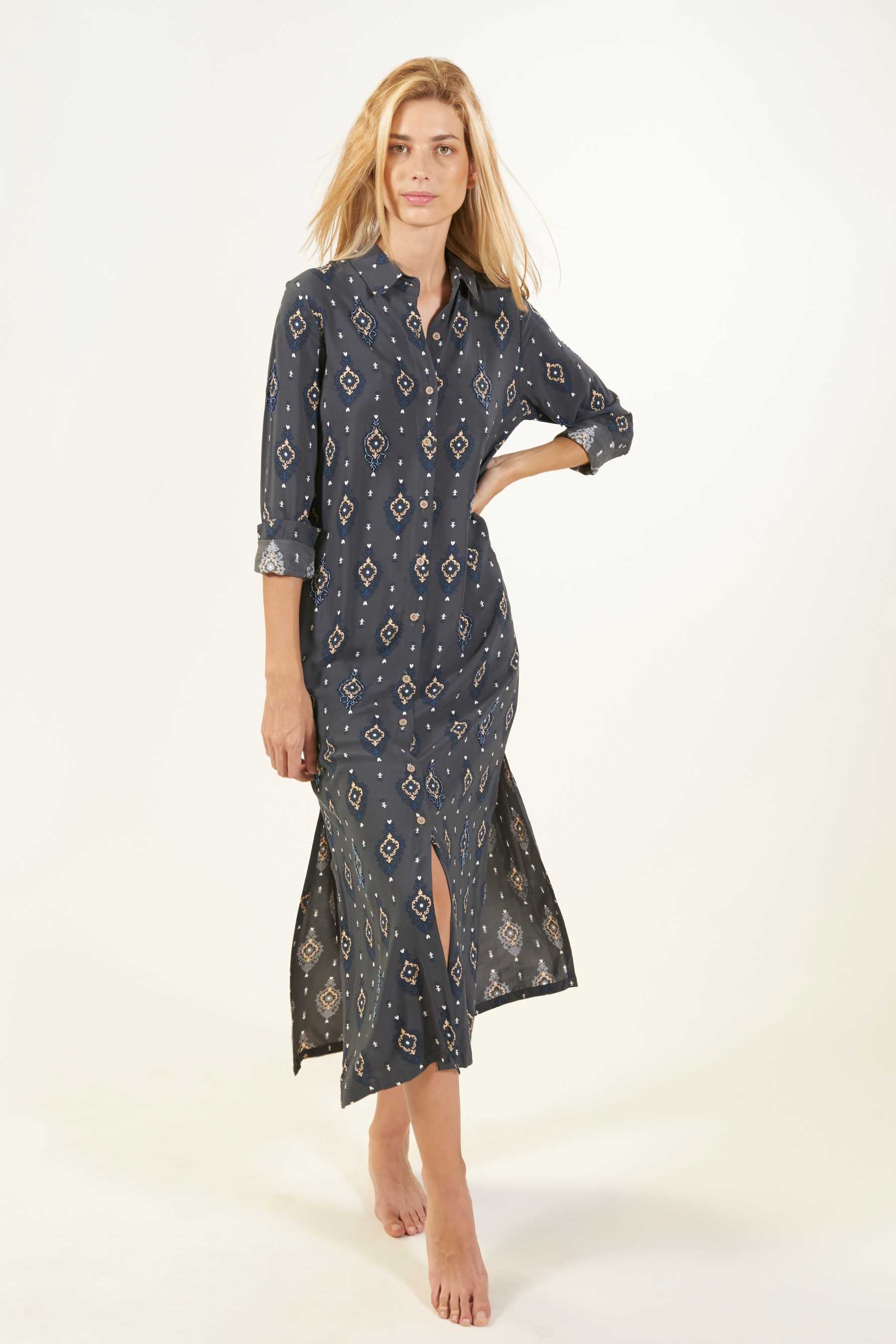 Explora la versatilidad del vestido camisero Domett, una opción elegante con un toque informal. Este vestido de corte camisero, confeccionado en una suave tela de viscosa, cae hasta el tobillo y presenta mangas largas rectas, junto con una fila de botones en la parte delantera que se abren hasta la rodilla, creando una atractiva abertura. Perfecto para un look playero relajado, puedes transformarlo en un conjunto urbano y sofisticado agregando un cinturón y un clutch. El vestido tiene un estampado de diseño exclusivo con cuentas a contraste cosidas contorneando algunas de las ilustraciones. Estos detalles le confieren un toque único, exclusivo y artesanal a cada prenda.