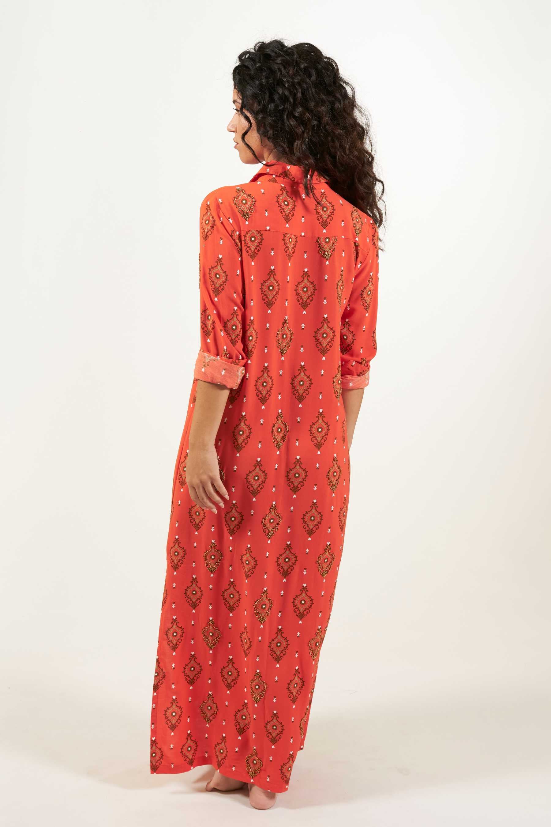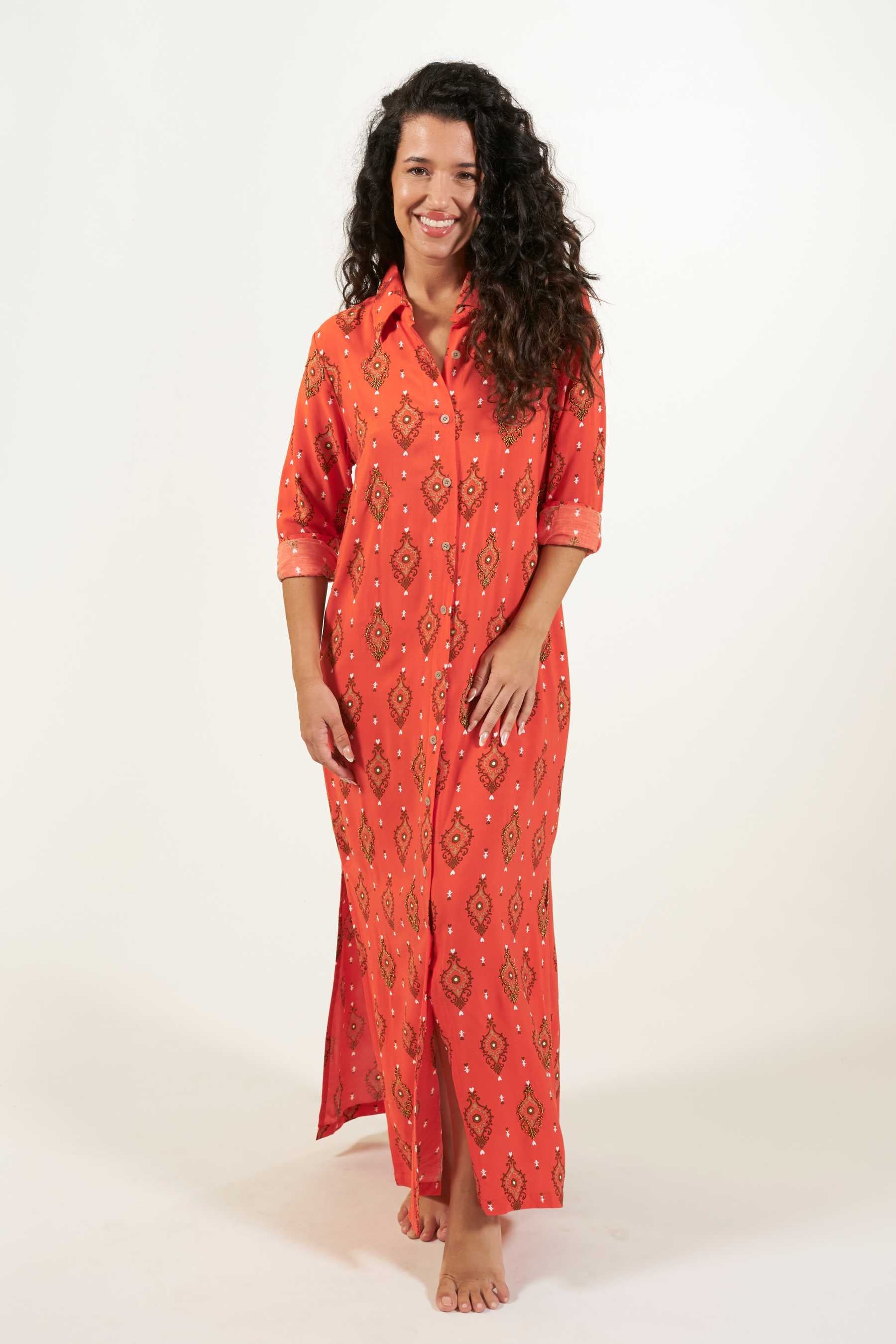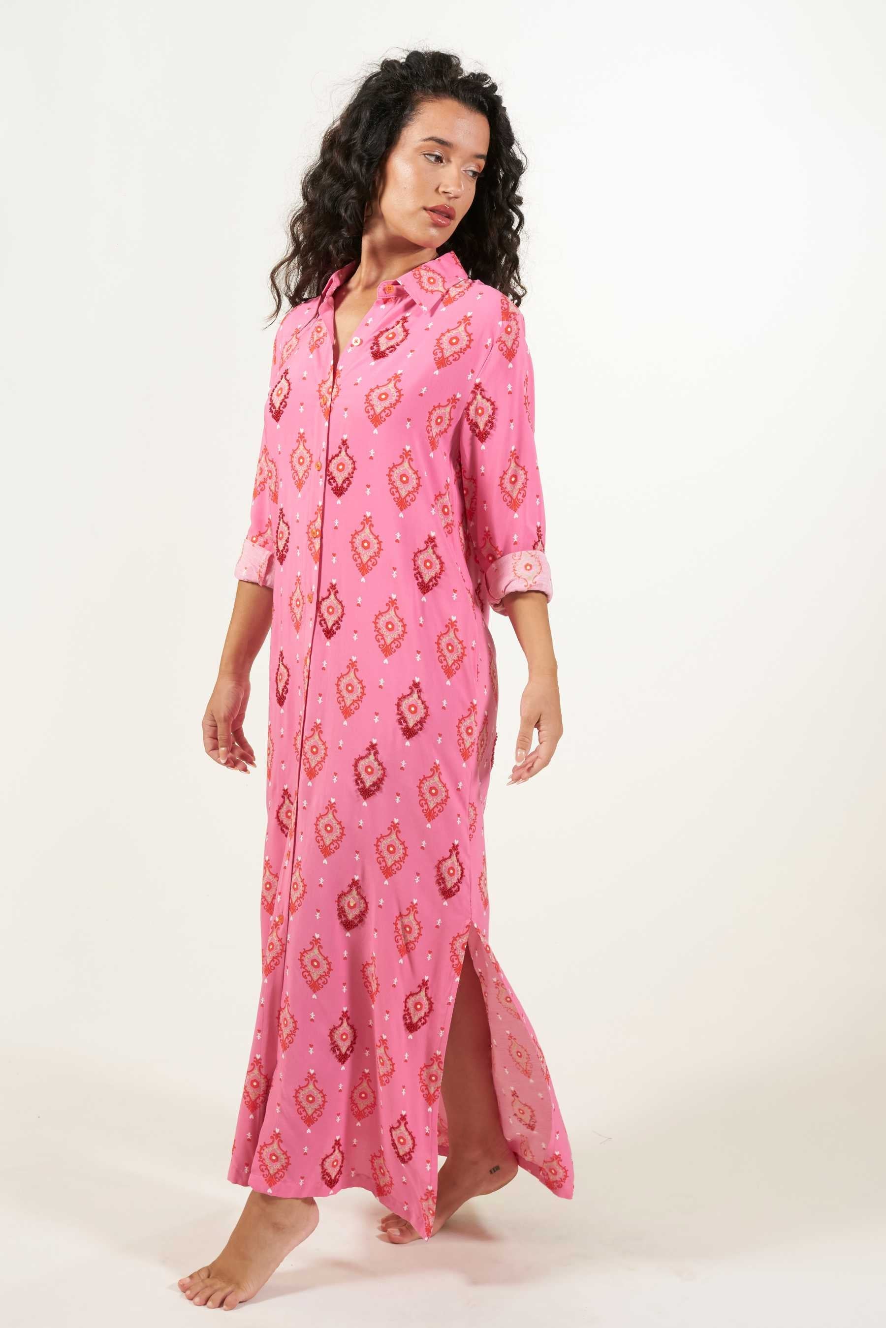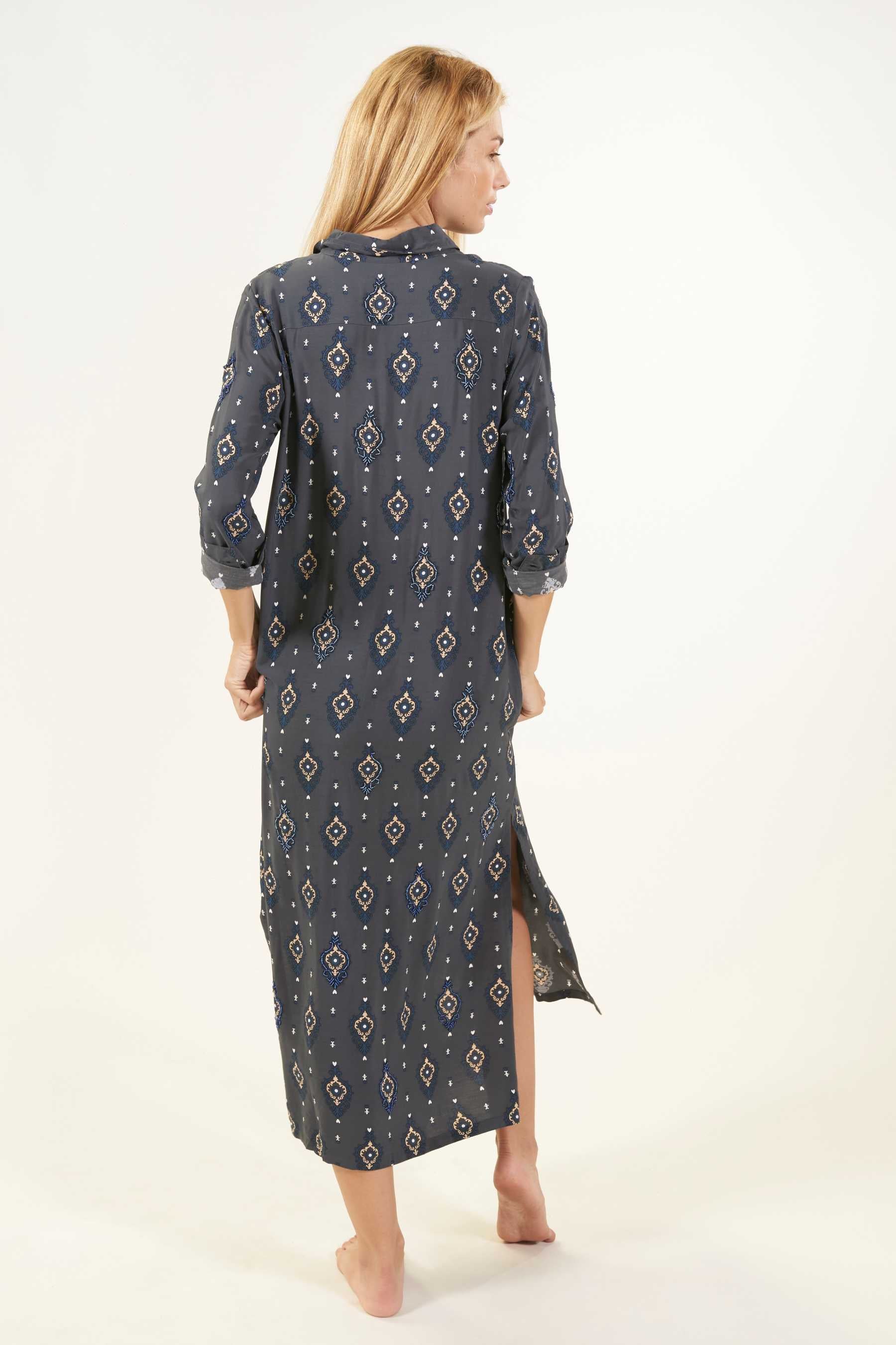 Explora la versatilidad del vestido camisero Domett, una opción elegante con un toque informal. Este vestido de corte camisero, confeccionado en una suave tela de viscosa, cae hasta el tobillo y presenta mangas largas rectas, junto con una fila de botones en la parte delantera que se abren hasta la rodilla, creando una atractiva abertura. Perfecto para un look playero relajado, puedes transformarlo en un conjunto urbano y sofisticado agregando un cinturón y un clutch. El vestido tiene un estampado de diseño exclusivo con cuentas a contraste cosidas contorneando algunas de las ilustraciones. Estos detalles le confieren un toque único, exclusivo y artesanal a cada prenda.