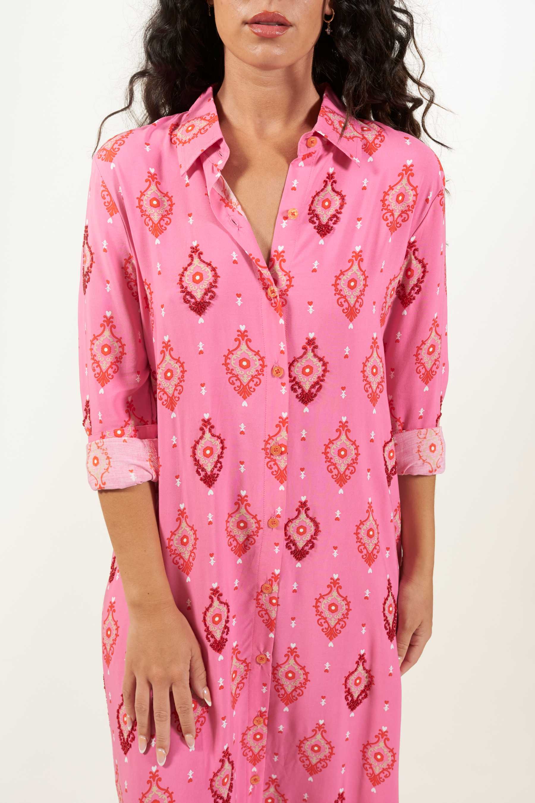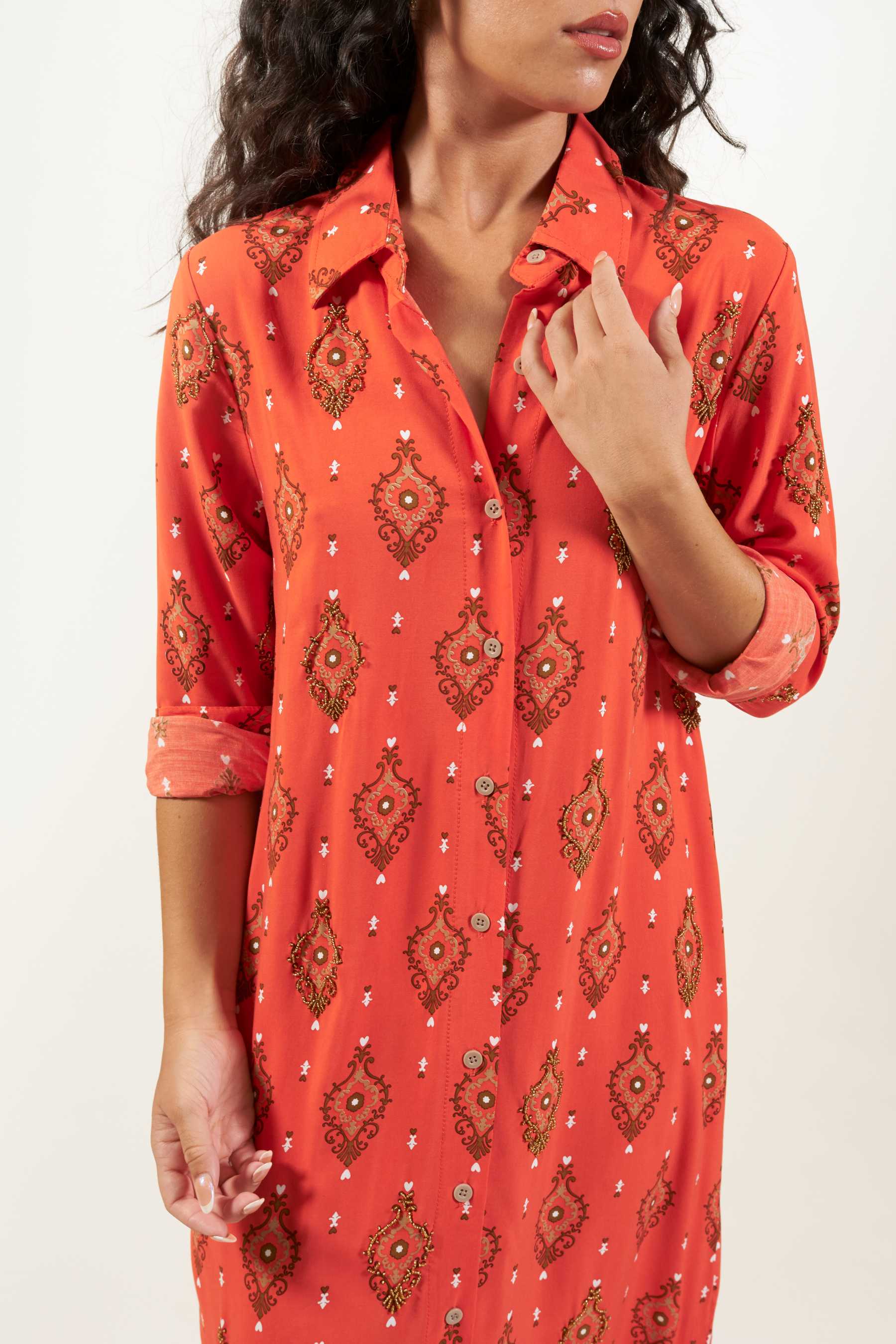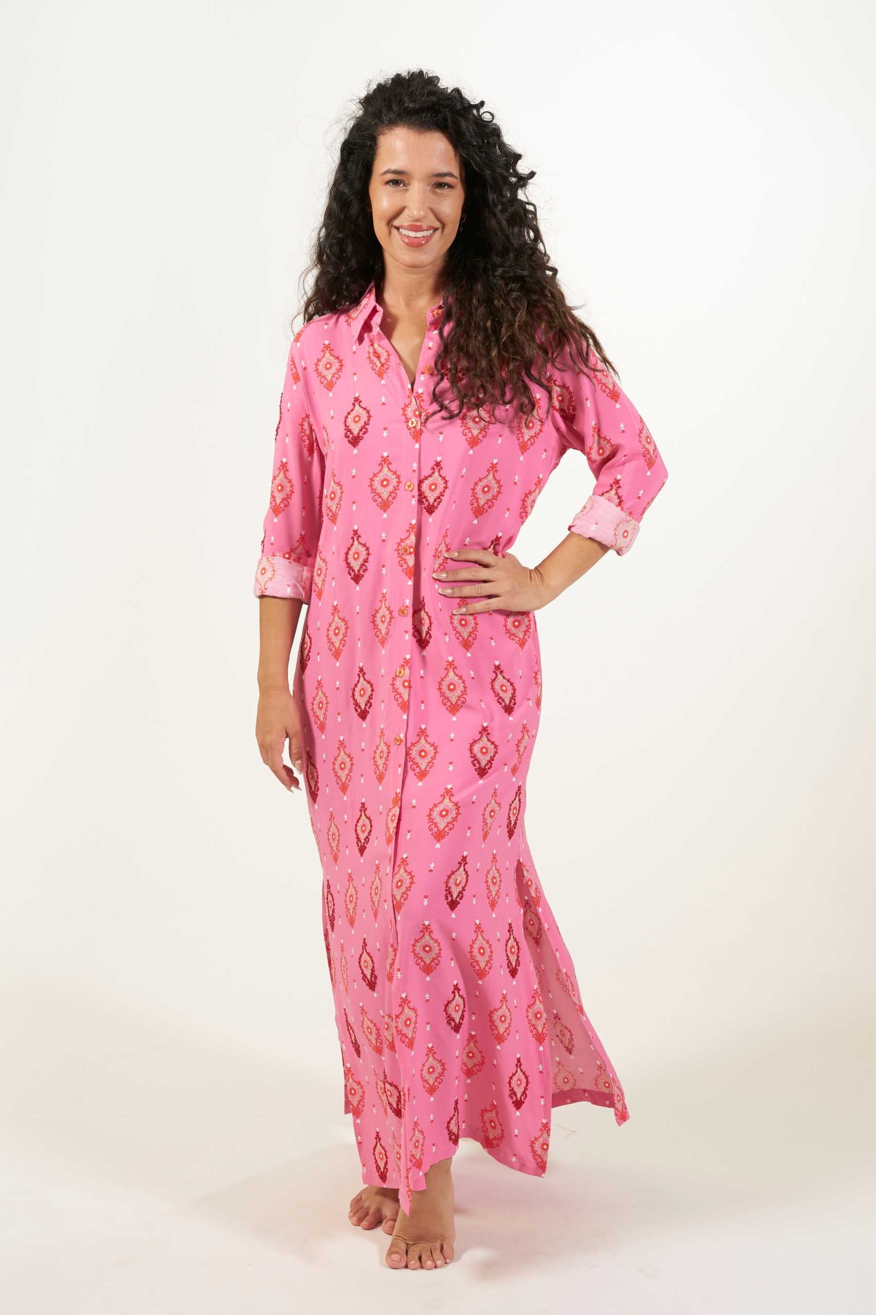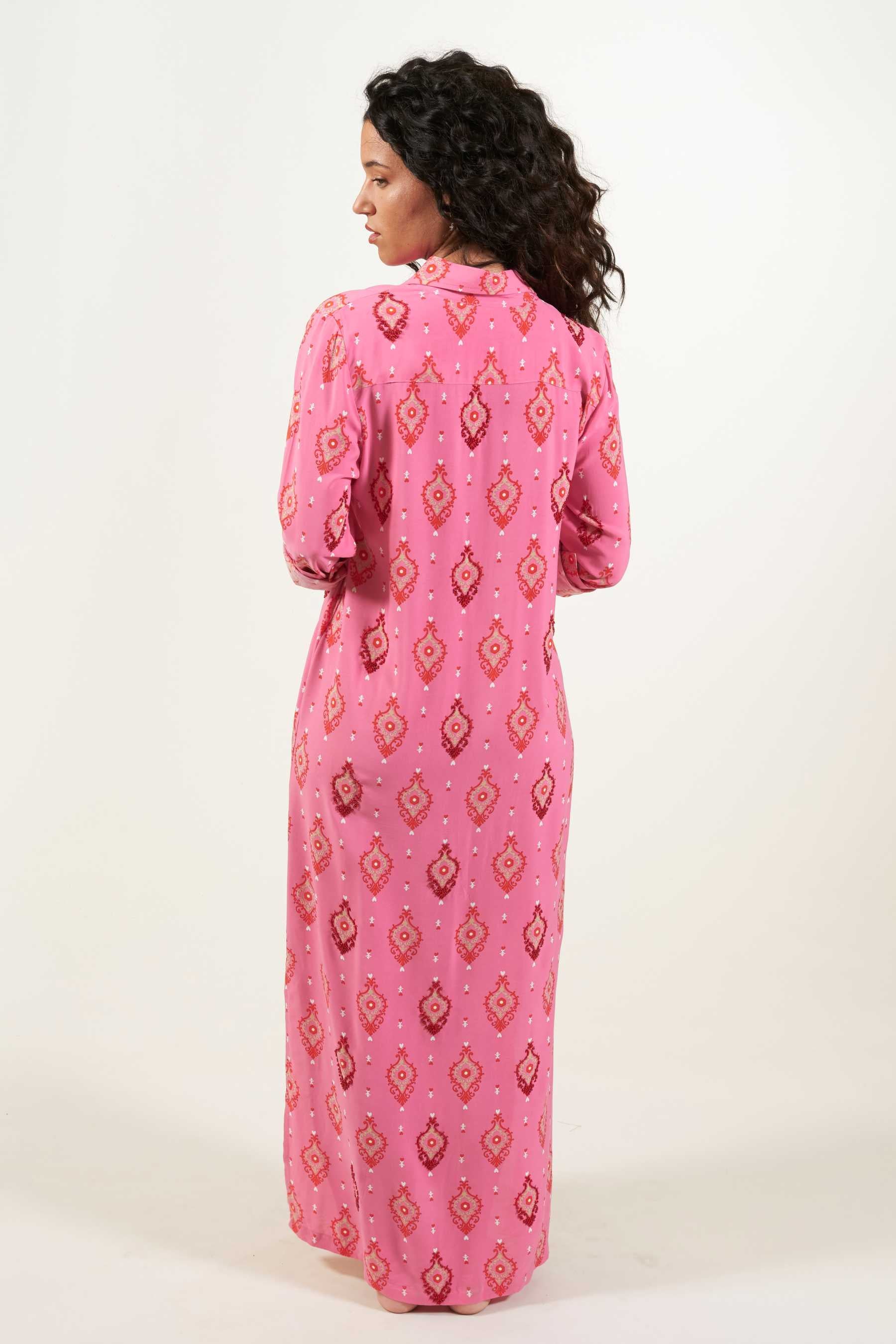 Explora la versatilidad del vestido camisero Domett, una opción elegante con un toque informal. Este vestido de corte camisero, confeccionado en una suave tela de viscosa, cae hasta el tobillo y presenta mangas largas rectas, junto con una fila de botones en la parte delantera que se abren hasta la rodilla, creando una atractiva abertura. Perfecto para un look playero relajado, puedes transformarlo en un conjunto urbano y sofisticado agregando un cinturón y un clutch. El vestido tiene un estampado de diseño exclusivo con cuentas a contraste cosidas contorneando algunas de las ilustraciones. Estos detalles le confieren un toque único, exclusivo y artesanal a cada prenda.