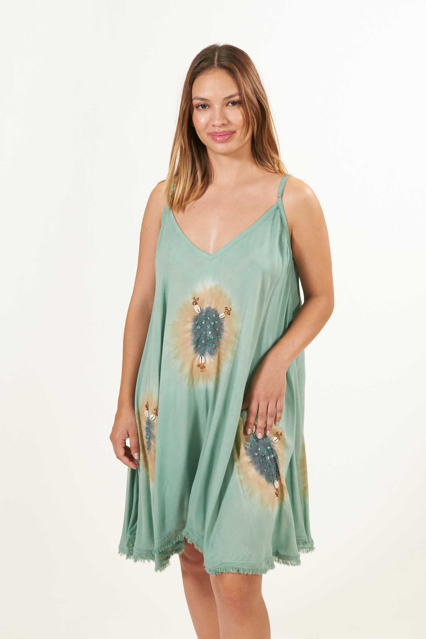 Descubre el encanto del vestido corto Tebo. ¡Perfecto para el verano y tu outfit de playa favorito! Este adorable vestido ofrece comodidad y diversión en cada momento. Con su encantador escote en V tanto al frente como en la espalda, y su longitud por encima de la rodilla, ligeramente más larga en los laterales, te brinda un ajuste favorecedor y fresco. Permite un ajuste perfecto gracias a sus tirantes finos ajustables.