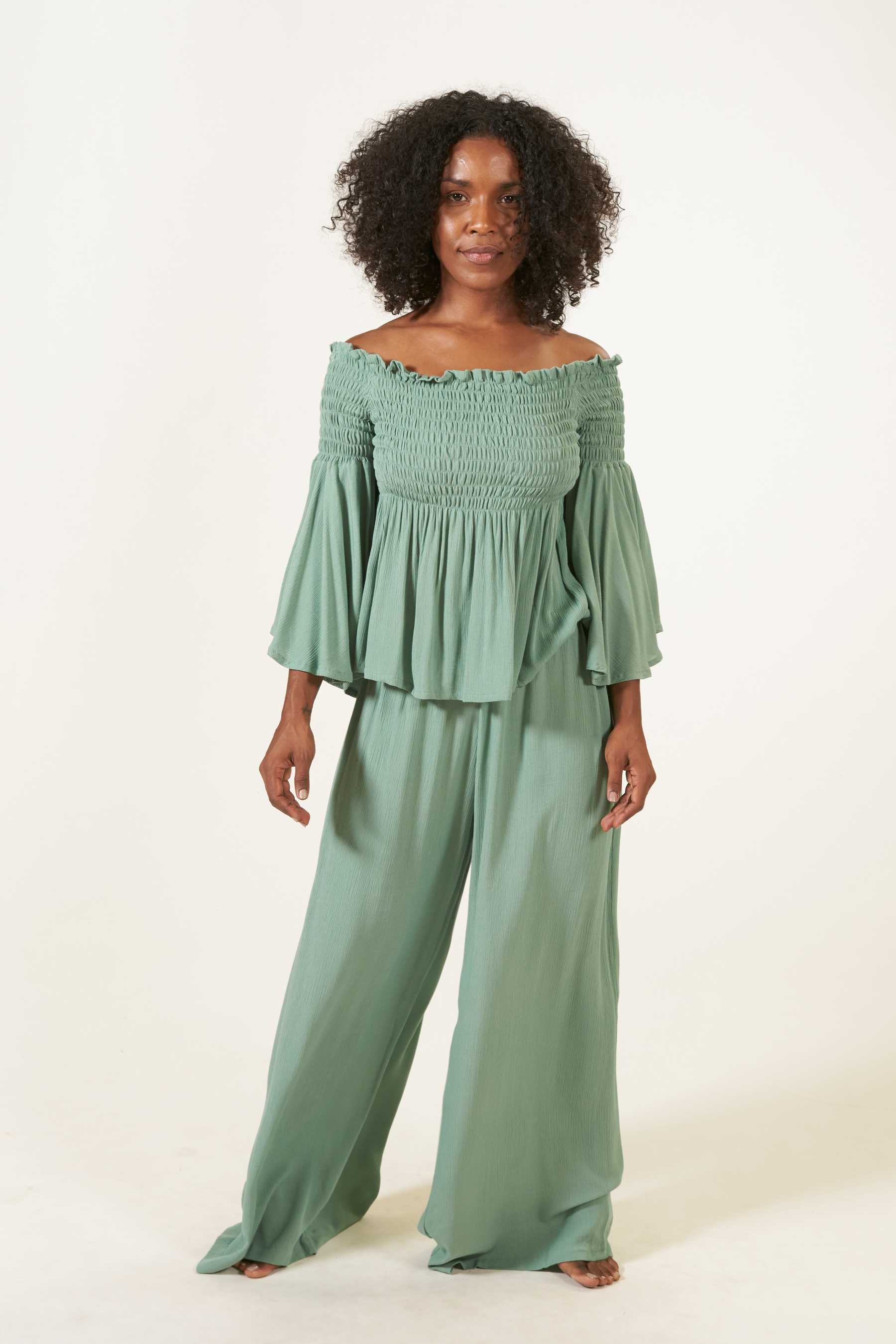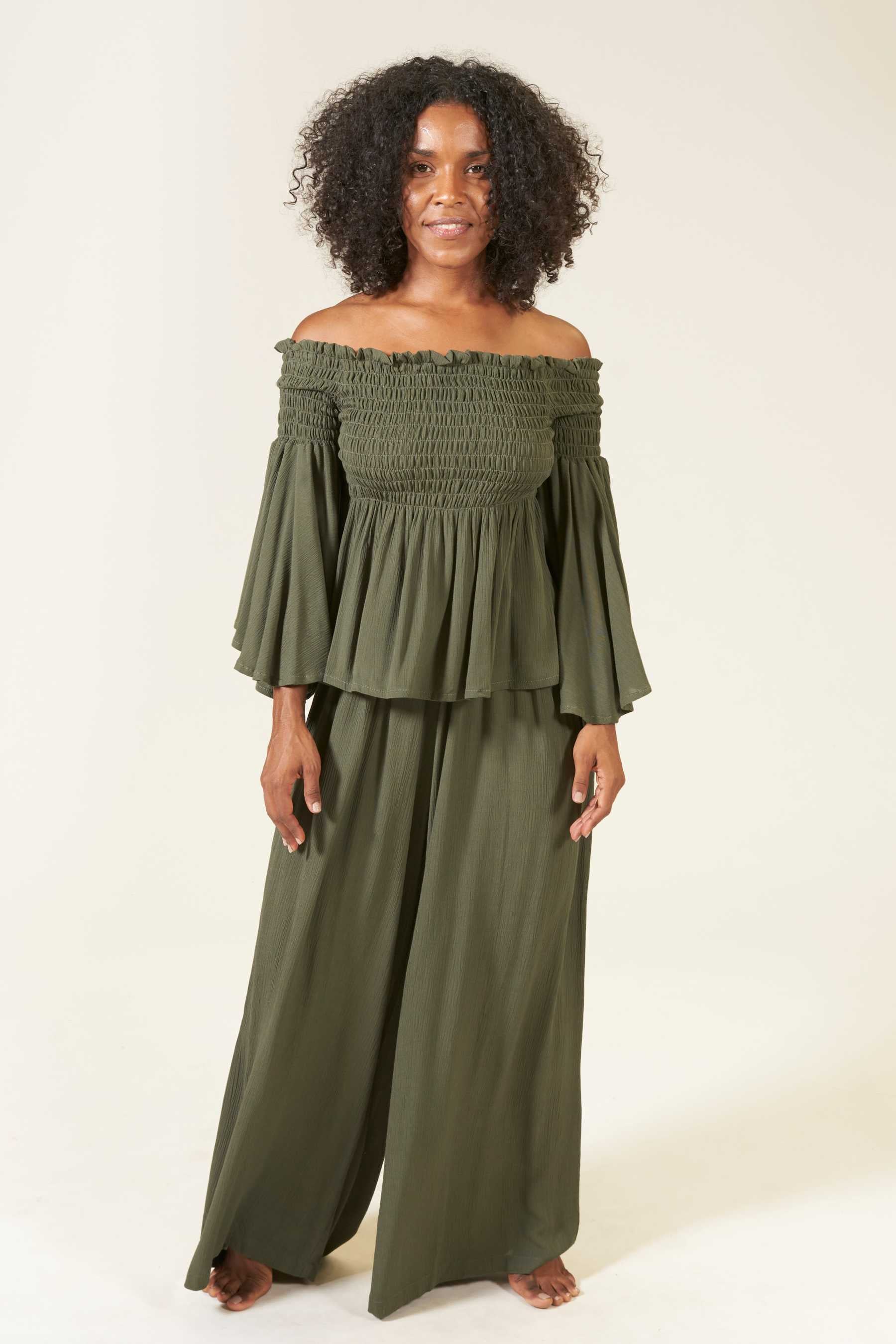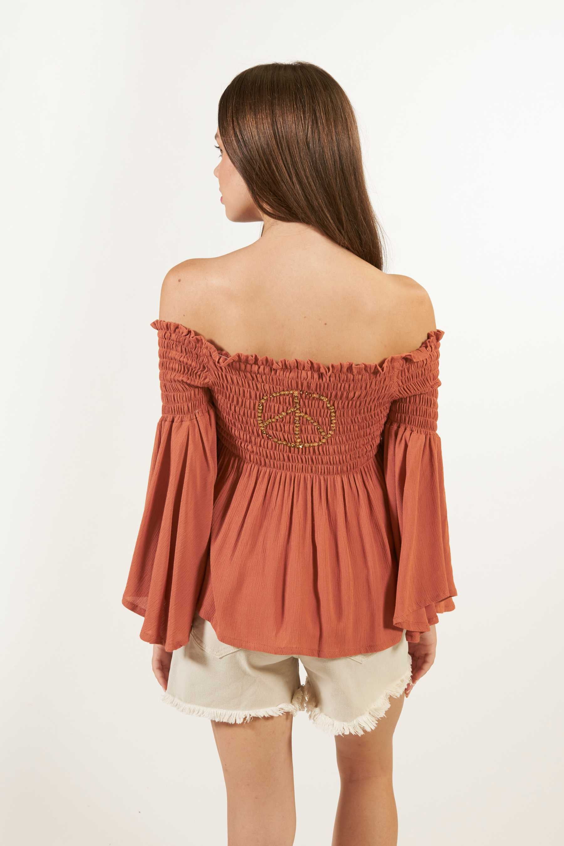 El top Grana presenta un bonito escote bardot que resalta los hombros al dejarlos al descubierto. Su diseño incluye un fruncido con gomas tipo nido de abeja en la parte superior, que define la cintura y realza la figura de manera natural gracias a su elasticidad, adaptándose perfectamente a cualquier silueta. Las mangas largas con acabado acampanado añaden un toque de elegancia y movimiento al conjunto. ¡Combínalo con unos jeans y sandalias romanas para un look boho cómodo y chic! Confeccionado artesanalmente con técnicas tradicionales de tenido y pigmentos naturales.