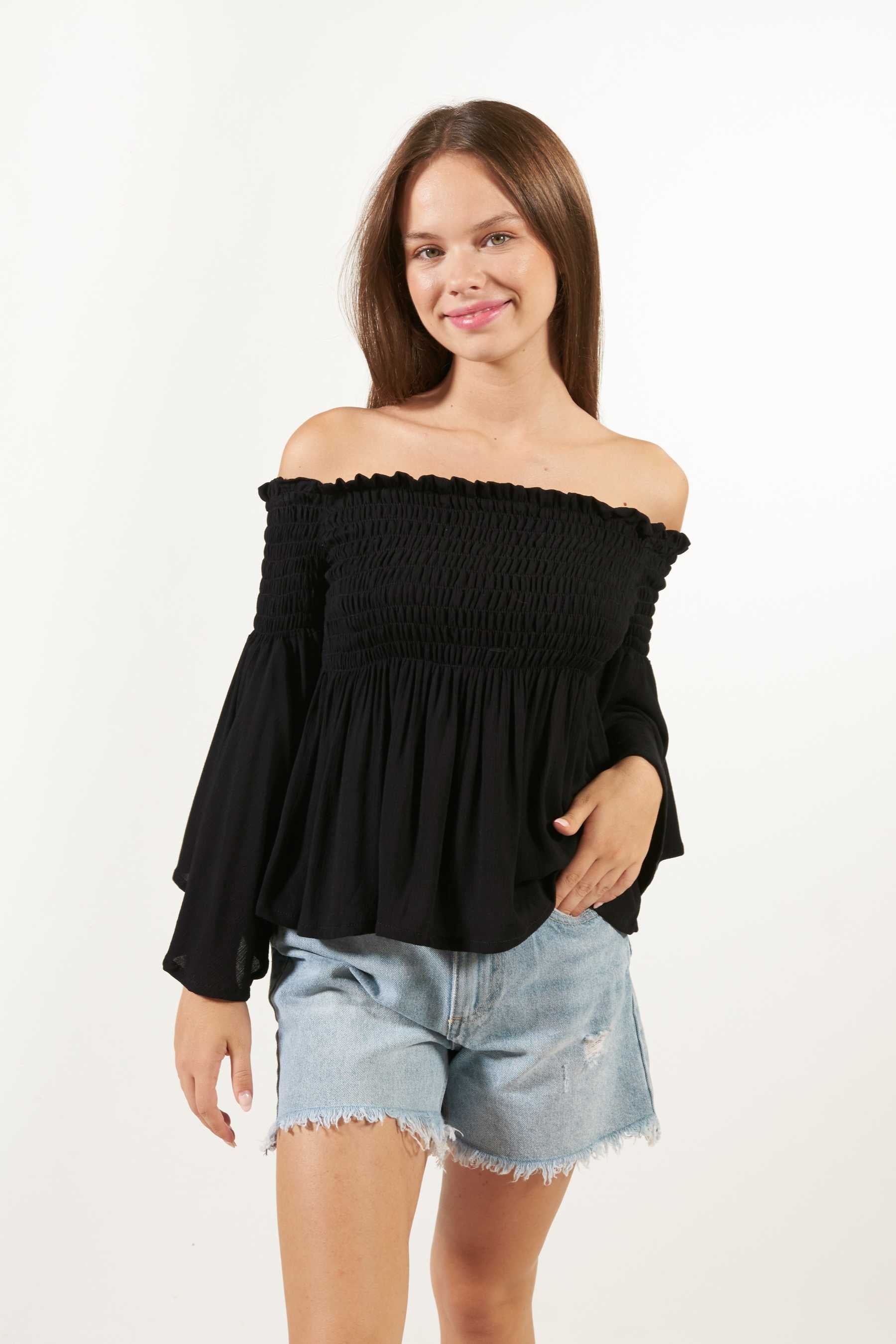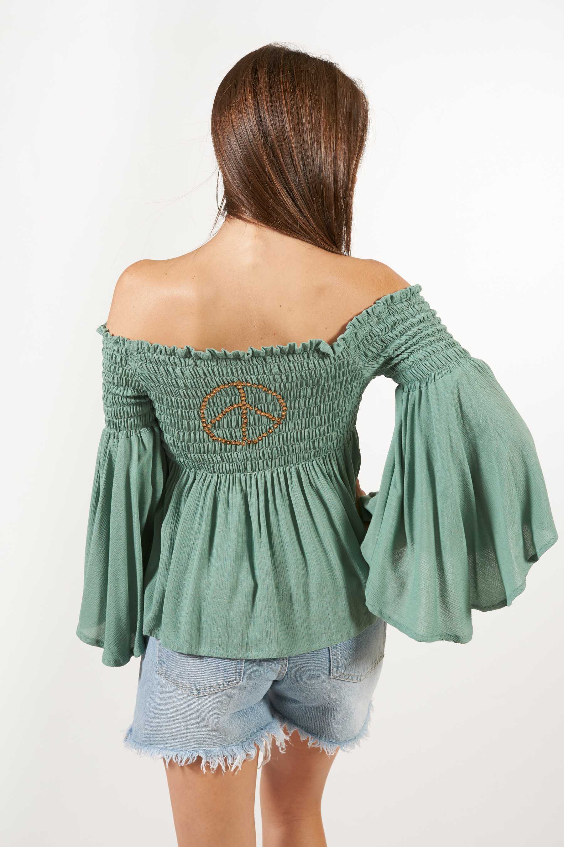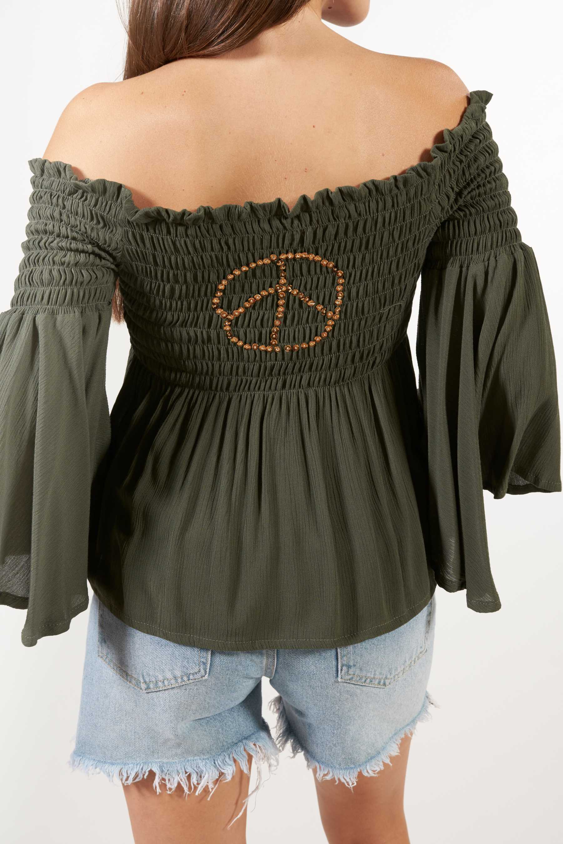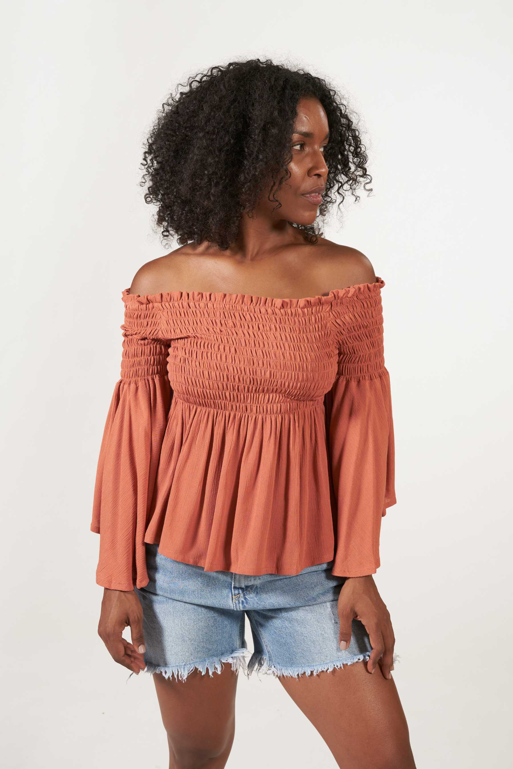 El top Grana presenta un bonito escote bardot que resalta los hombros al dejarlos al descubierto. Su diseño incluye un fruncido con gomas tipo nido de abeja en la parte superior, que define la cintura y realza la figura de manera natural gracias a su elasticidad, adaptándose perfectamente a cualquier silueta. Las mangas largas con acabado acampanado añaden un toque de elegancia y movimiento al conjunto. ¡Combínalo con unos jeans y sandalias romanas para un look boho cómodo y chic! Confeccionado artesanalmente con técnicas tradicionales de tenido y pigmentos naturales.