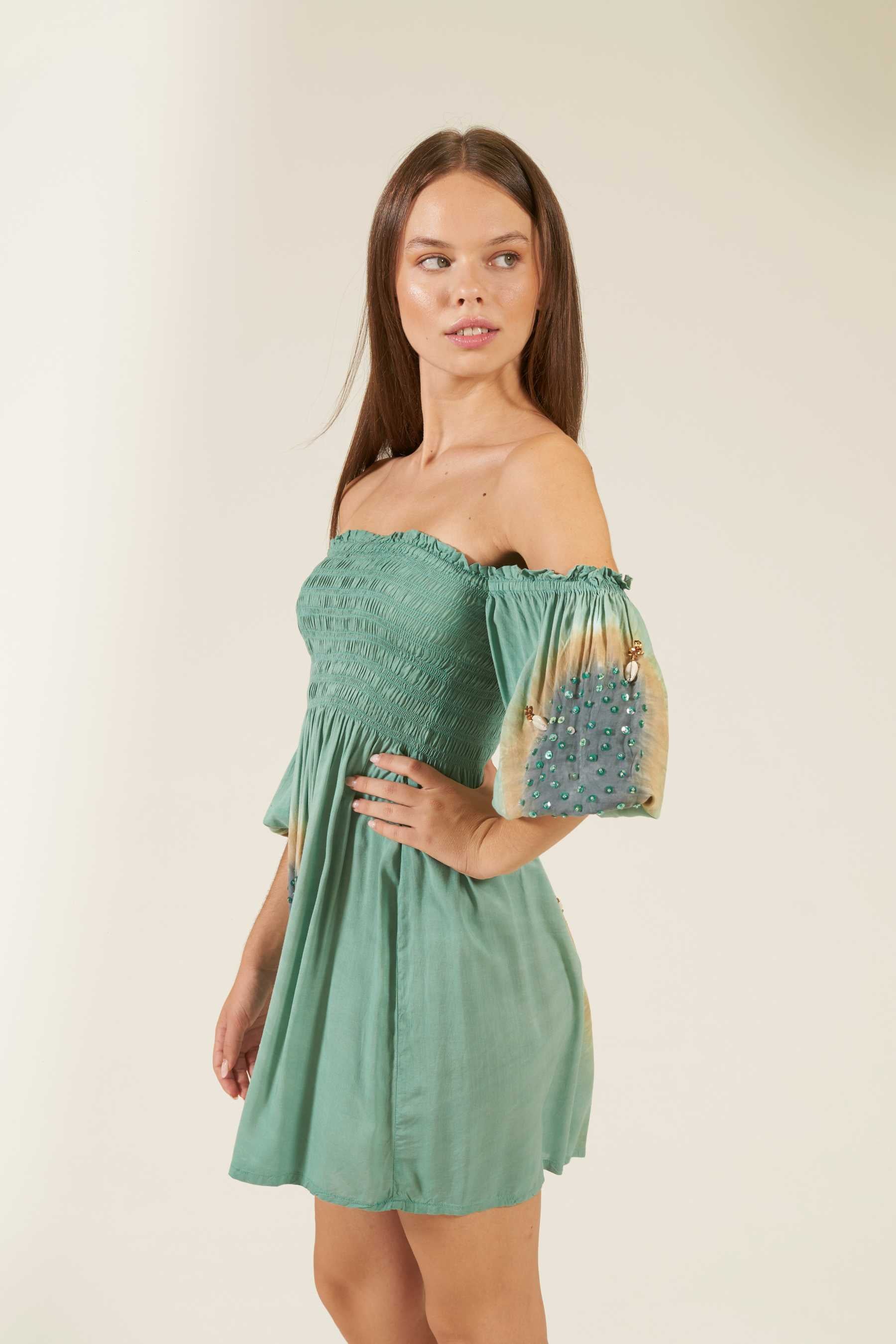 El vestido Praslin es una pieza encantadora que se ajusta perfectamente a cualquier tipo de cuerpo. Con un fruncido tipo nido de abeja que realza el pecho y estiliza la figura. Su escote recto en palabra de honor añade un toque de elegancia y las mangas abullonadas con elástico en la parte superior dejan los hombros descubiertos y aportan un toque romántico a la prenda.