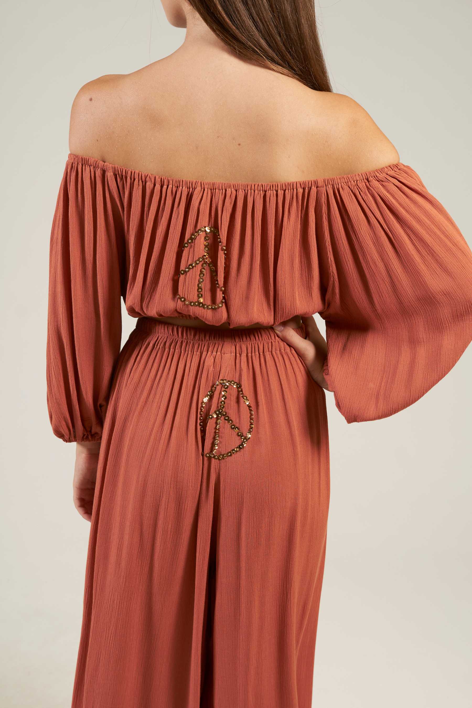 Este es el top de la colección que tiene más estilo boho. El escote bardot, realza tus hombros y añade un toque de estilo a tu look. La manga 3/4 con goma en el puño ofrece comodidad y estilo, permitiéndote ajustar la longitud de la manga según tu preferencia.