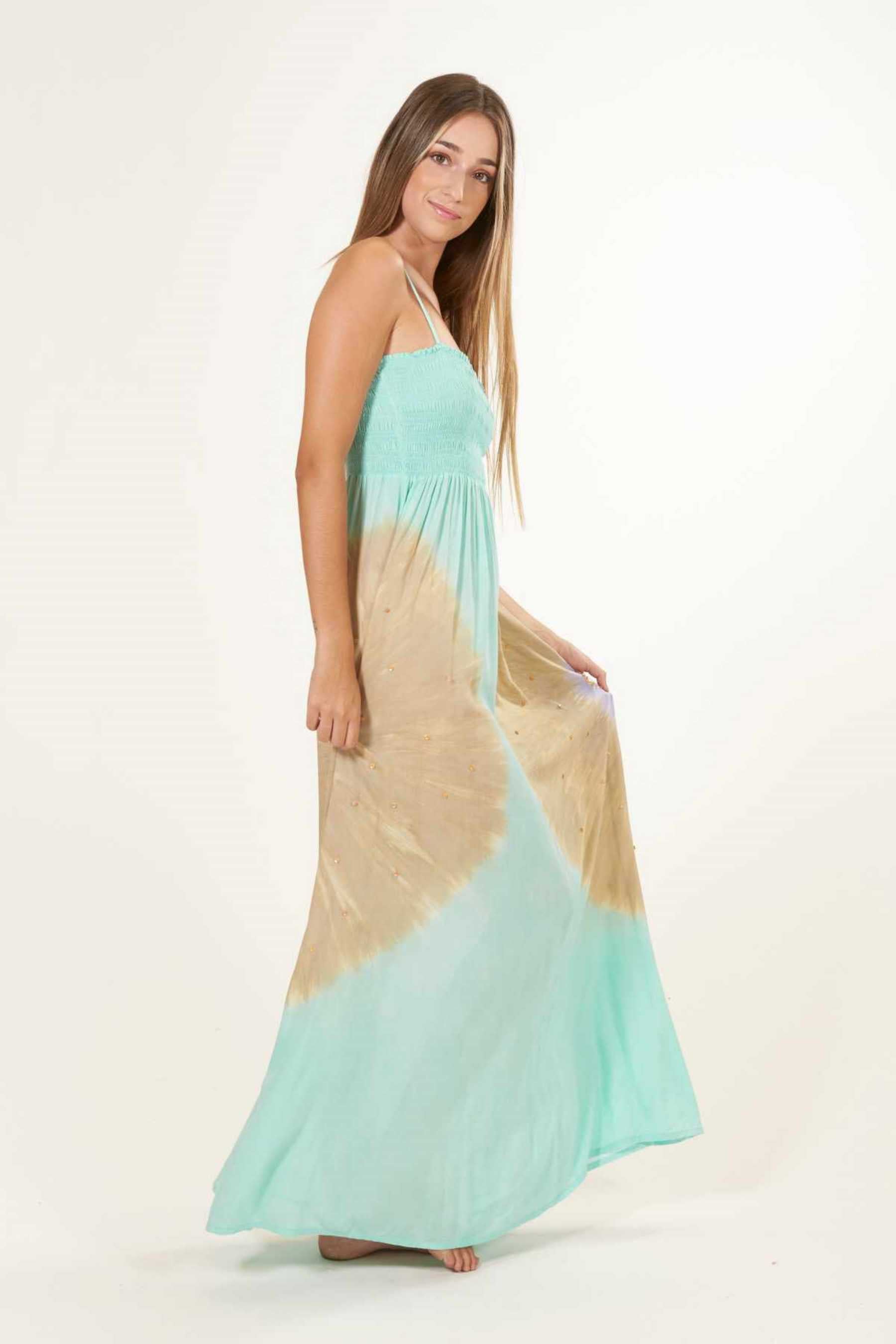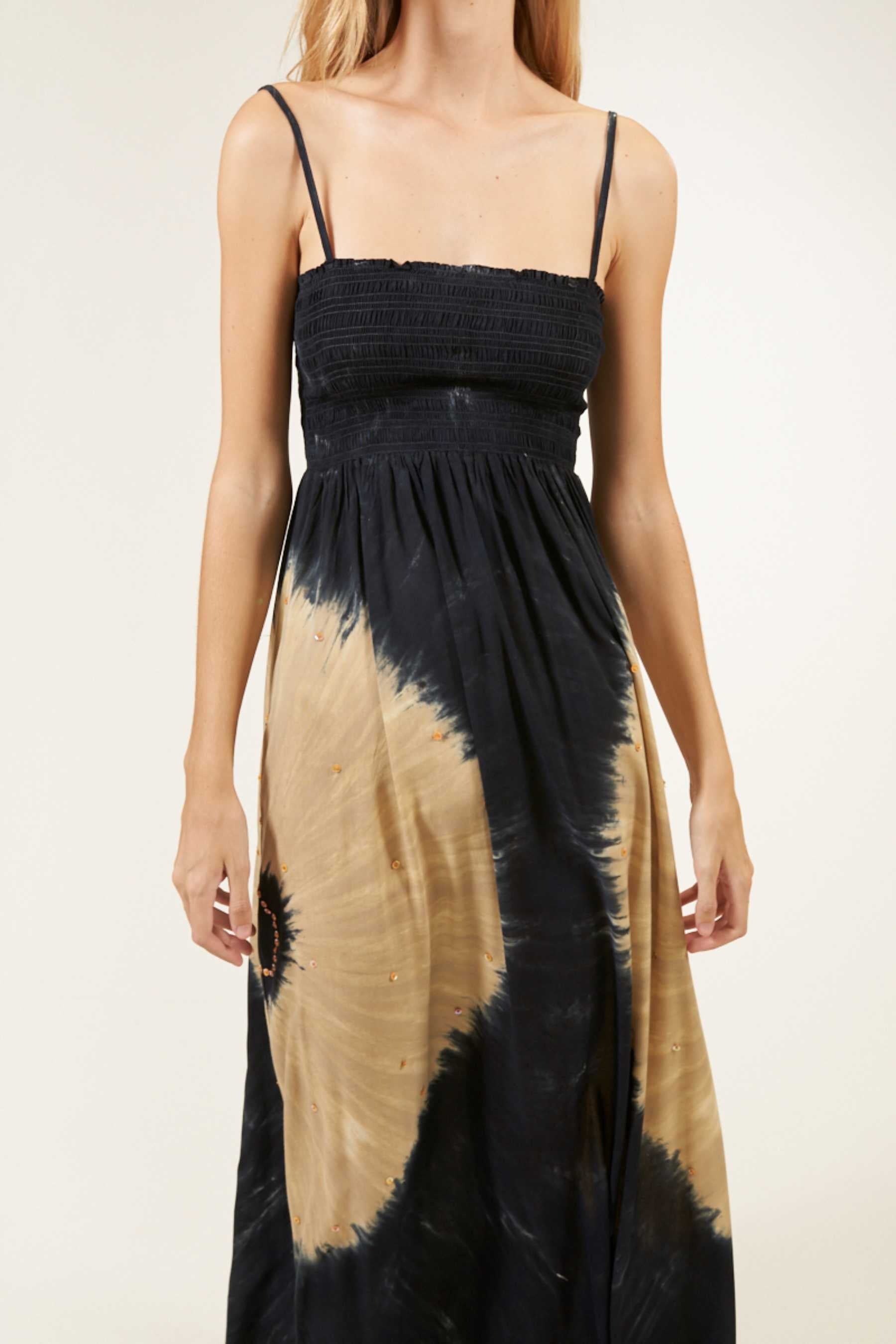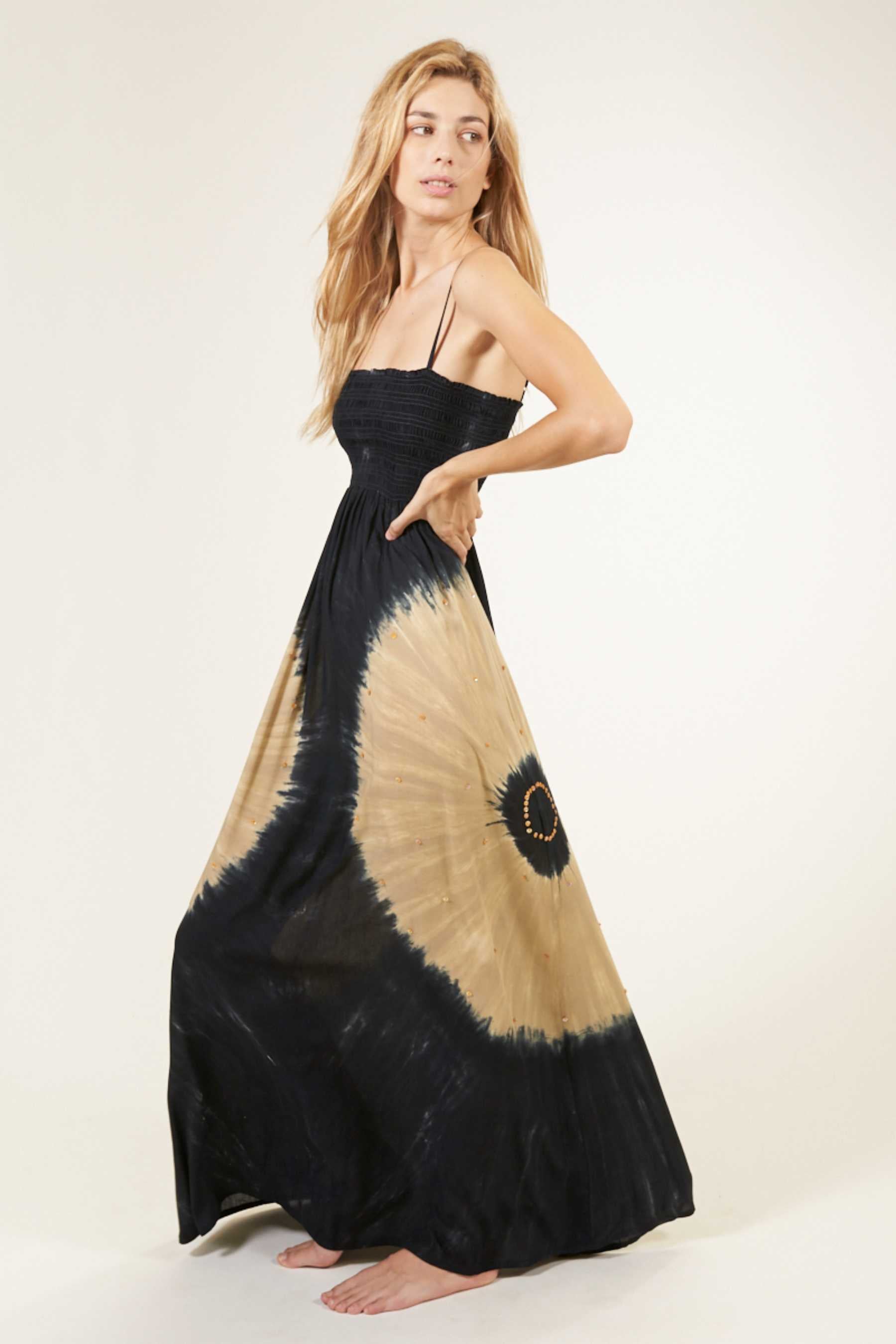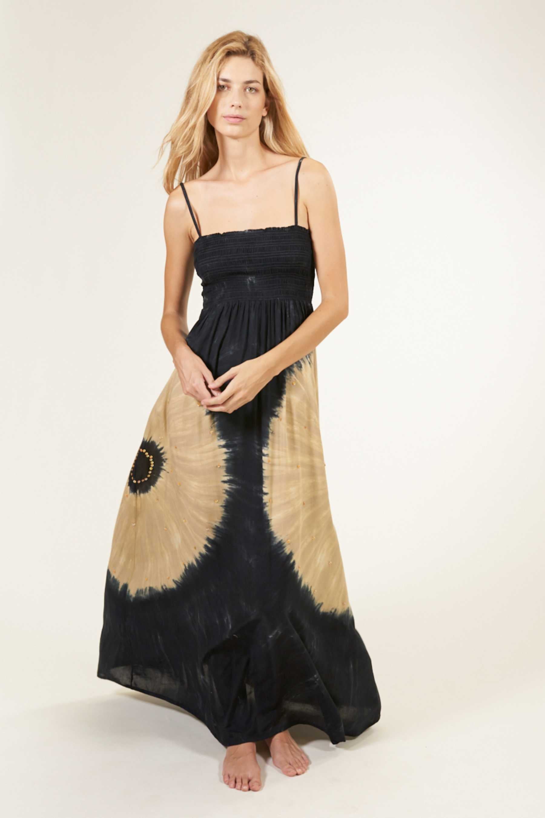 El vestido Maho es precioso y se ajusta perfectamente a cualquier tipo de silueta. Con un fruncido tipo nido de abeja en el busto que realza el pecho y estiliza la figura. Su escote recto en palabra de honor añade un toque de elegancia, ideal para cenas o paseos veraniegos y además, el tirante fino es un elemento que añade sutileza a la vez que comodidad a la prenda. Es un vestido largo, pensado para llevar con un zapato con algo de tacón. Teñido a mano con nuestra exclusiva técnica de tie dye, utilizando pigmentos naturales y métodos tradicionales.