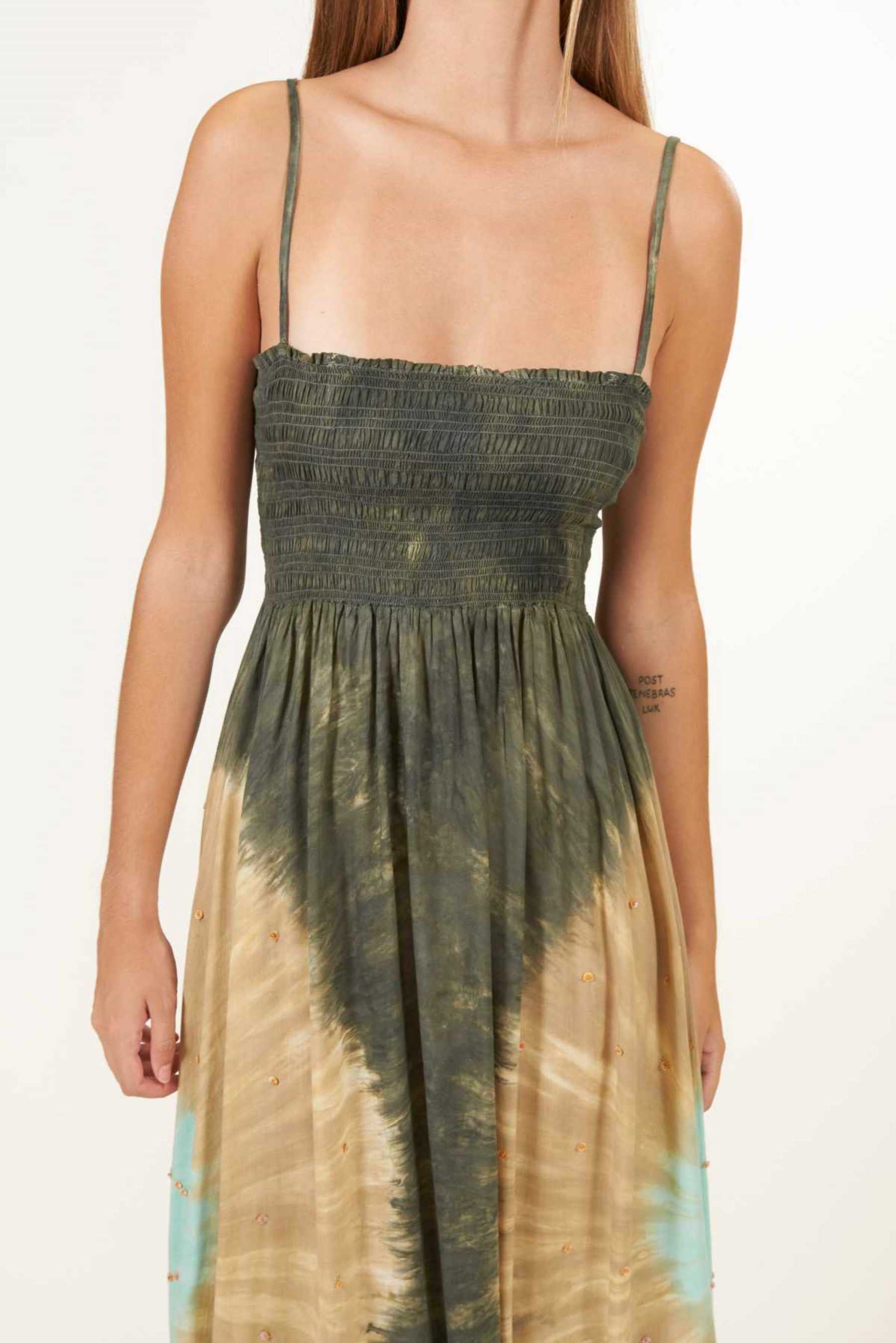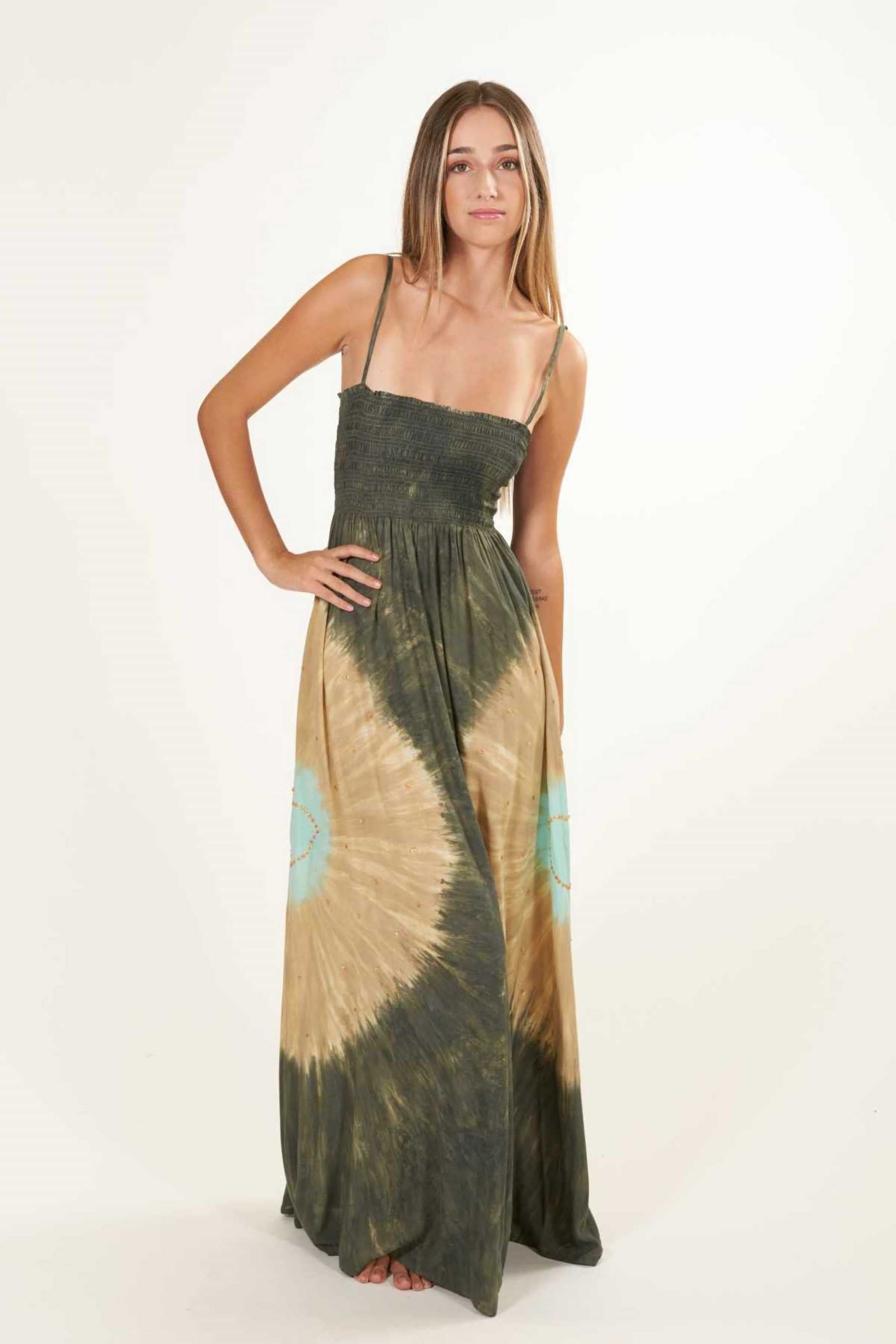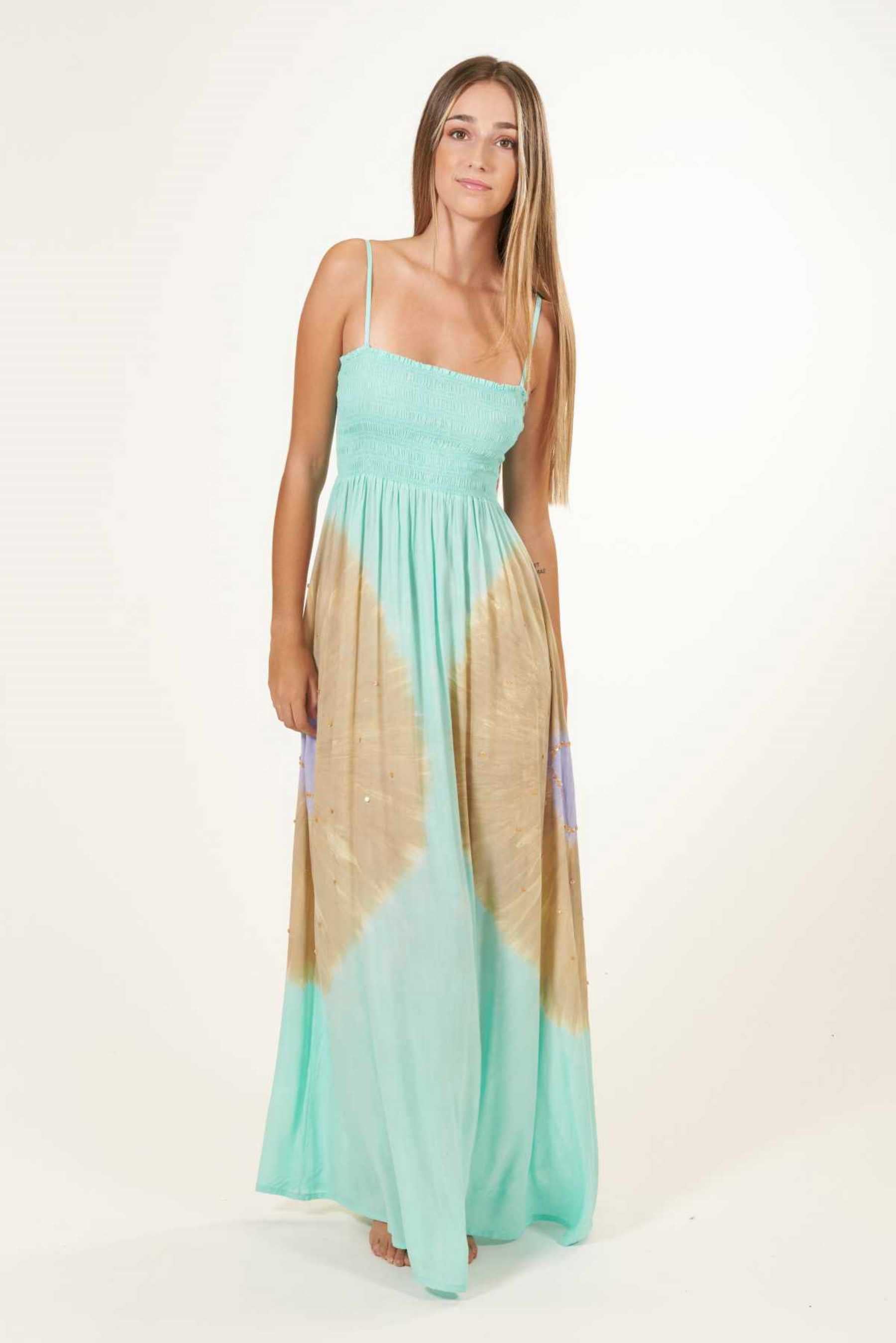El vestido Maho es precioso y se ajusta perfectamente a cualquier tipo de silueta. Con un fruncido tipo nido de abeja en el busto que realza el pecho y estiliza la figura. Su escote recto en palabra de honor añade un toque de elegancia, ideal para cenas o paseos veraniegos y además, el tirante fino es un elemento que añade sutileza a la vez que comodidad a la prenda. Es un vestido largo, pensado para llevar con un zapato con algo de tacón. Teñido a mano con nuestra exclusiva técnica de tie dye, utilizando pigmentos naturales y métodos tradicionales.