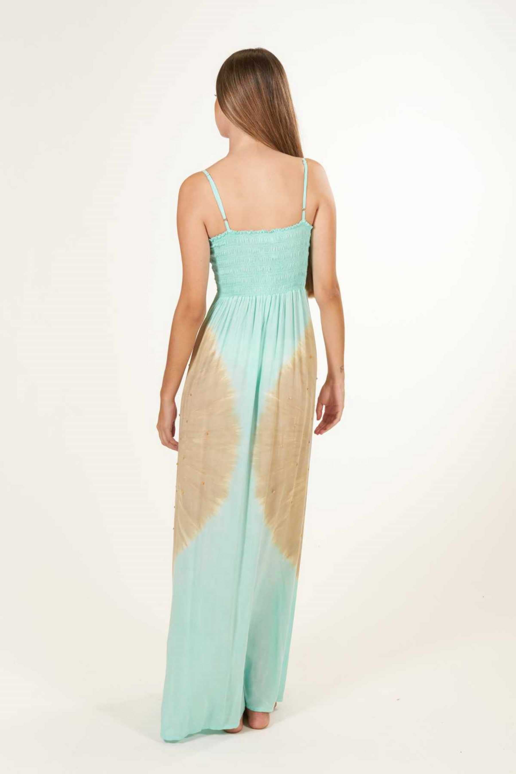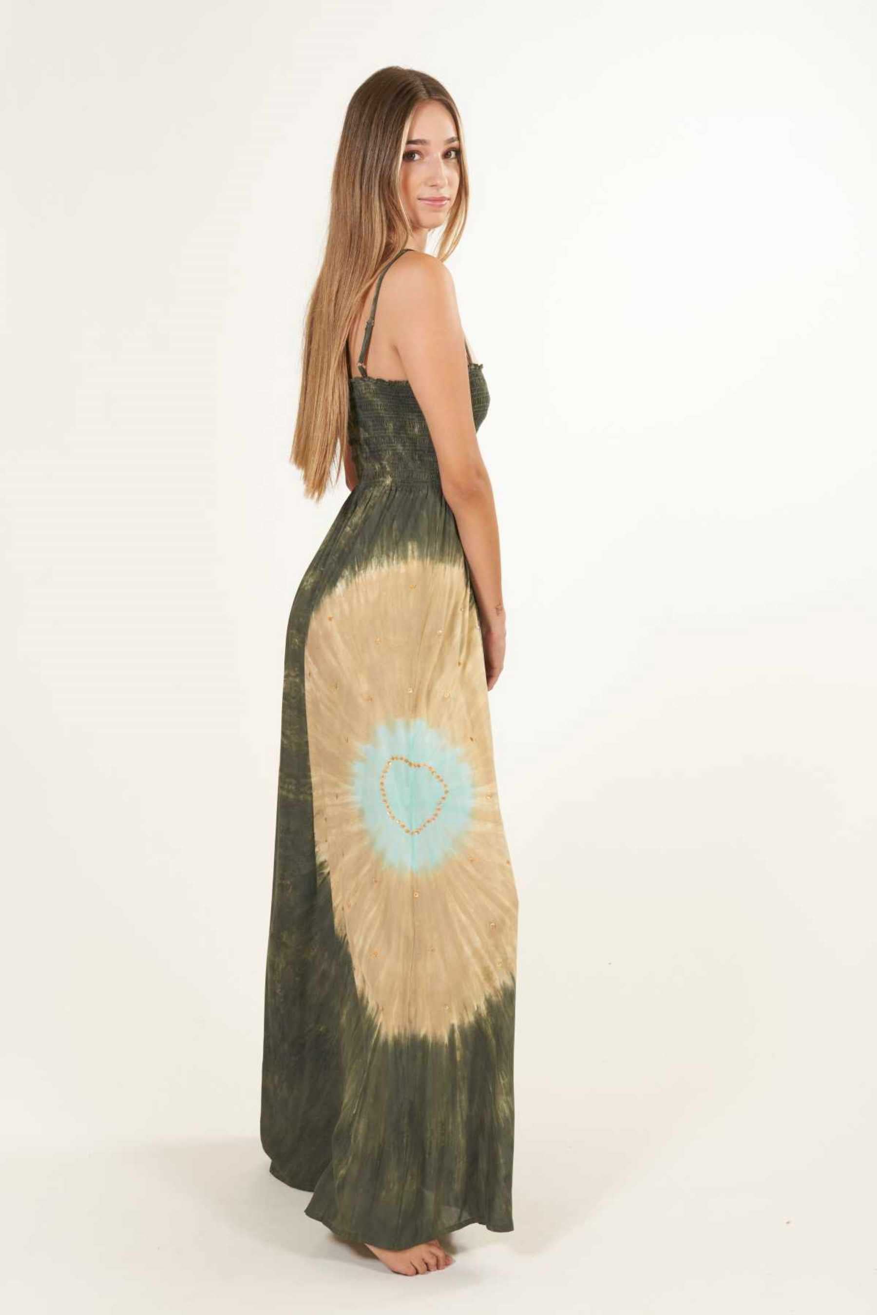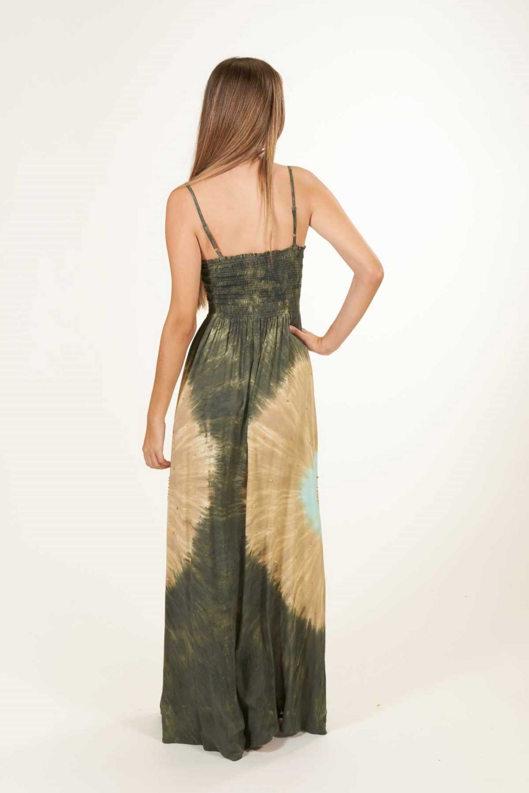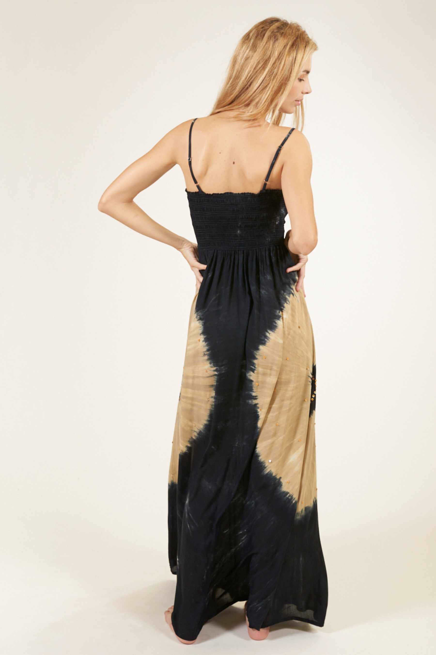 El vestido Maho es precioso y se ajusta perfectamente a cualquier tipo de silueta. Con un fruncido tipo nido de abeja en el busto que realza el pecho y estiliza la figura. Su escote recto en palabra de honor añade un toque de elegancia, ideal para cenas o paseos veraniegos y además, el tirante fino es un elemento que añade sutileza a la vez que comodidad a la prenda. Es un vestido largo, pensado para llevar con un zapato con algo de tacón. Teñido a mano con nuestra exclusiva técnica de tie dye, utilizando pigmentos naturales y métodos tradicionales.