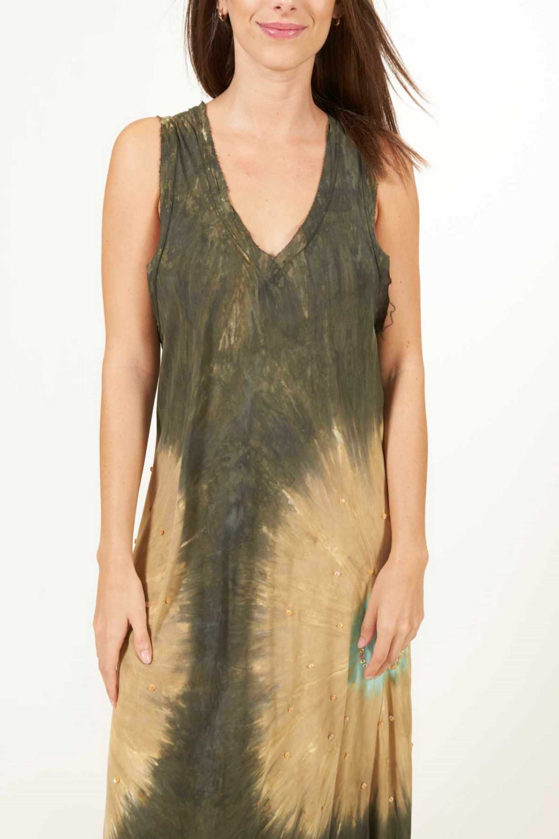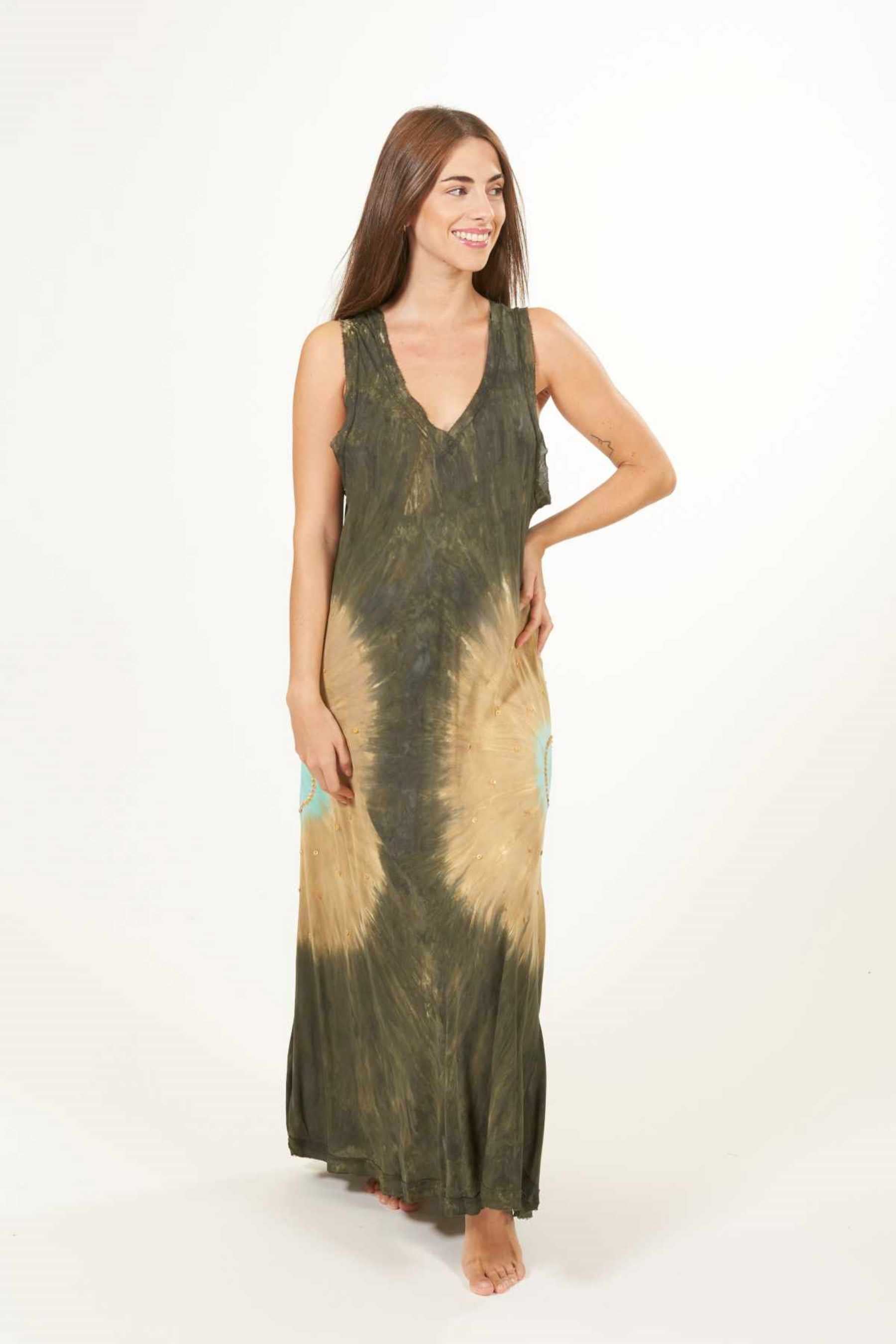Vestido de corte muy cómodo: recto, un poco evasé a partir de la cadera que lo hace una prenda favorecedora que a la vez que fácil de llevar. Tiene tirantes anchos y escote de pico. Terminaciones deshilachadas en todo el contorno de tirantes, sisa y bajo. Largo tobillero.