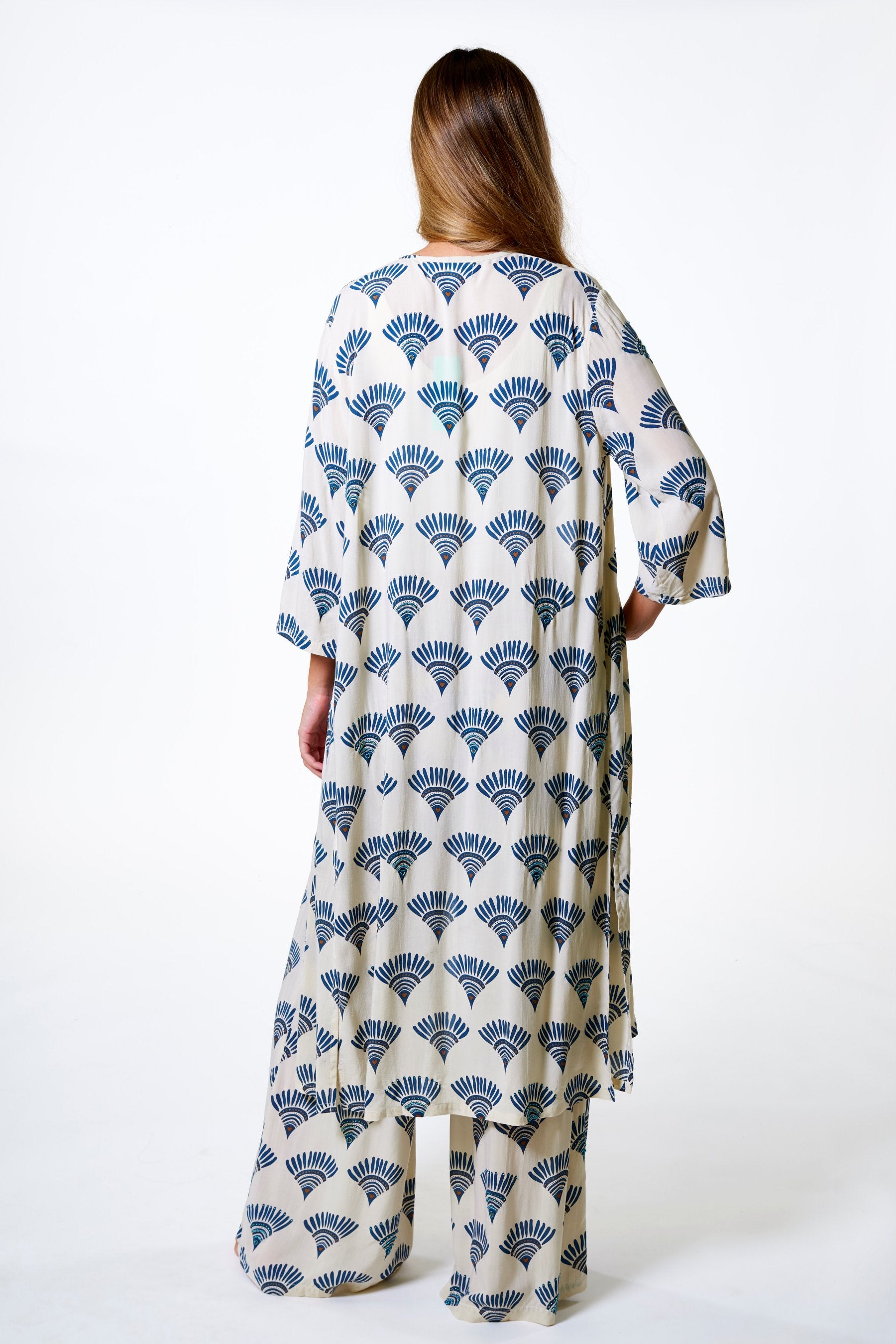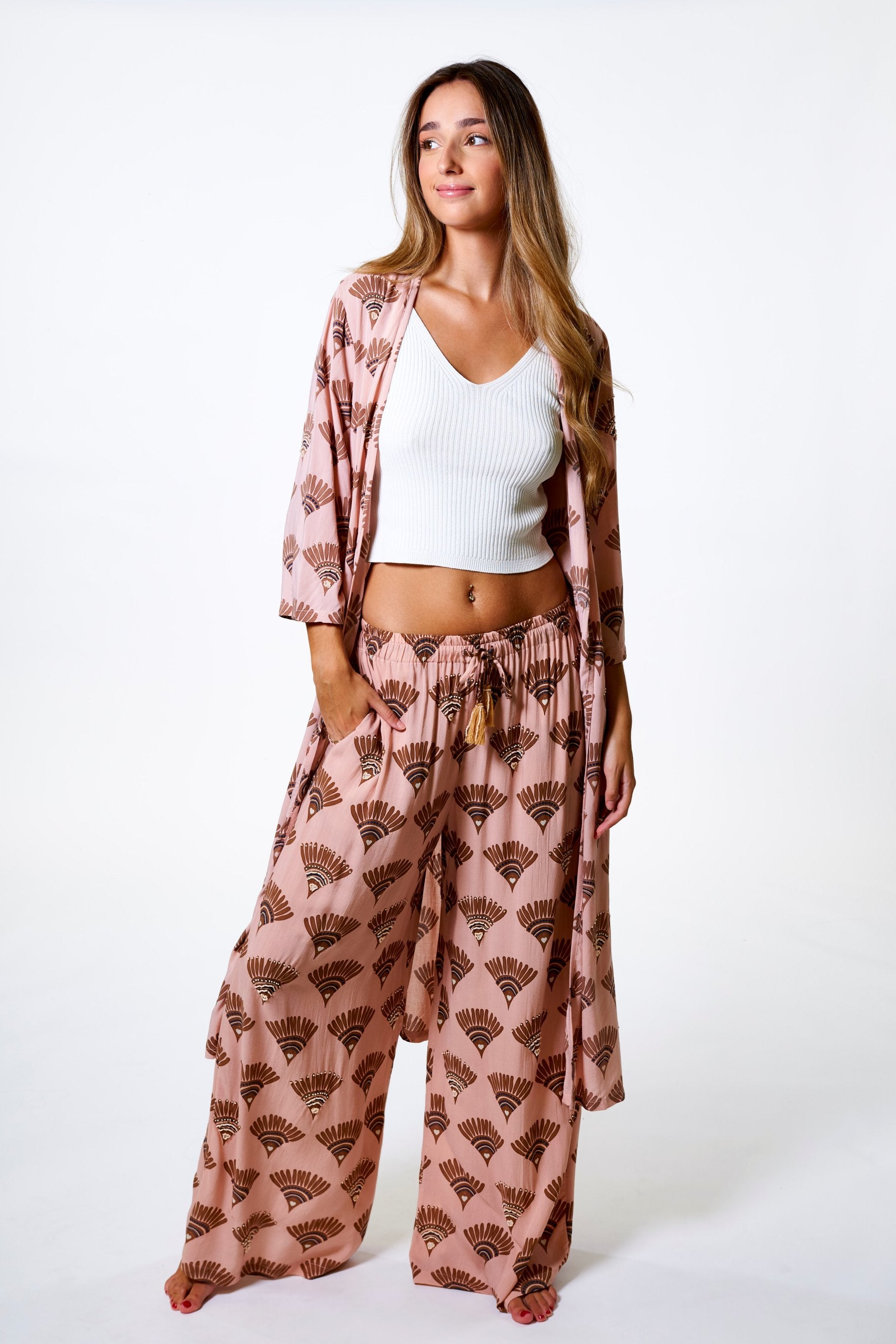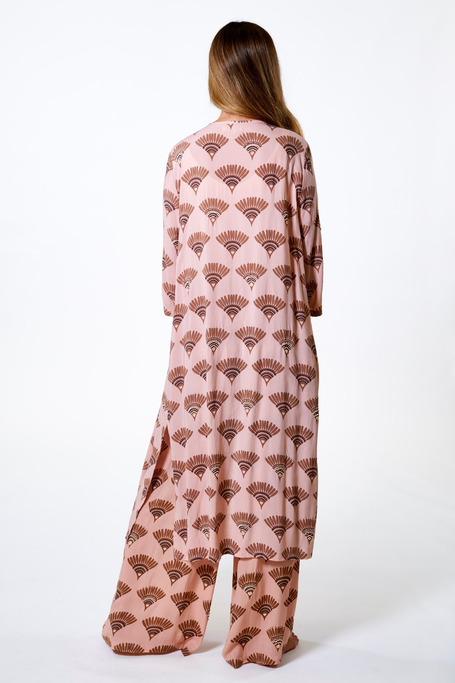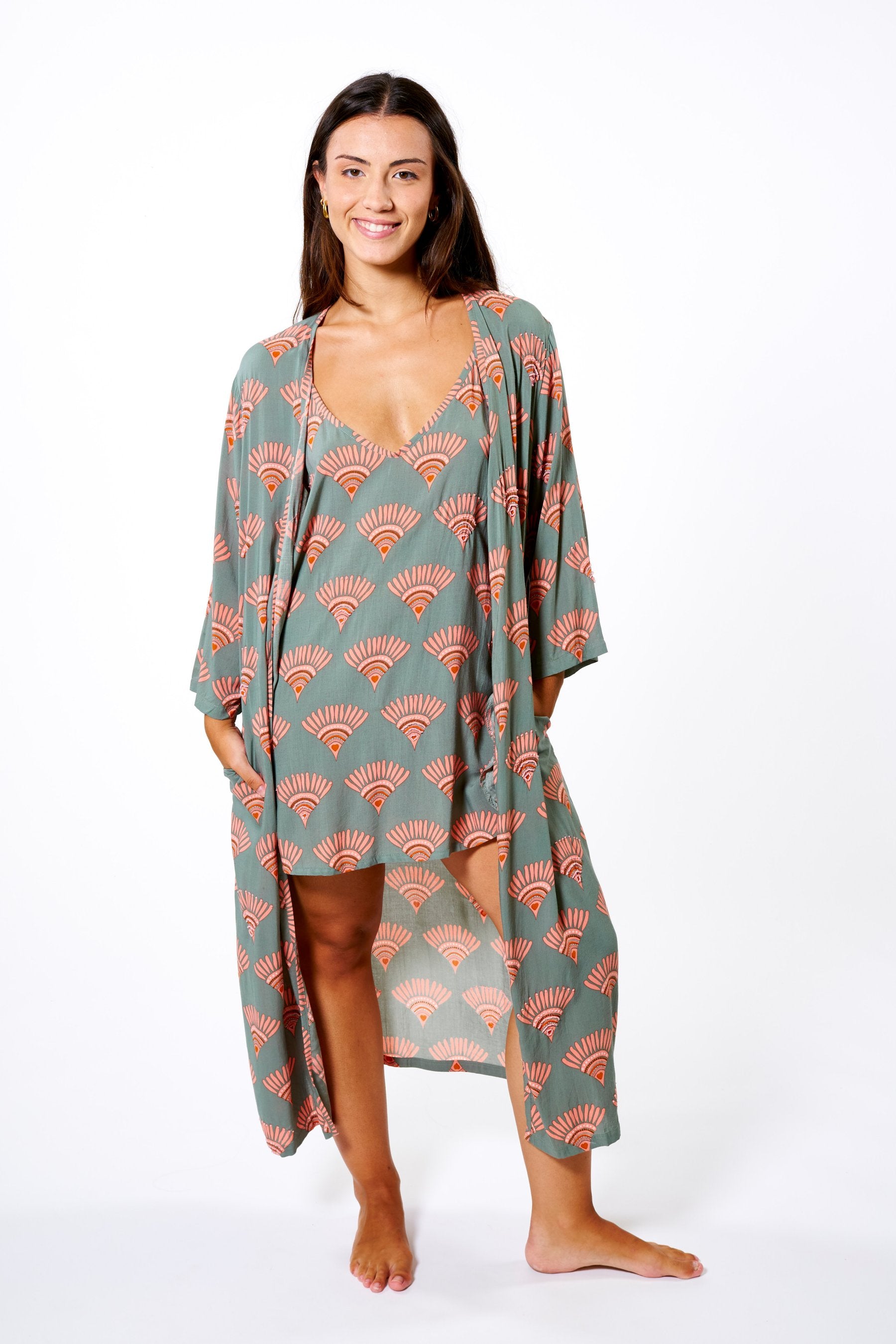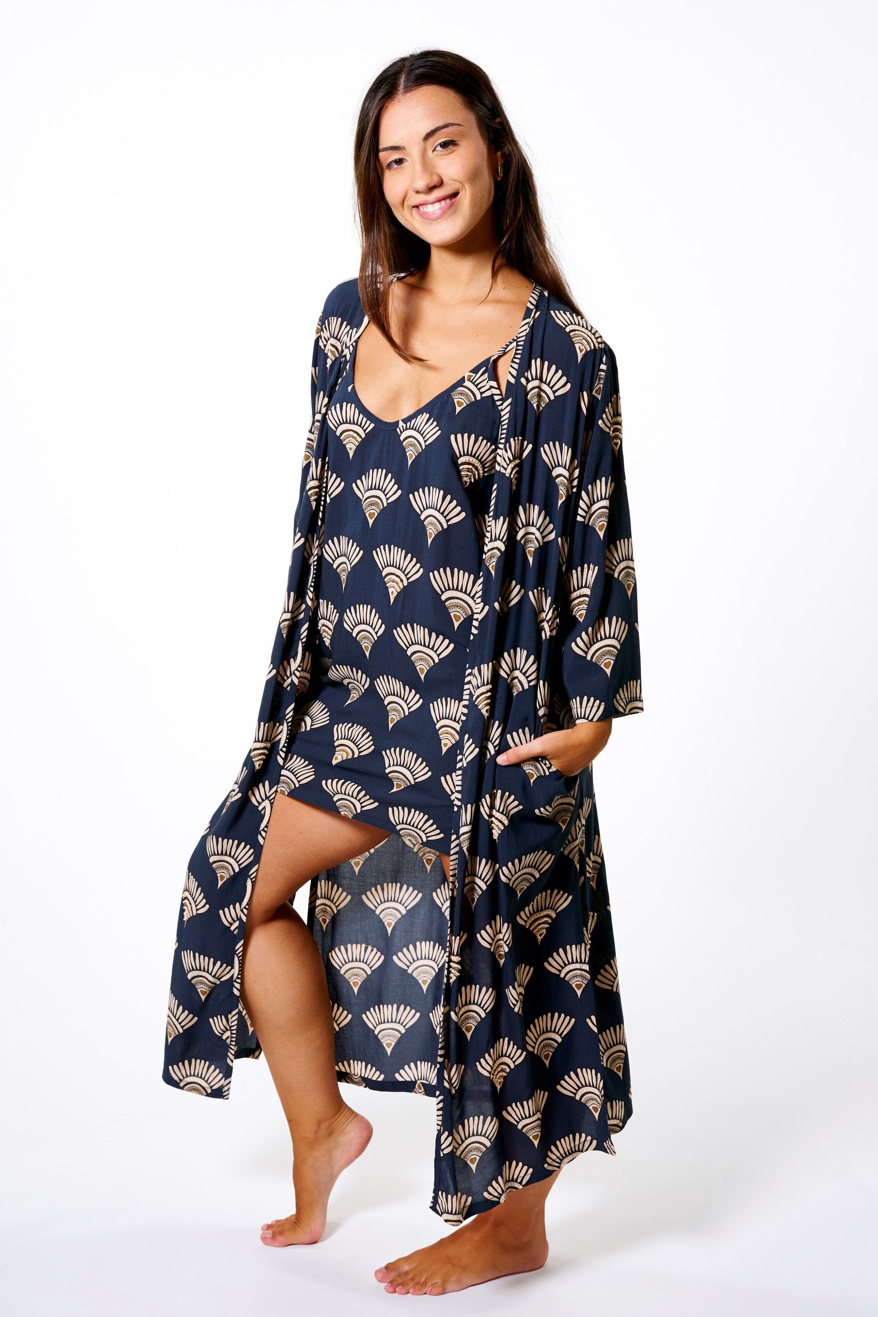 El Kimono Baing es la pieza perfecta para añadir un toque elegante y bohemio a cualquier outfit. Su diseño fluido y sus tonos neutros lo convierten en un imprescindible para esta temporada. Las formas del estampado están decoradas aleatoriamente con pequeñas cuentas que delinean su silueta en contraste, aportando un detalle artesanal que resalta la frescura y la elegancia natural de la prenda.