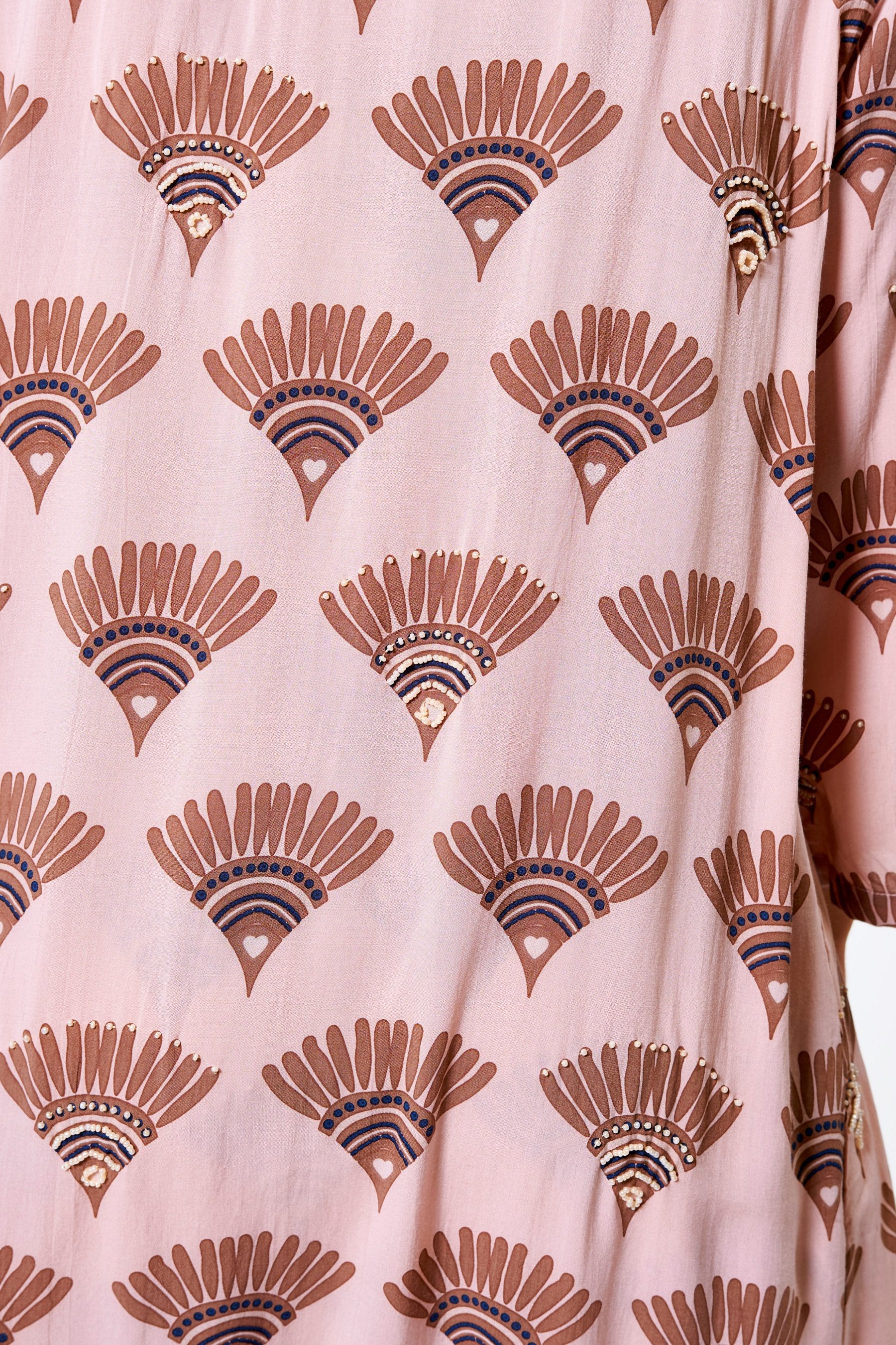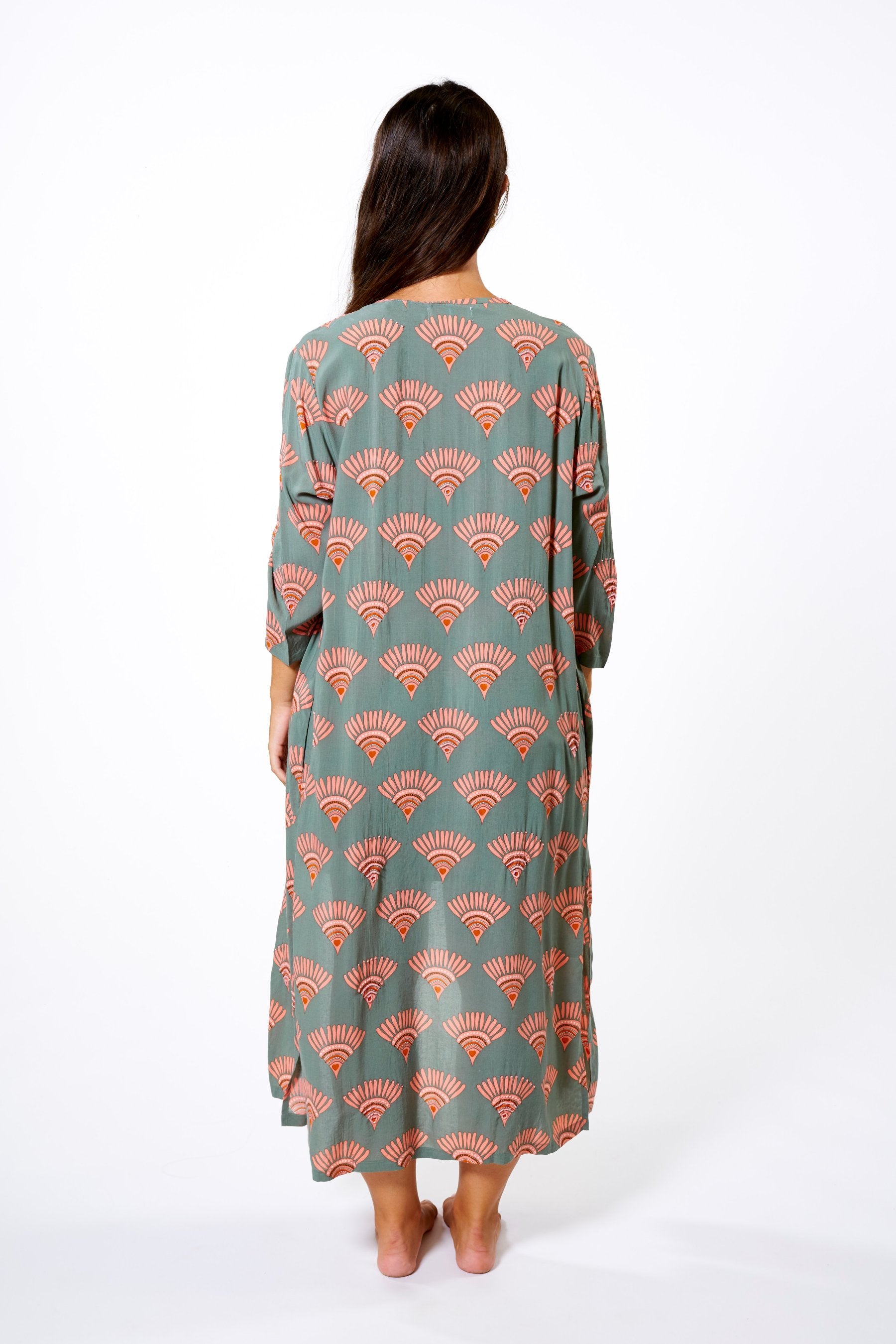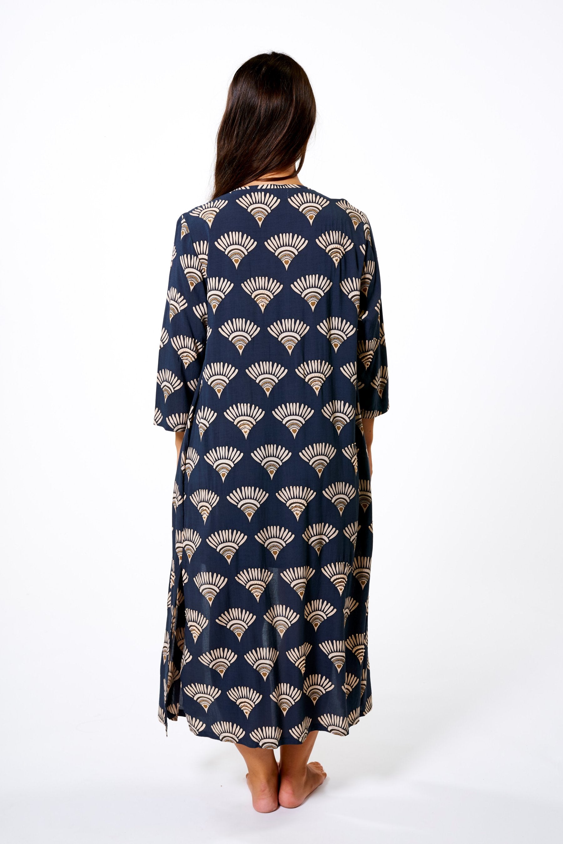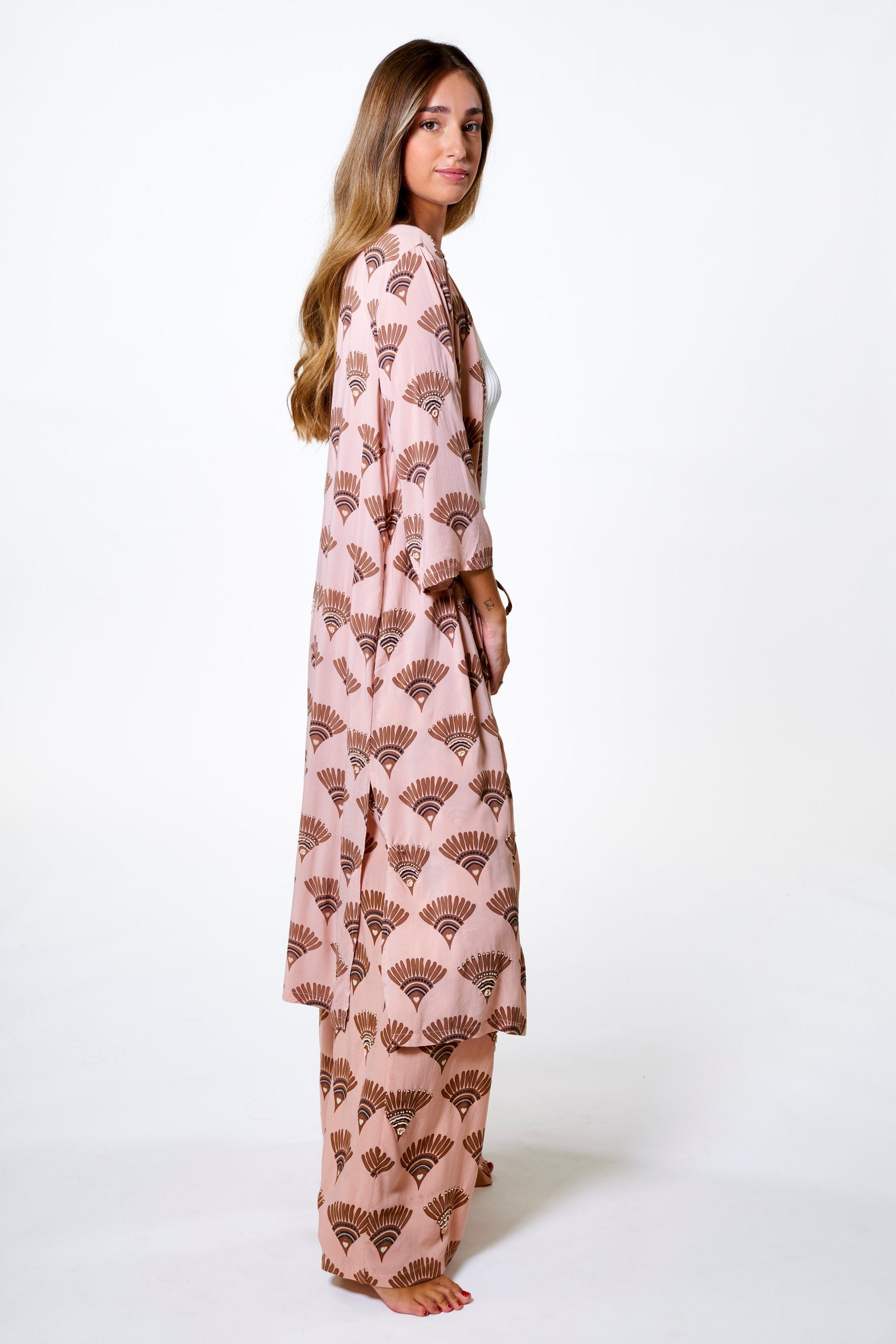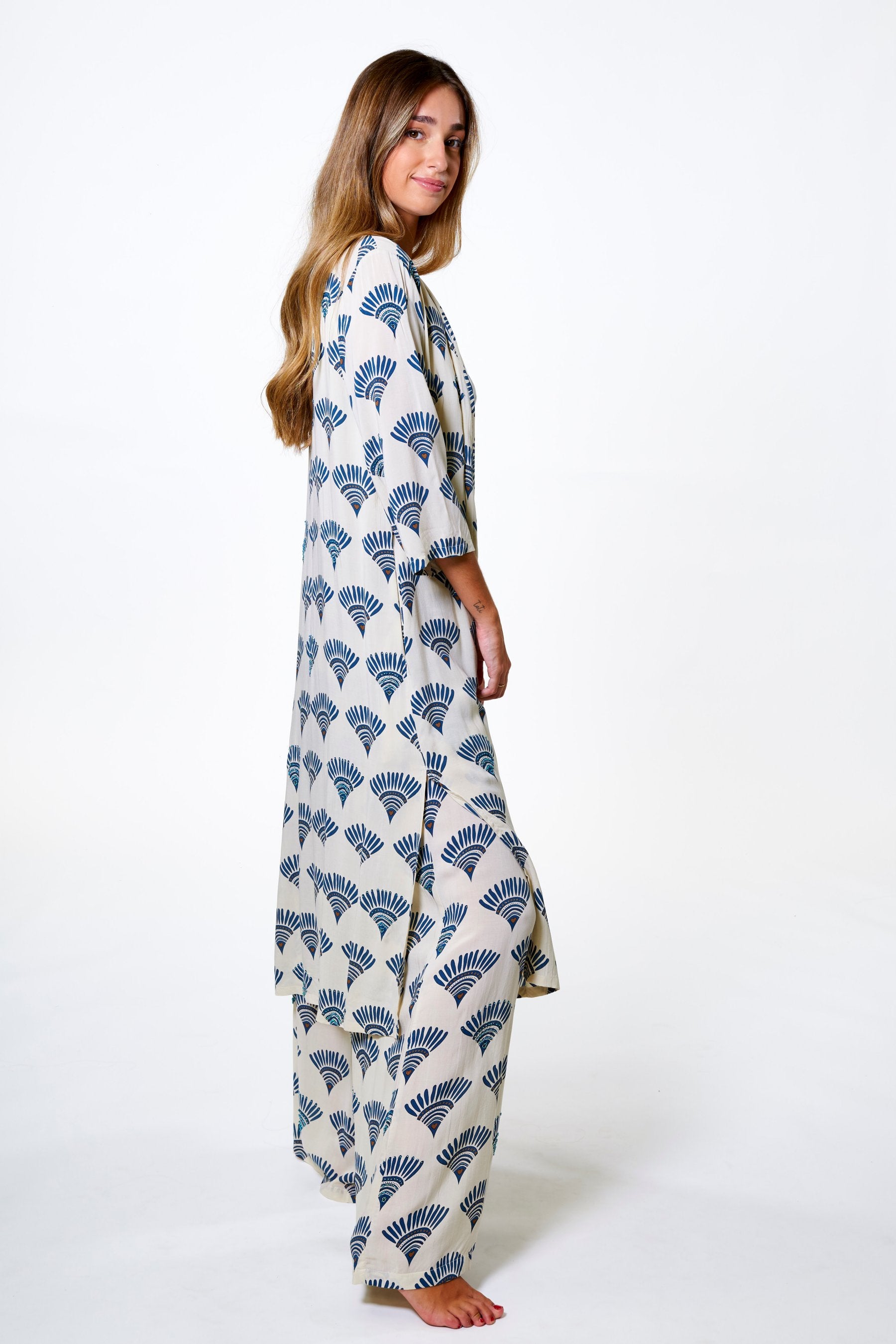 El Kimono Baing es la pieza perfecta para añadir un toque elegante y bohemio a cualquier outfit. Su diseño fluido y sus tonos neutros lo convierten en un imprescindible para esta temporada. Las formas del estampado están decoradas aleatoriamente con pequeñas cuentas que delinean su silueta en contraste, aportando un detalle artesanal que resalta la frescura y la elegancia natural de la prenda.
