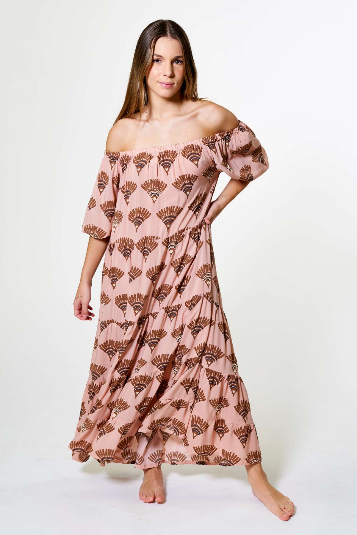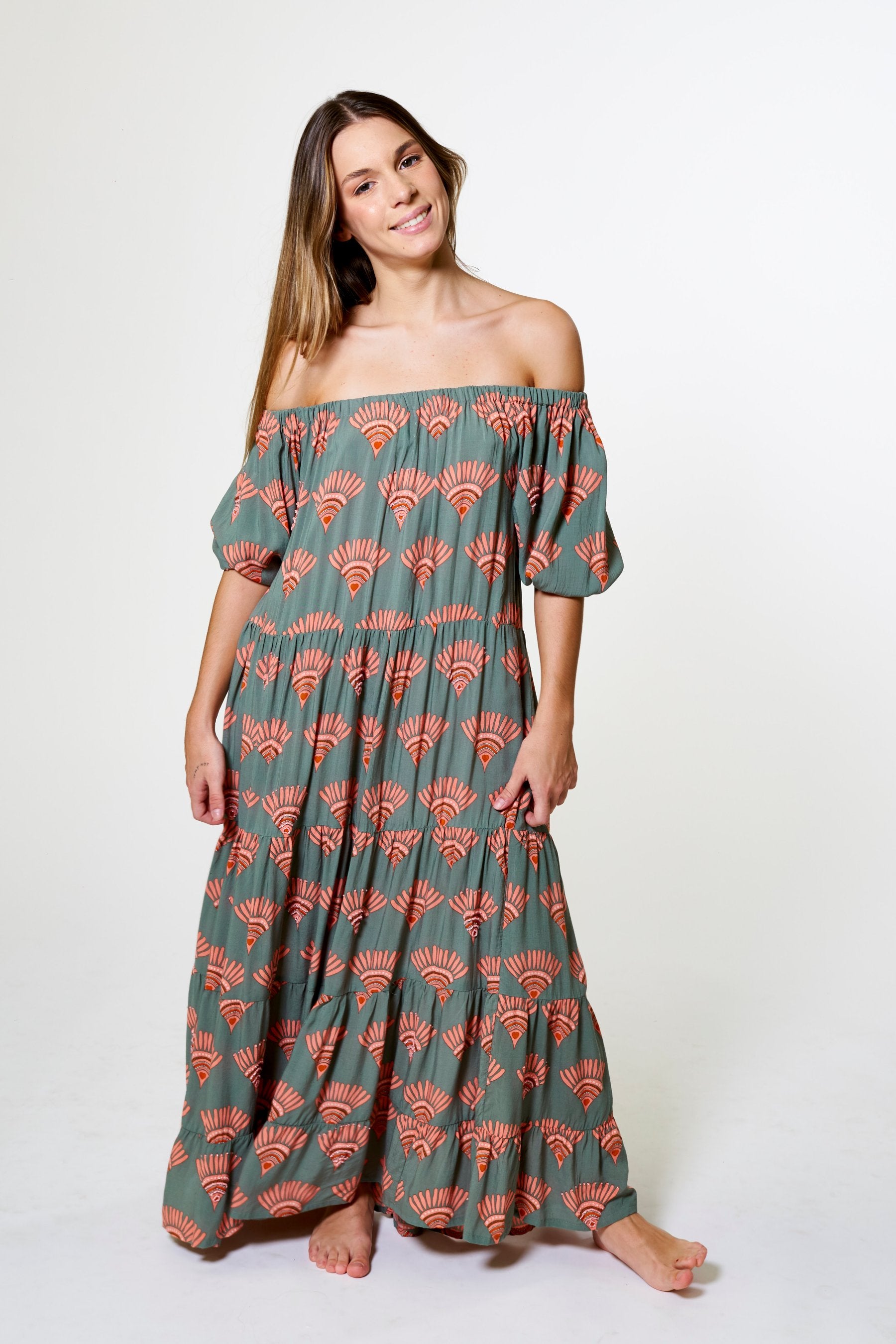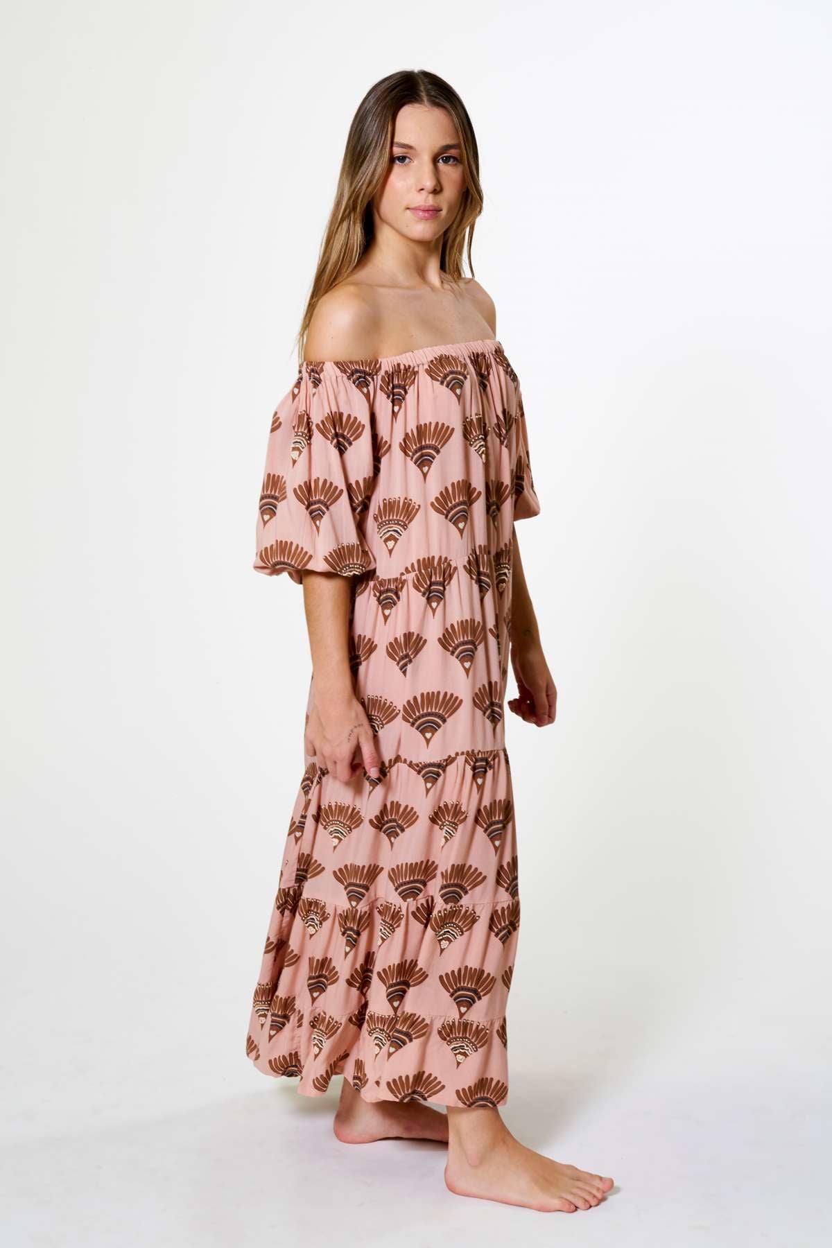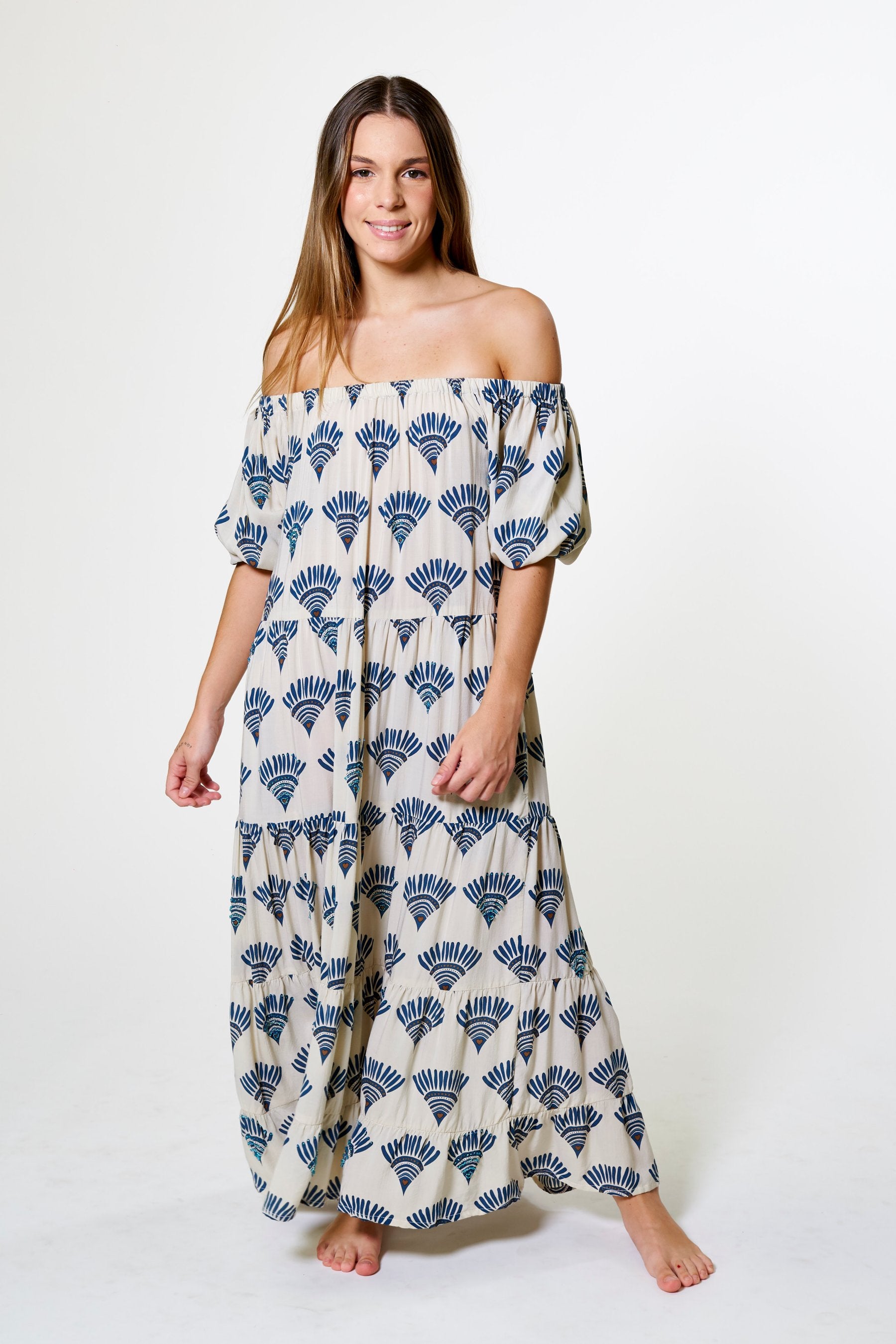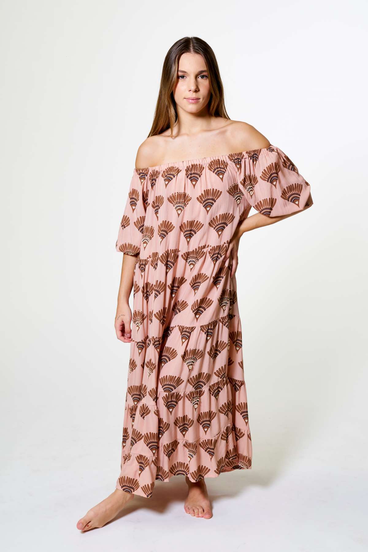 El Long Dress Bondi es un vestido largo de inspiración boho con un corte fluido y femenino. Su diseño liviano, sus tonos naturales y el estampado exclusivo de la colección con sus formas decoradas aleatoriamente con pequeñas cuentas que delinean su silueta en contraste, aportando un detalle artesanal que resalta la frescura y la elegancia natural de la prenda, lo convierten en una opción imprescindible para la temporada.
