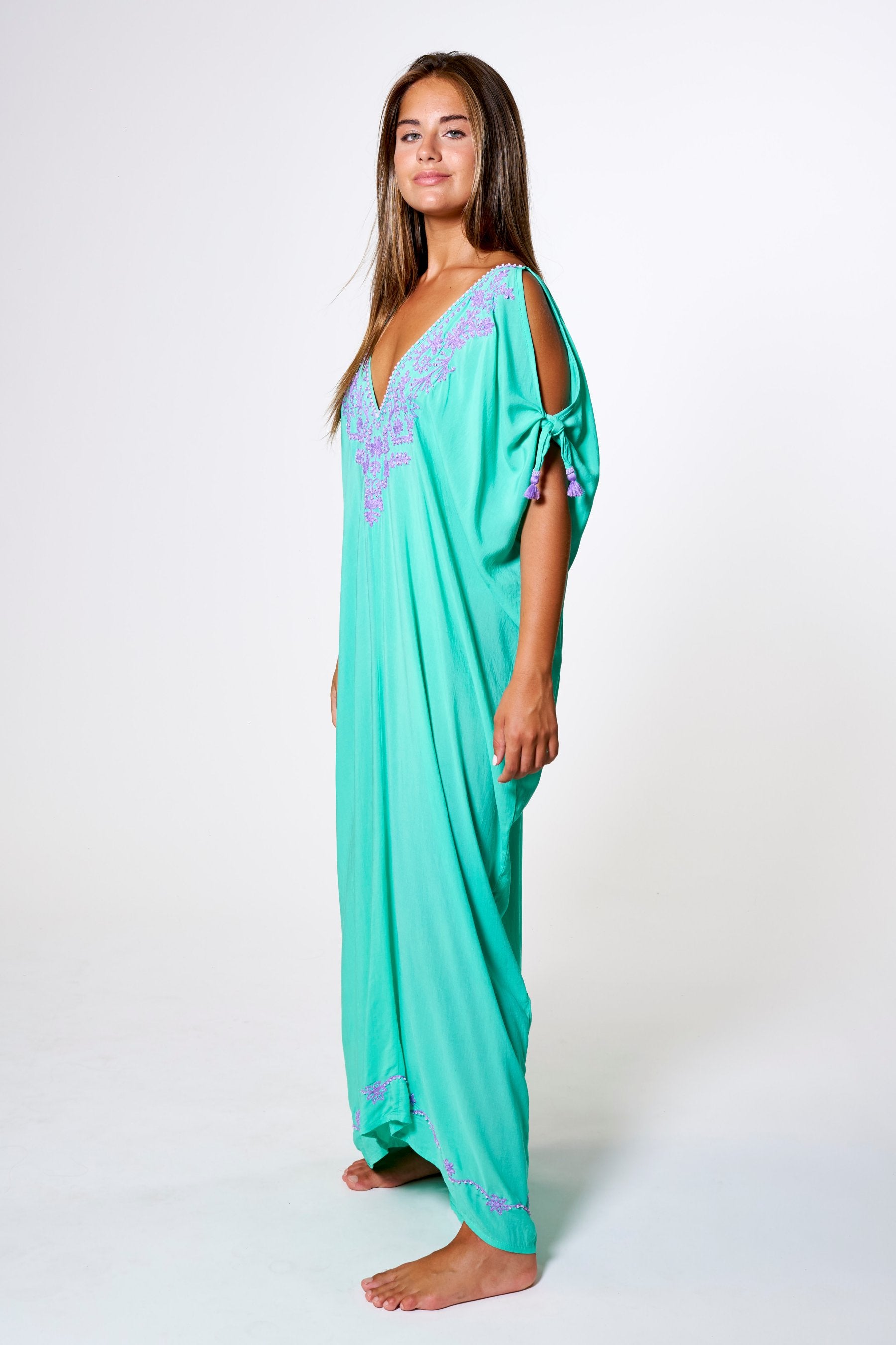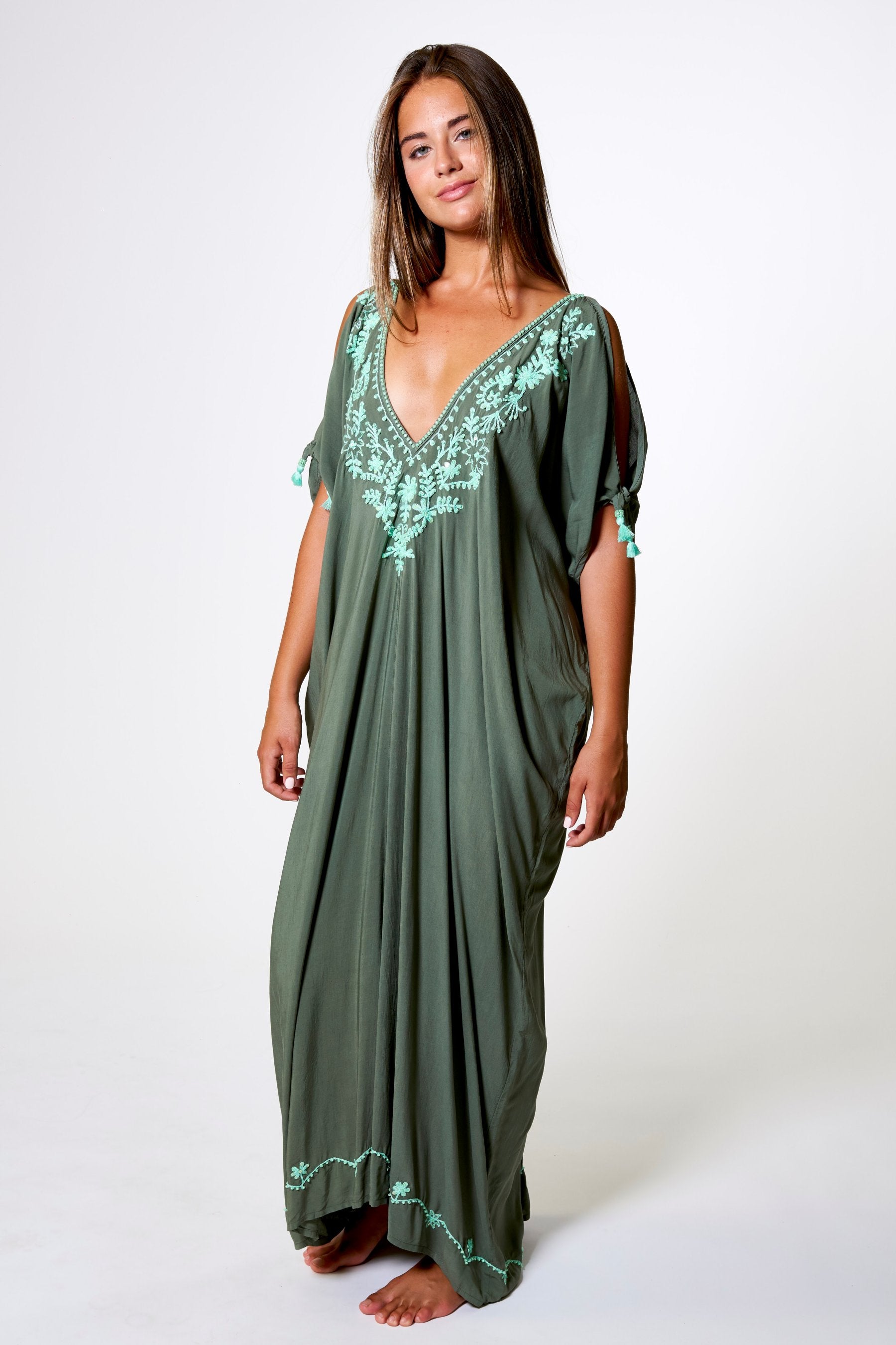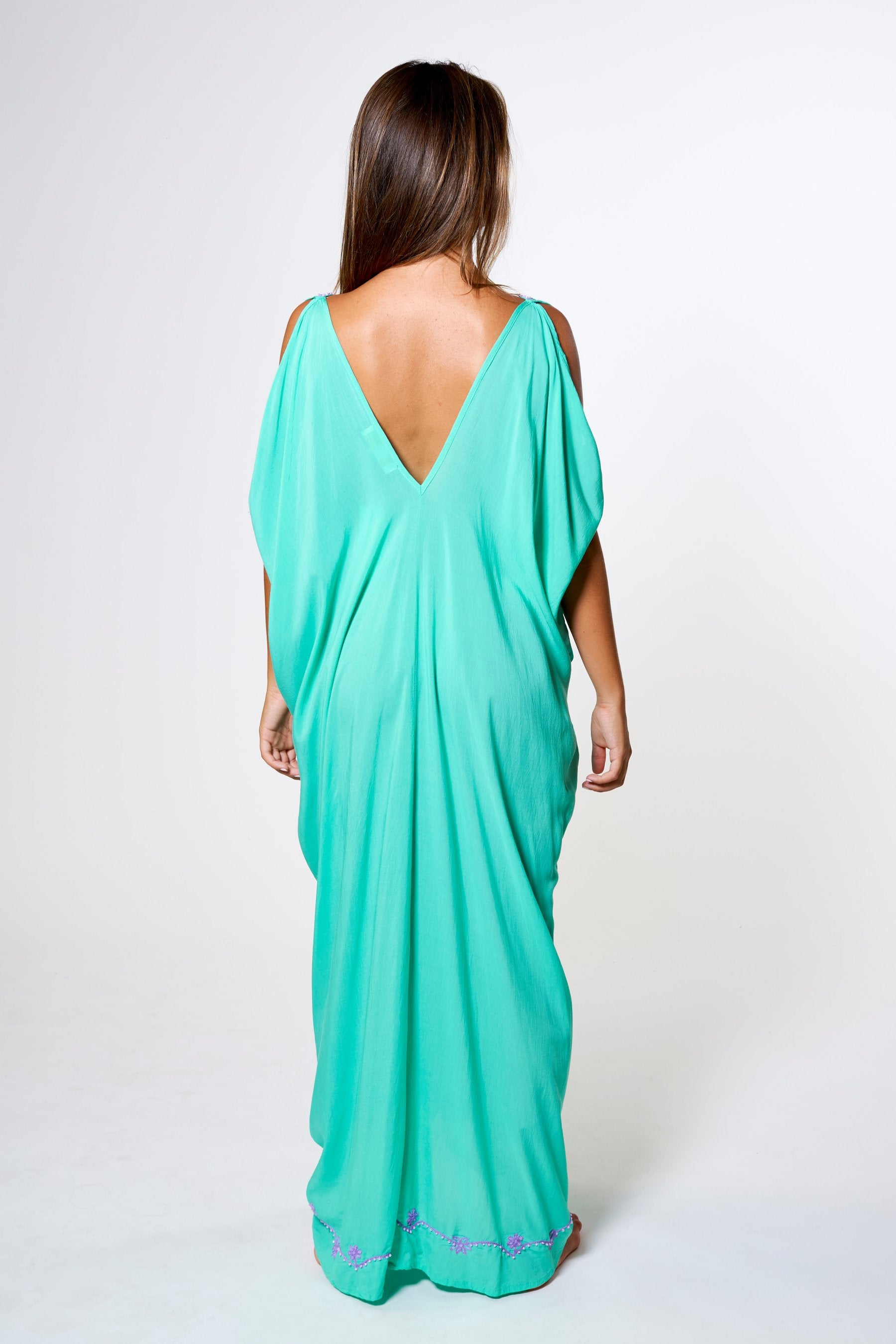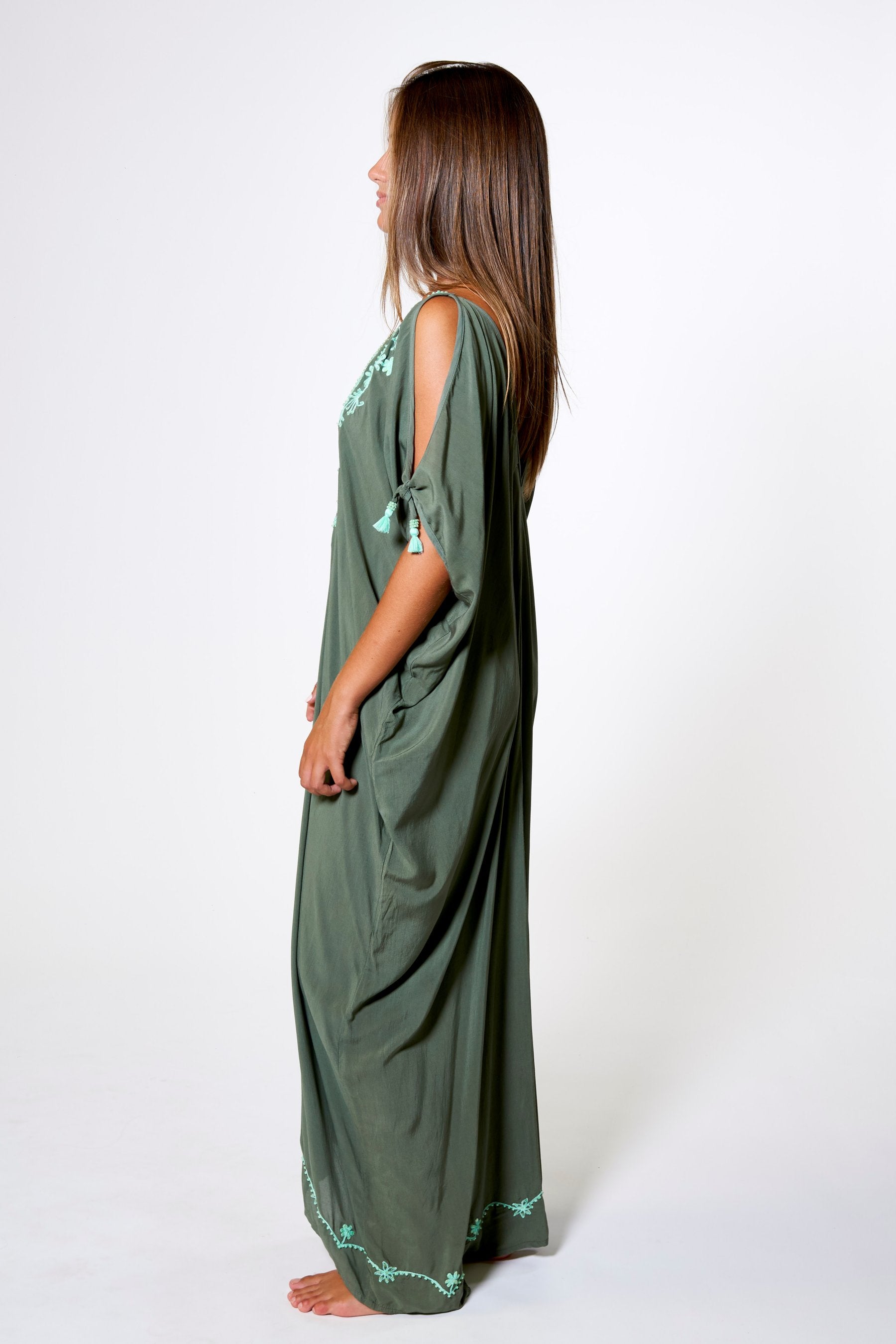 Vestido largo estilo caftán que destaca por su diseño holgado y elegante. Sus mangas, que dejan el brazo prácticamente al descubierto y se ajustan con una lazada justo por encima del codo, aportan un toque distintivo. El escote en forma de V, tanto en el pecho como en la espalda, realza la silueta, mientras que los bordados a contraste que adornan el contorno del escote y el bajo añaden un detalle sofisticado. Además, el vestido se presenta en los nuevos colores de la temporada, y sus bordados exclusivos han sido diseñados en Barcelona y bordados artesanalmente en Bali, reflejando una fusión de culturas y tendencias.