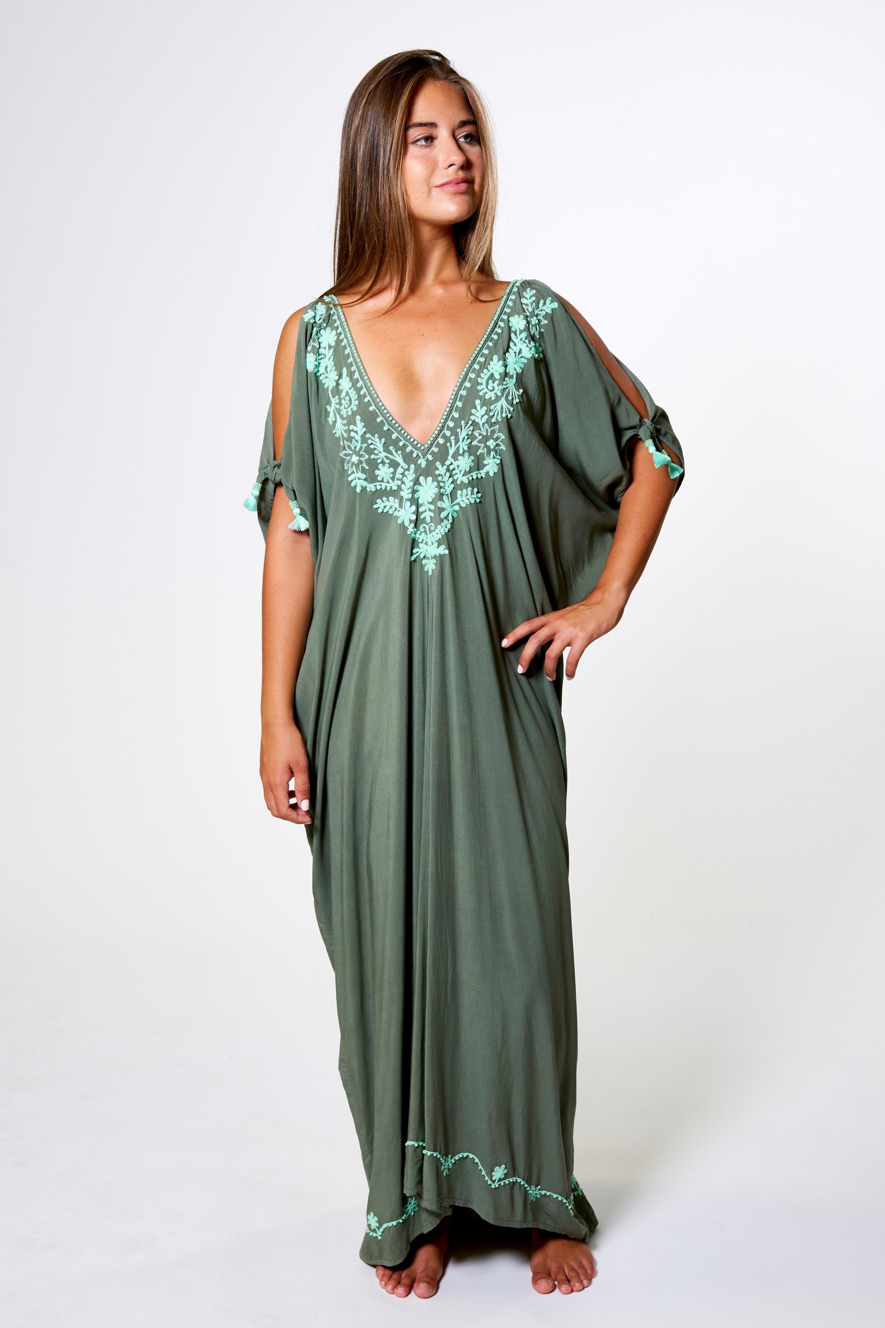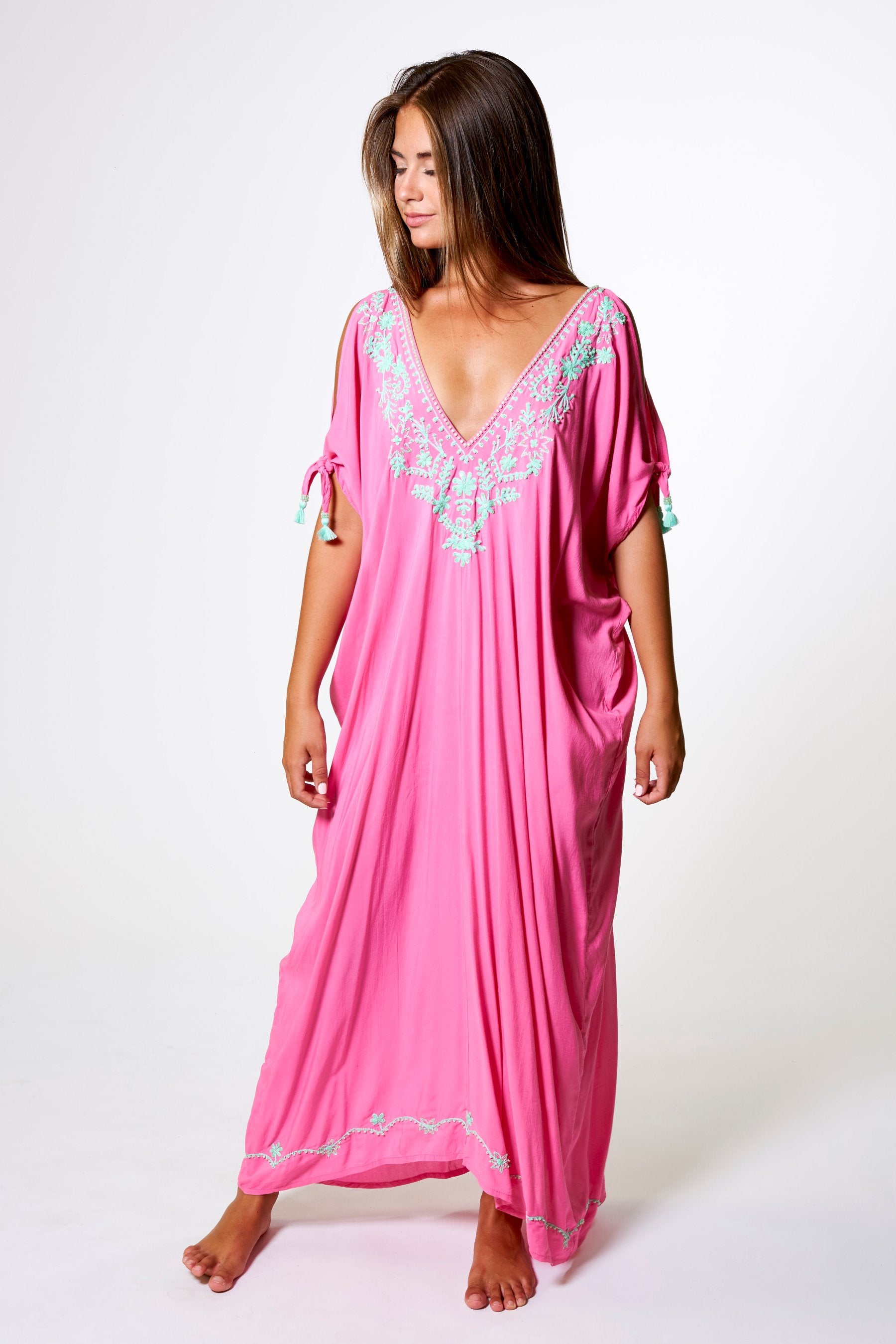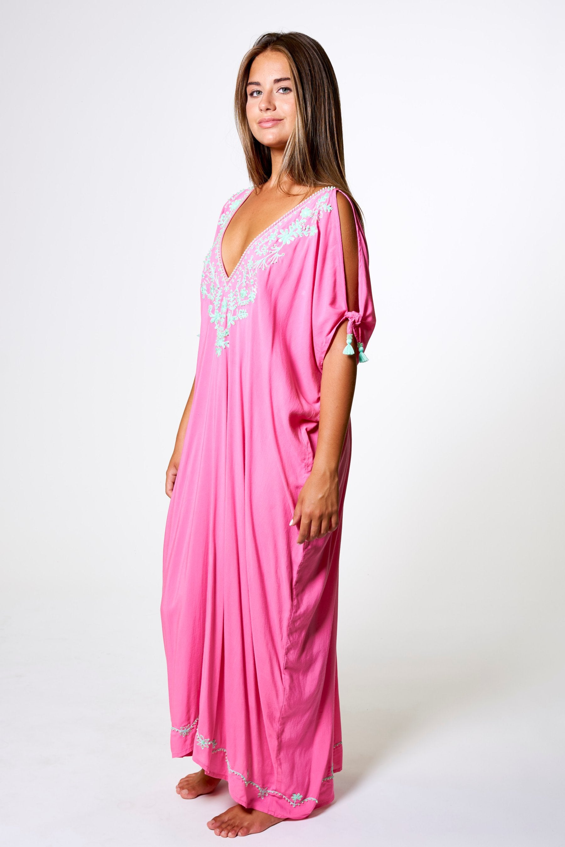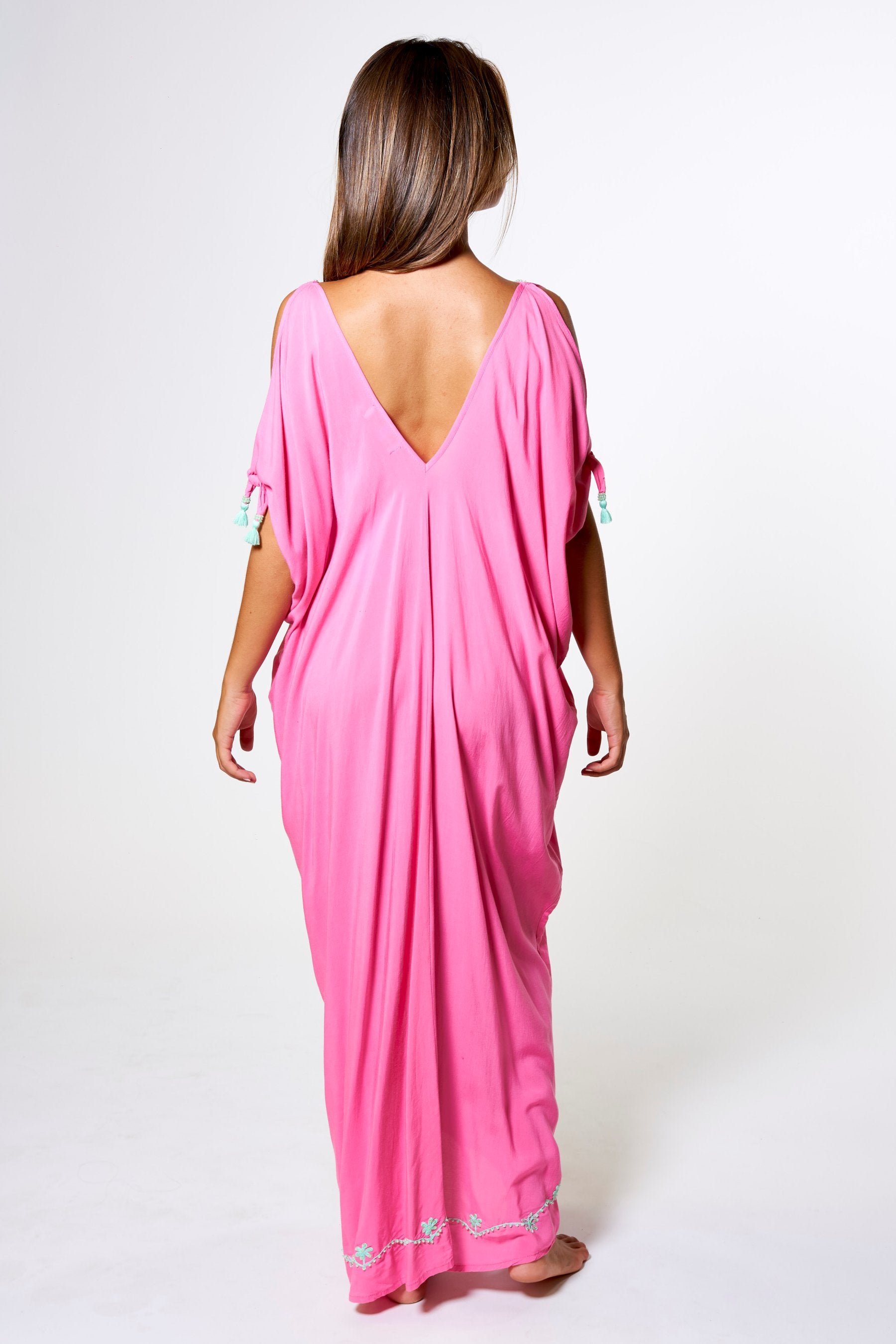 Vestido largo estilo caftán que destaca por su diseño holgado y elegante. Sus mangas, que dejan el brazo prácticamente al descubierto y se ajustan con una lazada justo por encima del codo, aportan un toque distintivo. El escote en forma de V, tanto en el pecho como en la espalda, realza la silueta, mientras que los bordados a contraste que adornan el contorno del escote y el bajo añaden un detalle sofisticado. Además, el vestido se presenta en los nuevos colores de la temporada, y sus bordados exclusivos han sido diseñados en Barcelona y bordados artesanalmente en Bali, reflejando una fusión de culturas y tendencias.