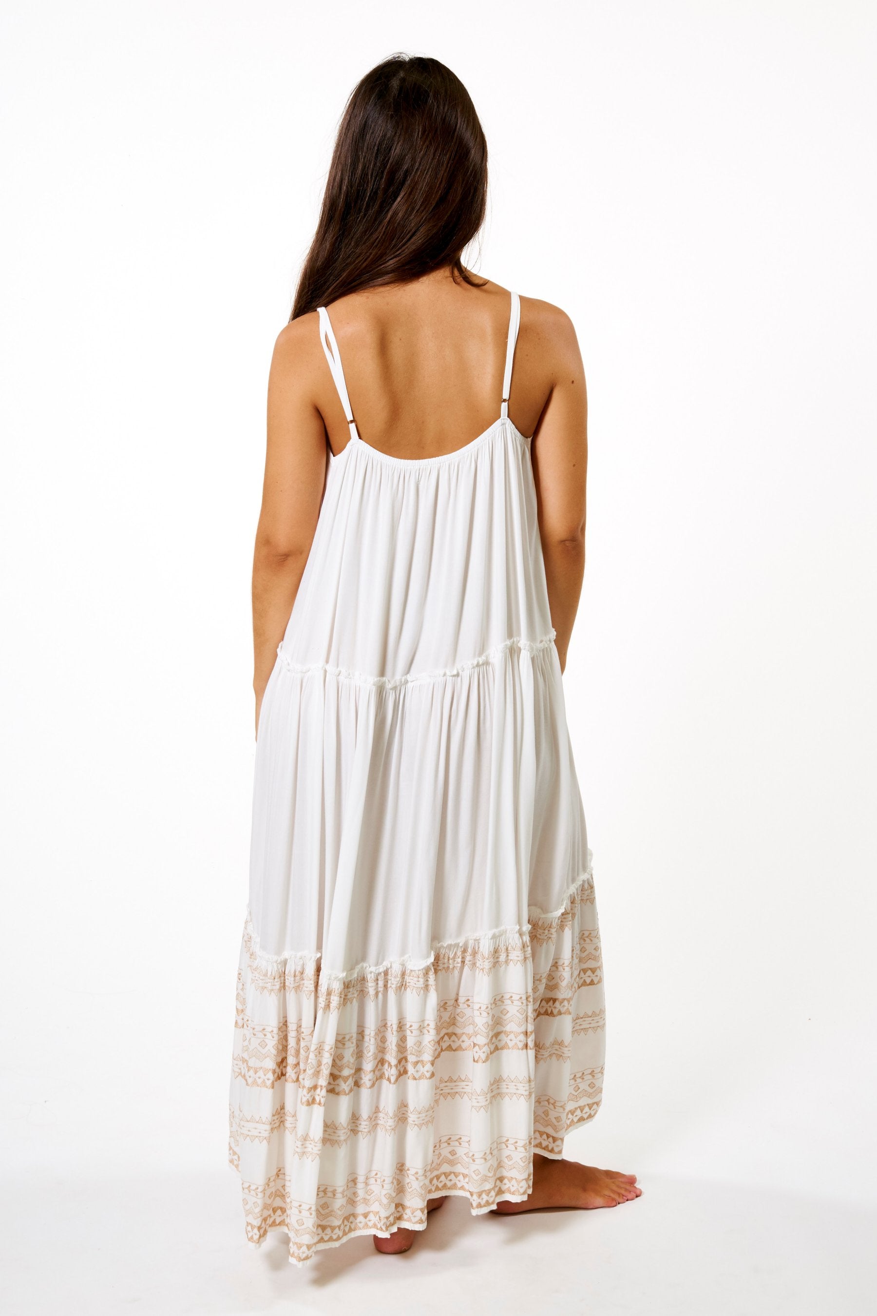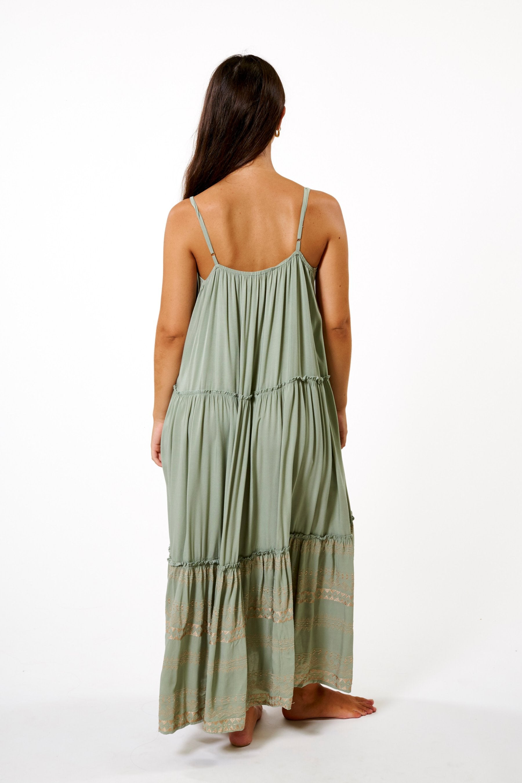 Diseño largo y vaporoso, con detalles bordados.