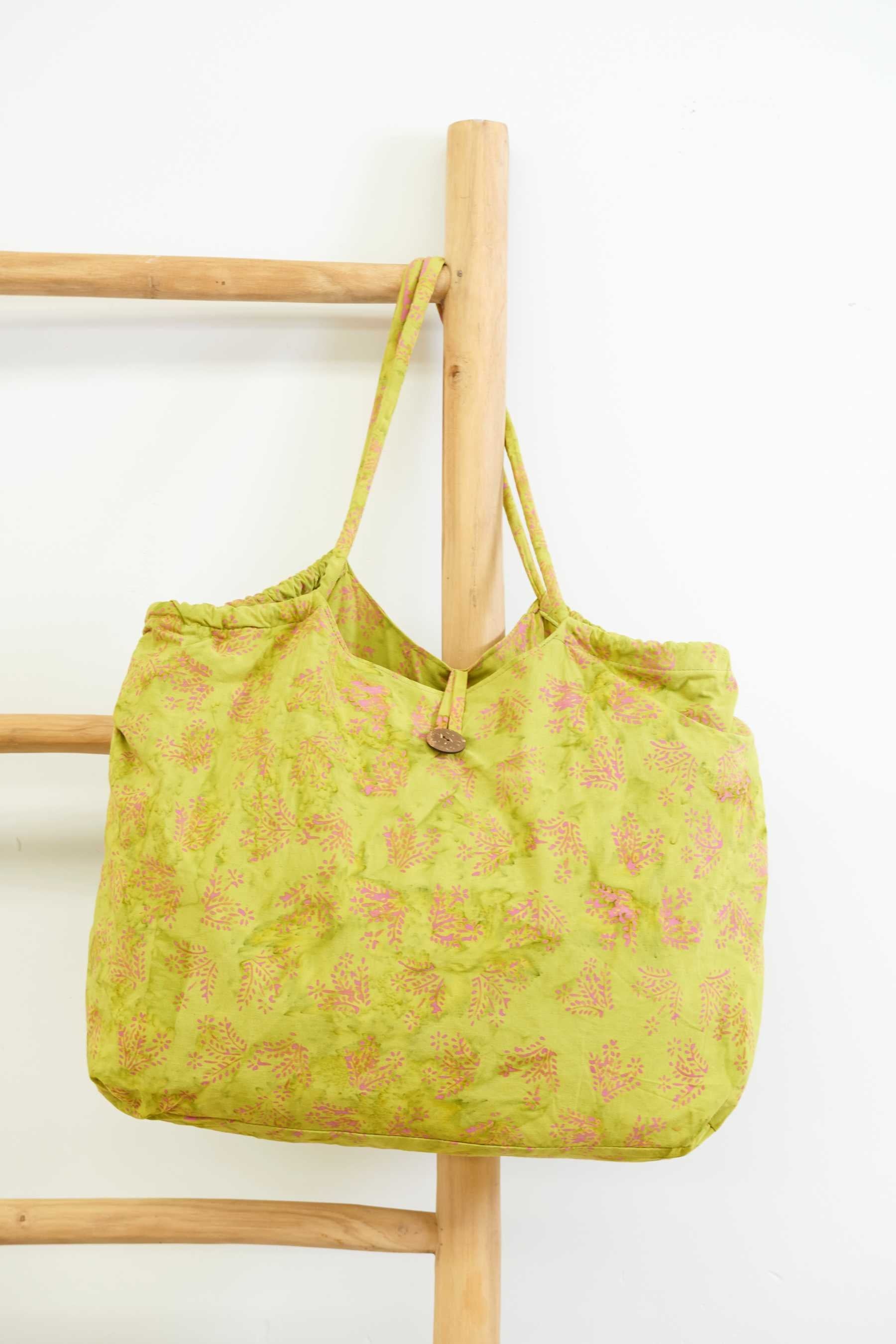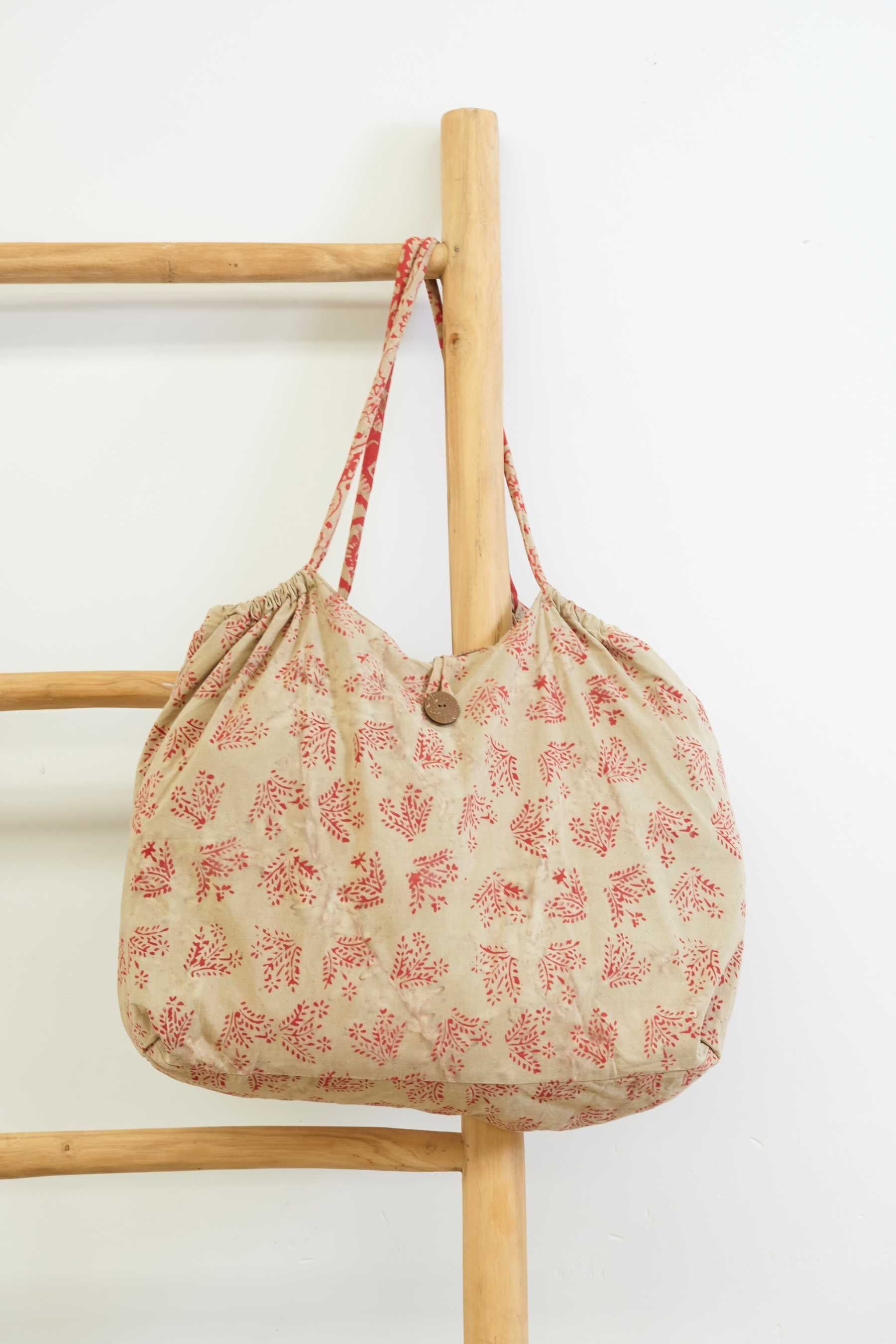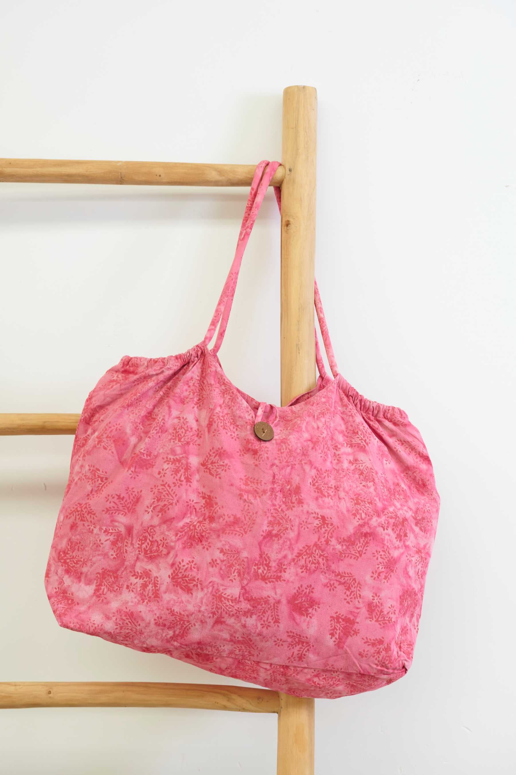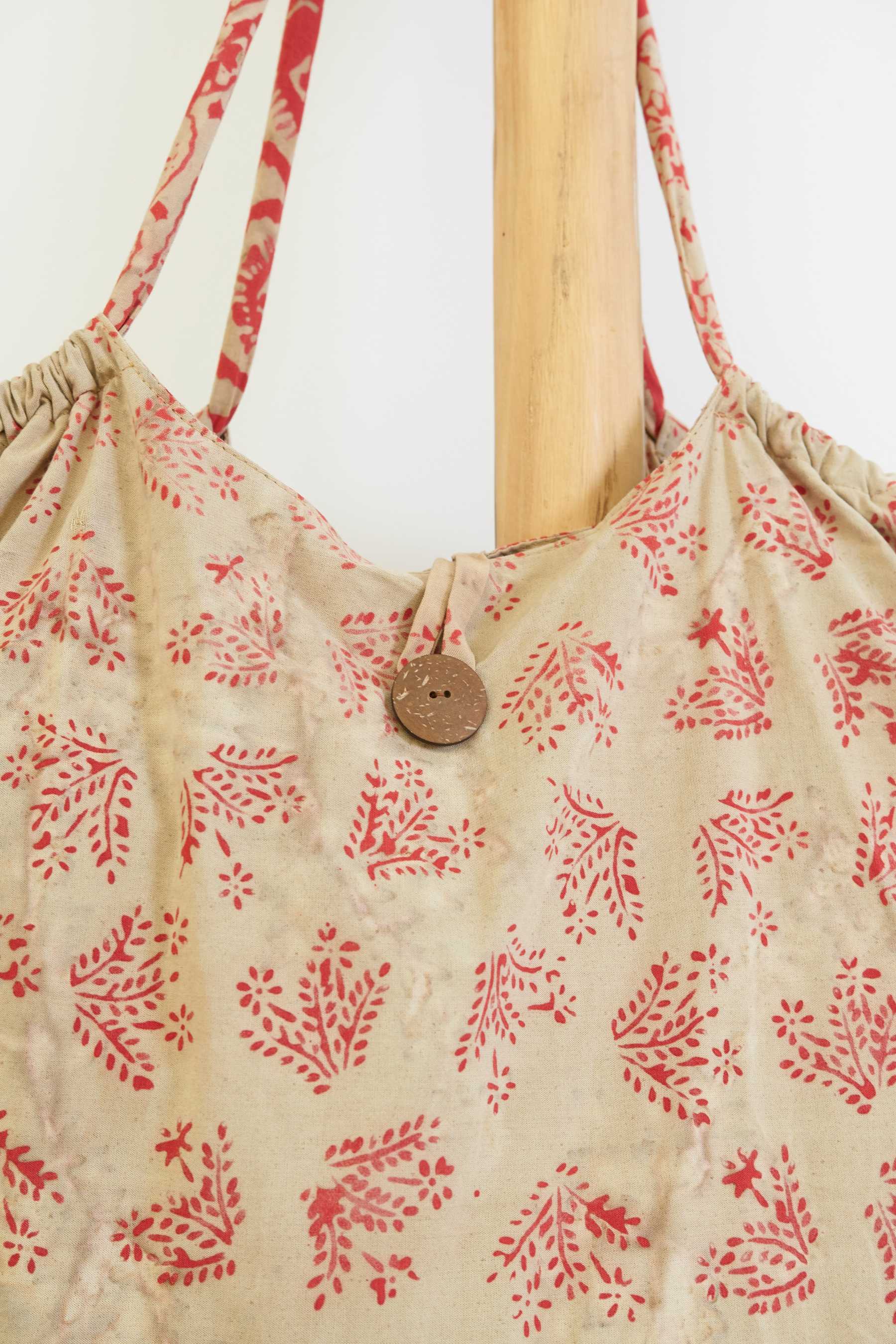 La bolsa de tela estampada de la colección IRENIC a conjunto con las prendas de mujer y niña de la misma colección.