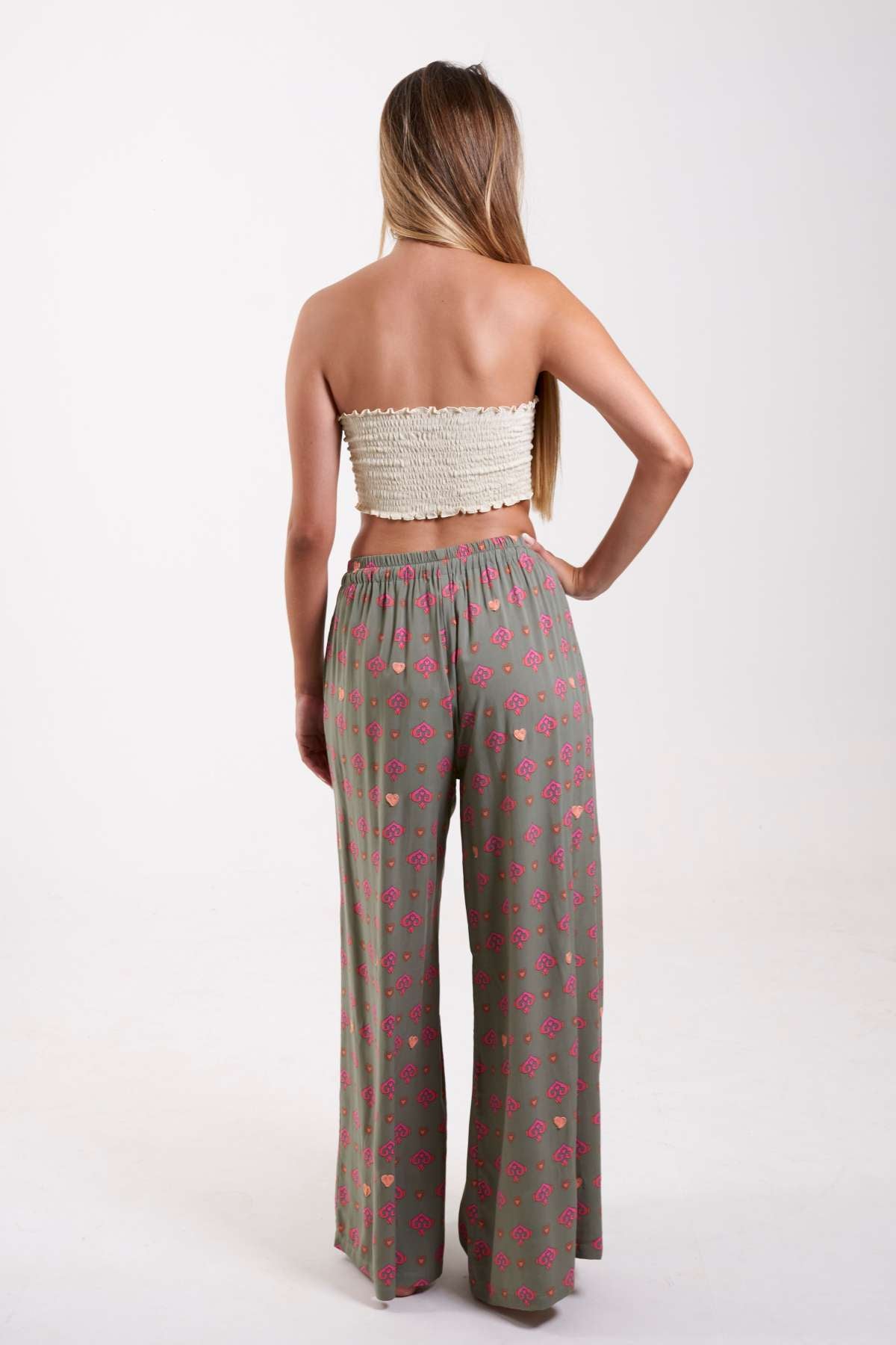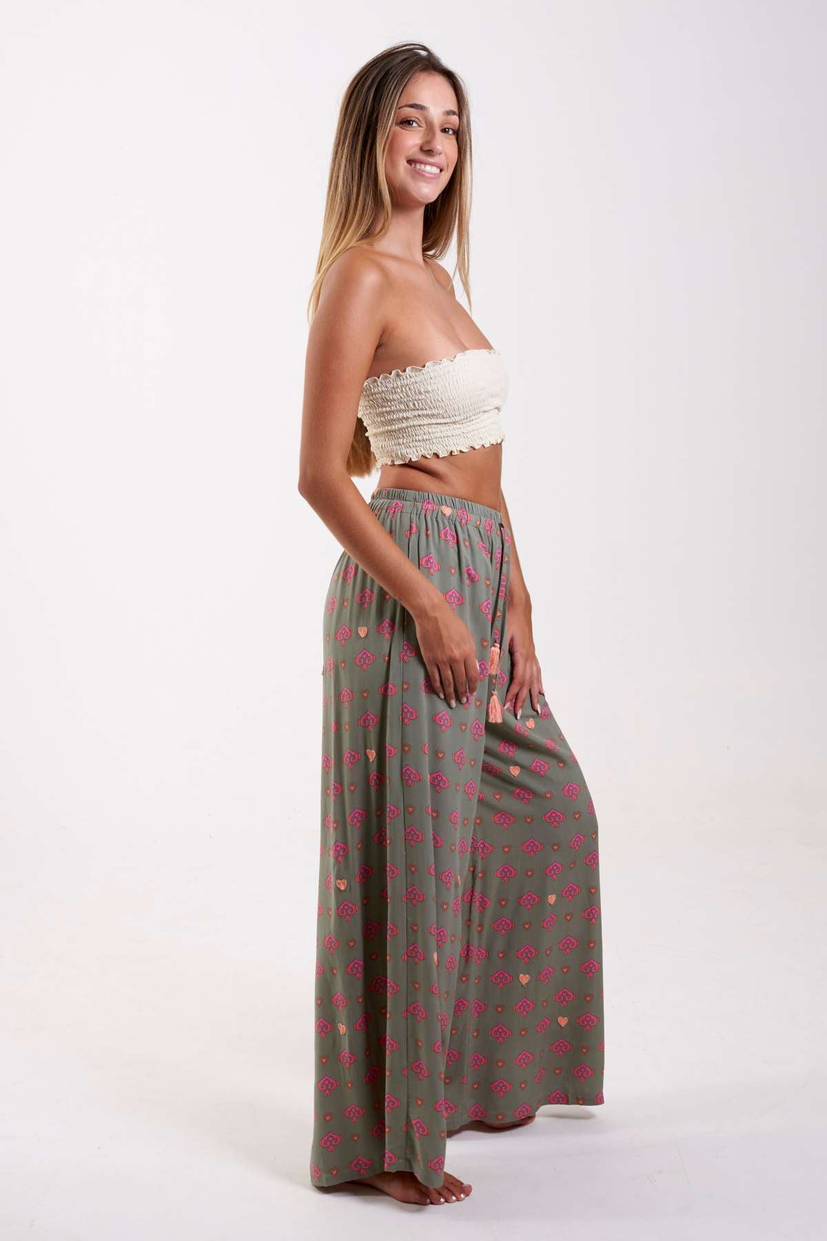 Su corte amplio de pierna ancha y su cintura elástica permiten que el pantalón se adapte suavemente a la silueta sin oprimir, aportando una caída fluida que estiliza y alarga visualmente las piernas.