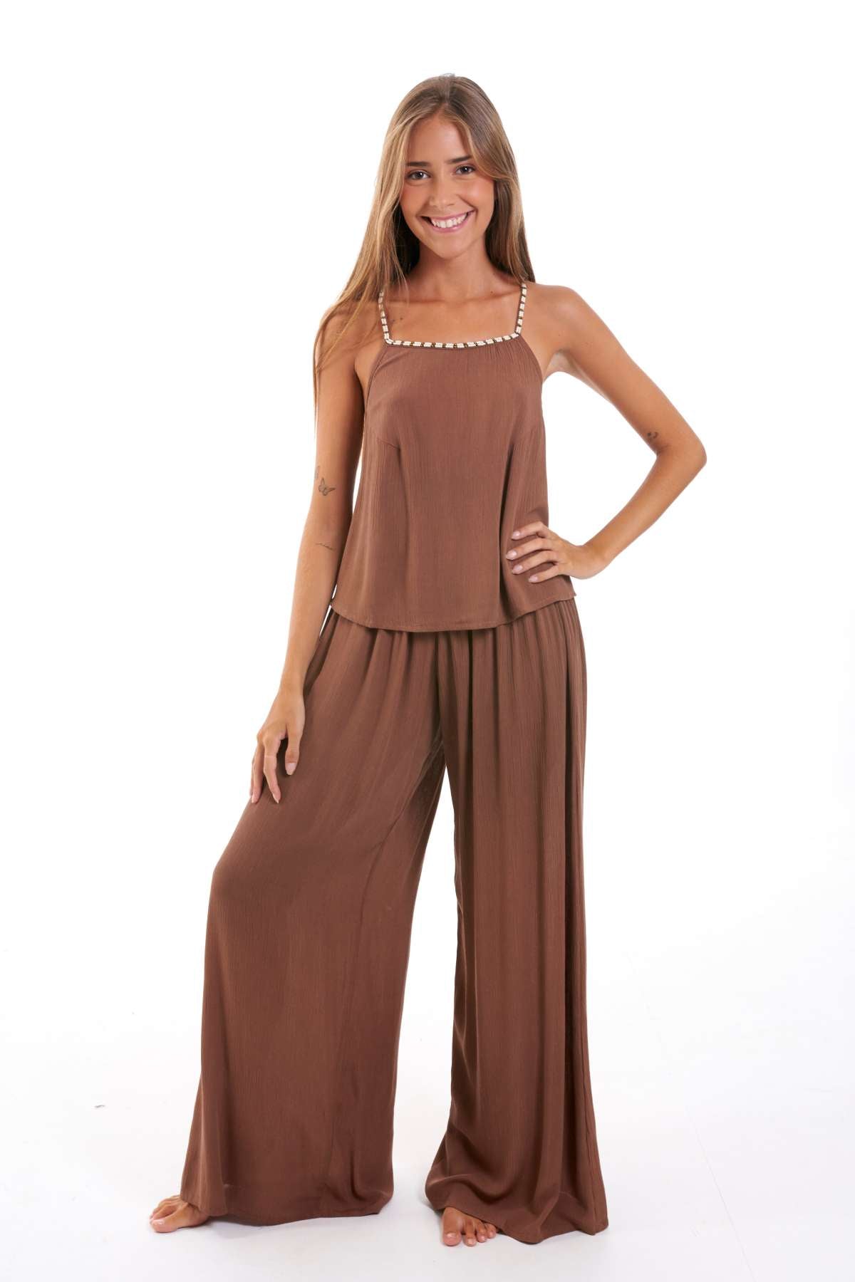 Pantalón largo de silueta fluida y pernera ancha que destaca por su ligereza y movimiento. Una prenda cómoda y versátil, perfecta para crear conjuntos coordinados o looks relajados de verano. Ver más ↓
